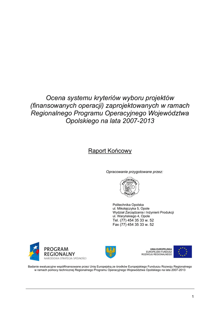 Ocena systemu kryteriów wyboru projektów (finansowanych operacji) zaprojektowanych w ramach Regionalnego Programu Operacyjnego Województwa Opolskiego na lata 2007-2013 Raport Końcowy Opracowanie przygotowane przez: Politechnika Opolska ul. Mikołajczyka 5, Opole Wydział Zarządzania i Inżynierii Produkcji ul. Waryńskiego 4, Opole Tel. (77) 454 35 33 w. 52 Fax (77) 454 35 33 w. 52 Badanie ewaluacyjne współfinansowane przez Unię Europejską ze środków Europejskiego Funduszu Rozwoju Regionalnego w ramach pomocy technicznej Regionalnego Programu Operacyjnego Województwa Opolskiego na lata 2007-2013 1 Ocena systemu kryteriów wyboru projektów (finansowanych operacji) zaprojektowanych w ramach Regionalnego Programu Operacyjnego Województwa Opolskiego na lata 2007-2013 Streszczenie raportu wersja polska CEL, ZAKRES I METODOLOGIA BADANIA Głównym celem badania „Ocena systemu kryteriów wyboru projektów (finansowanych operacji) zaprojektowanych w ramach Regionalnego Programu Operacyjnego Województwa Opolskiego na lata 2007-2013” było dokonanie oceny kryteriów wyboru projektów zaakceptowanych przez Komitet Monitorujący RPO WO 2007-2013 pod kątem zapewnienia skutecznej i najbardziej efektywnej realizacji RPO WO 2007-2013. Realizacja celu głównego badania została dokonana poprzez ocenę jakości przyjętego systemu kryteriów wyboru projektów wyrażoną kardynalną lub porządkową funkcjonalnością, badanego systemu, czyli stopniem i poziomem zapewnienia wyboru optymalnych projektów z punktu widzenia realizacji celów RPO WO 2007-2013. Wnioski z badania zostaną wykorzystane przez Instytucję Zarządzającą przy modyfikacjach i usprawnieniach systemu kryteriów oceny Regionalnego Programu Operacyjnego Województwa Opolskiego na lata 2007-2013. Zakres badania obejmował analizę spójności wewnętrznej programu, w aspekcie koncentrującym się wokół następujących obszarów badawczych powstałych z pogrupowania pytań badawczych: Kryteria oceny formalnej Kryteria oceny merytorycznej (I i II stopnia) Opinia (generalna) na temat systemu kryteriów oceny Zaproponowana metodologia umożliwiła, zgodnie z ofertą, dokonanie analizy oceny systemu kryteriów wyboru projektów w Regionalnym Programie Operacyjnym Województwa Opolskiego na lata 2007-2013 oraz sformułowanie stosownych rekomendacji. W badaniu zastosowano metody triangulacji technik badawczych i źródeł danych. Połączone zostały różnorodne, komplementarne metody, gwarantujące uzyskanie bezstronnych i wiarygodnych danych. Schemat badania uwzględniał wykorzystanie następujących narzędzi: analizy danych zastanych badania pierwotne: indywidualne wywiady pogłębione wywiady kwestionariuszowe (face to face) wywiady telefoniczne (CATI) analiza SWOT Dzięki takiemu postępowaniu zgromadzono dane zarówno ilościowe, jak i jakościowe oraz dokonano ewaluacji z uwzględnieniem punktu widzenia różnych grup (np. przedstawicieli IZ i IP2, członków Komisji Konkursowej Oceniającej Wnioski o Dofinansowanie Projektów złożonych w ramach RPO WO 2007-2013 i Komitetu Monitorującego RPO WO 2007-2013). Ocena systemu kryteriów wyboru projektów (finansowanych operacji) zaprojektowanych w ramach Regionalnego Programu Operacyjnego Województwa Opolskiego na lata 2007-2013 NAJWAŻNIEJSZE WYNIKI BADANIA I GŁÓWNE REKOMENDACJE Wyniki przeprowadzonych badań wskazują na prawidłowe przeprowadzenie procedury opracowania kryteriów oceny. Wyniki przeprowadzonych wywiadów jednoznacznie wskazały, że jednostka dotrzymała wszelkich wymagań w zakresie ustalania kryteriów oceny oraz sposobu powoływania asesorów i ekspertów do oceny wniosków. W trakcie badania dostrzeżono niemniej niektóre elementy funkcjonującego systemu kryteriów oceny, które mogą zostać zmienione lub udoskonalone. Rekomendacje mają charakter propozycji/ sugestii i mogą zostać wykorzystane przez Zamawiającego do ewentualnych modyfikacji obecnego systemu kryteriów oceny. Względem następujących części ewaluator sformułował stosowne wnioski i rekomendacje skoncentrowane wokół poszczególnych pytań badawczych. Kryteria oceny formalnej Pytanie: Czy przyjęte kryteria formalne w ramach RPO WO 2007-2013 są zgodne z zapisami linii demarkacyjnej przyjętej przez Komitet Koordynujący (KK) NSRO? Przeprowadzając badania źródeł zastanych (desk research) oraz badań z respondentami nie zidentyfikowano braku zgodności pomiędzy zapisami kryteriów oceny formalnej z zapisami linii demarkacyjnej. Niemniej jednak w trakcie prowadzonego badania zwrócono uwagę na problem w interpretacji i stosowaniu dokumentu Linia Demarkacyjna przez wnioskodawców. Dużym problemem według respondentów była prawidłowa identyfikacja czy dany beneficjent może aplikować do danej rundy aplikacyjnej RPO WO 2007- 2013, czy też zgodnie z sugestiami zapisów linii demarkacyjnej oczekiwać na ogłoszenie szczegółowych wytycznych innego programu. Ze względu na liczne wątpliwości ewaluator proponuje zamieszczenie (np. w formie przewodnika internetowego - kwalifikatora wnioskodawcy lub listy sprawdzającej) informacji o tym, jaki wnioskodawca może ubiegać się w ramach określonego działania/ poddziałania. Przedłożenie wnioskodawcom szczegółowych danych w tym zakresie ułatwi możliwość prawidłowego spełnienia wymagań stawianych w ramach linii demarkacyjnej. Pytanie: Czy kryteria formalne są czytelnie, jasno sformułowane i nie budzą wątpliwości potencjalnych beneficjentów? Wyniki badań wskazały na brak jednoznaczności i czytelności w odniesieniu do niektórych zapisów kryteriów oceny formalnej. Takie wnioski nasuwają się po zestawieniu opinii respondentów oraz przeprowadzonej analizie dokumentacji. Wątpliwości odnoszą się do zakresu nazwy kryteriów oraz komentarza/ uzasadnienia im odpowiadającego. Dla poprawienia czytelności, jasności sformułowań proponuje się przyjąć nieco inną formę zapisu tabeli kryte