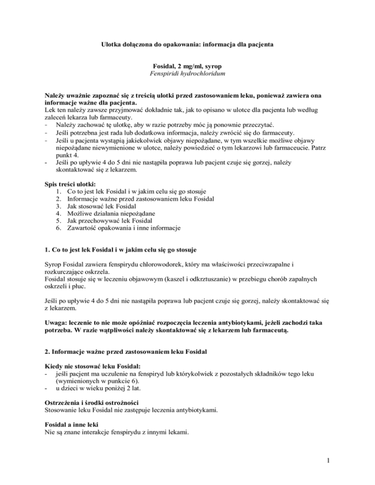 Ulotka dołączona do opakowania: informacja dla pacjenta Fosidal, 2 mg/ml, syrop Fenspiridi hydrochloridum Należy uważnie zapoznać się z treścią ulotki przed zastosowaniem leku, ponieważ zawiera ona informacje ważne dla pacjenta. Lek ten należy zawsze przyjmować dokładnie tak, jak to opisano w ulotce dla pacjenta lub według zaleceń lekarza lub farmaceuty. - Należy zachować tę ulotkę, aby w razie potrzeby móc ją ponownie przeczytać. - Jeśli potrzebna jest rada lub dodatkowa informacja, należy zwrócić się do farmaceuty. - Jeśli u pacjenta wystąpią jakiekolwiek objawy niepożądane, w tym wszelkie możliwe objawy niepożądane niewymienione w ulotce, należy powiedzieć o tym lekarzowi lub farmaceucie. Patrz punkt 4. - Jeśli po upływie 4 do 5 dni nie nastąpiła poprawa lub pacjent czuje się gorzej, należy skontaktować się z lekarzem. Spis treści ulotki: 1. Co to jest lek Fosidal i w jakim celu się go stosuje 2. Informacje ważne przed zastosowaniem leku Fosidal 3. Jak stosować lek Fosidal 4. Możliwe działania niepożądane 5. Jak przechowywać lek Fosidal 6. Zawartość opakowania i inne informacje 1. Co to jest lek Fosidal i w jakim celu się go stosuje Syrop Fosidal zawiera fenspirydu chlorowodorek, który ma właściwości przeciwzapalne i rozkurczające oskrzela. Fosidal stosuje się w leczeniu objawowym (kaszel i odkrztuszanie) w przebiegu chorób zapalnych oskrzeli i płuc. Jeśli po upływie 4 do 5 dni nie nastąpiła poprawa lub pacjent czuje się gorzej, należy skontaktować się z lekarzem. Uwaga: leczenie to nie może opóźniać rozpoczęcia leczenia antybiotykami, jeżeli zachodzi taka potrzeba. W razie wątpliwości należy skontaktować się z lekarzem lub farmaceutą. 2. Informacje ważne przed zastosowaniem leku Fosidal Kiedy nie stosować leku Fosidal: - jeśli pacjent ma uczulenie na fenspiryd lub którykolwiek z pozostałych składników tego leku (wymienionych w punkcie 6). - u dzieci w wieku poniżej 2 lat. Ostrzeżenia i środki ostrożności Stosowanie leku Fosidal nie zastępuje leczenia antybiotykami. Fosidal a inne leki Nie są znane interakcje fenspirydu z innymi lekami. 1 Należy jednak zachować ostrożność stosując lek Fosidal równocześnie z: - barbituranami (lekami o działaniu nasennym, uspokajającym, przeciwdrgawkowym), - lekami przeciwhistaminowymi (leki o działaniu przeciwalergicznym), - lekami uspokajającymi, - lekami przeciwbólowymi (w tym opioidowymi lekami przeciwbólowymi), - inhibitorami monoaminooksydazy (leki stosowane w leczeniu depresji), - alkoholem. W razie wątpliwości należy skontaktować się z lekarzem lub farmaceutą. Fosidal z jedzeniem i piciem Syrop Fosidal należy podawać bezpośrednio przed posiłkami. Ciąża i karmienie piersią Jeśli pacjentka jest w ciąży lub karmi piersią, przypuszcza że może być w ciąży lub gdy planuje mieć dziecko, powinna poradzić się lekarza lub farmaceuty przed zastosowaniem tego leku. Nie zaleca się stosowania leku Fosidal w czasie ciąży oraz u kobiet w wieku rozrodczym niestosujących skutecznej metody antykoncepcji. Leku Fosidal nie należy stosować w okresie karmienia piersią. Prowadzenie pojazdów i obsługiwanie maszyn Nie należy prowadzić pojazdów ani obsługiwać maszyn, ponieważ lek Fosidal może powodować senność, co może zaburzać zdolność prowadzenia pojazdów i obsługiwania maszyn. Fosidal zawiera sacharozę, metylu parahydroksybenzoesan, propylu parahydroksybenzoesan, żółcień pomarańczową, glicerol. - 5 ml syropu zawiera 3 g sacharozy (co stanowi 0,25 jednostek chlebowych). Należy to wziąć pod uwagę u pacjentów z cukrzycą. Jeżeli stwierdzono wcześniej u pacjenta nietolerancję niektórych cukrów, pacjent powinien skontaktować się z lekarzem przed przyjęciem leku. - Lek Fosidal zawiera substancje konserwujące (metylu parahydroksybenzoesan i propylu parahydroksybenzoesan) oraz barwnik (żółcień pomarańczową), które mogą powodować reakcje alergiczne (możliwe reakcje typu późnego). - Lek Fosidal zawiera glicerol, który może powodować ból głowy, zaburzenia żołądkowe i biegunkę. 3. Jak stosować lek Fosidal Ten lek należy zawsze stosować dokładnie tak, jak to opisano w ulotce dla pacjenta lub według zaleceń lekarza lub farmaceuty. W razie wątpliwości należy zwrócić się do lekarza lub farmaceuty. Do opakowania dołączona jest łyżka miarowa lub strzykawka doustna. Dawkowanie: Zazwyczaj stosowana dawka leku Fosidal, to: Dzieci w wieku powyżej 2 lat: 4 mg/kg masy ciała na dobę, tj.: - o masie ciała poniżej 10 kg: od 10 do 20 ml syropu na dobę w dawkach podzielonych; - o masie ciała powyżej 10 kg: od 30 do 60 ml syropu na dobę w dawkach podzielonych. Dorośli: 45 do 90 ml syropu na dobę w dawkach podzielonych. W razie wątpliwości należy skontaktować się z lekarzem lub farmaceutą. 2 Jeśli po upływie 4 do 5 dni nie nastąpiła poprawa lub pacjent czuje się gorzej, należy skontaktować się z lekarzem. Zastosowanie większej niż zalecana dawki leku Fosidal W przypadku zastosowania większej niż zalecana dawki leku Fosidal należy jak najszybciej skonsultować się z lekarzem lub oddziałem ratunkowym. Objawami przedawkowania mogą być: senność lub pobudzenie, nudności, wymioty, przyspieszenie czynności serca. Leczenie zatrucia polega na wykonaniu płukania żołądka i monitorowaniu czynności serca. Pominięcie zastosowania leku Fosidal W przypadku pominięcia jednej dawki leku należy ją przyjąć tak szybko, jak jest to możliwe, chyba że zbliża się pora przyjęcia kolejnej dawki leku. Nie należy stosować dawki podwójnej w celu uzupełnienia pominiętej dawki. W razie jakichkolwiek dalszych wątpliwości związanych ze stosowaniem tego leku, należy zwrócić się do lekarza lub farmaceuty. 4. Możliwe działania niepożądane Jak każdy lek, lek ten może powodować działania niepożądane, chociaż nie u każdego one wystąpią. Mogą 