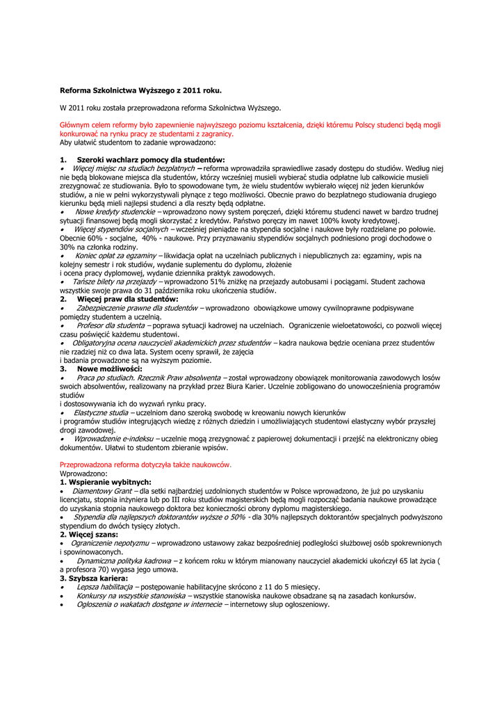 Reforma Szkolnictwa Wyższego z 2011 roku. W 2011 roku została przeprowadzona reforma Szkolnictwa Wyższego. Głównym celem reformy było zapewnienie najwyższego poziomu kształcenia, dzięki któremu Polscy studenci będą mogli konkurować na rynku pracy ze studentami z zagranicy. Aby ułatwić studentom to zadanie wprowadzono: 1. Szeroki wachlarz pomocy dla studentów: Więcej miejsc na studiach bezpłatnych – reforma wprowadziła sprawiedliwe zasady dostępu do studiów. Według niej nie będą blokowane miejsca dla studentów, którzy wcześniej musieli wybierać studia odpłatne lub całkowicie musieli zrezygnować ze studiowania. Było to spowodowane tym, że wielu studentów wybierało więcej niż jeden kierunków studiów, a nie w pełni wykorzystywali płynące z tego możliwości. Obecnie prawo do bezpłatnego studiowania drugiego kierunku będą mieli najlepsi studenci a dla reszty będą odpłatne. Nowe kredyty studenckie – wprowadzono nowy system poręczeń, dzięki któremu studenci nawet w bardzo trudnej sytuacji finansowej będą mogli skorzystać z kredytów. Państwo poręczy im nawet 100% kwoty kredytowej. Więcej stypendiów socjalnych – wcześniej pieniądze na stypendia socjalne i naukowe były rozdzielane po połowie. Obecnie 60% - socjalne, 40% - naukowe. Przy przyznawaniu stypendiów socjalnych podniesiono progi dochodowe o 30% na członka rodziny. Koniec opłat za egzaminy – likwidacja opłat na uczelniach publicznych i niepublicznych za: egzaminy, wpis na kolejny semestr i rok studiów, wydanie suplementu do dyplomu, złożenie i ocena pracy dyplomowej, wydanie dziennika praktyk zawodowych. Tańsze bilety na przejazdy – wprowadzono 51% zniżkę na przejazdy autobusami i pociągami. Student zachowa wszystkie swoje prawa do 31 października roku ukończenia studiów. 2. Więcej praw dla studentów: Zabezpieczenie prawne dla studentów – wprowadzono obowiązkowe umowy cywilnoprawne podpisywane pomiędzy studentem a uczelnią. Profesor dla studenta – poprawa sytuacji kadrowej na uczelniach. Ograniczenie wieloetatowości, co pozwoli więcej czasu poświęcić każdemu studentowi. Obligatoryjna ocena nauczycieli akademickich przez studentów – kadra naukowa będzie oceniana przez studentów nie rzadziej niż co dwa lata. System oceny sprawił, że zajęcia i badania prowadzone są na wyższym poziomie. 3. Nowe możliwości: Praca po studiach. Rzecznik Praw absolwenta – został wprowadzony obowiązek monitorowania zawodowych losów swoich absolwentów, realizowany na przykład przez Biura Karier. Uczelnie zobligowano do unowocześnienia programów studiów i dostosowywania ich do wyzwań rynku pracy. Elastyczne studia – uczelniom dano szeroką swobodę w kreowaniu nowych kierunków i programów studiów integrujących wiedzę z różnych dziedzin i umożliwiających studentowi elastyczny wybór przyszłej drogi zawodowej. Wprowadzenie e-indeksu – uczelnie mogą zrezygnować z papierowej dokumentacji i przejść na elektroniczny obieg dokumentów. Ułatwi to studentom zbieranie wpisów. Przeprowadzona reforma dotyczyła także naukowców. Wprowadzono: 1. Wspieranie wybitnych: Diamentowy Grant – dla setki najbardziej uzdolnionych studentów w Polsce wprowadzono, że już po uzyskaniu licencjatu, stopnia inżyniera lub po III roku studiów magisterskich będą mogli rozpocząć badania naukowe prowadzące do uzyskania stopnia naukowego doktora bez konieczności obrony dyplomu magisterskiego. Stypendia dla najlepszych doktorantów wyższe o 50% - dla 30% najlepszych doktorantów specjalnych podwyższono stypendium do dwóch tysięcy złotych. 2. Więcej szans: Ograniczenie nepotyzmu – wprowadzono ustawowy zakaz bezpośredniej podległości służbowej osób spokrewnionych i spowinowaconych. Dynamiczna polityka kadrowa – z końcem roku w którym mianowany nauczyciel akademicki ukończył 65 lat życia ( a profesora 70) wygasa jego umowa. 3. Szybsza kariera: Lepsza habilitacja – postępowanie habilitacyjne skrócono z 11 do 5 miesięcy. Konkursy na wszystkie stanowiska – wszystkie stanowiska naukowe obsadzane są na zasadach konkursów. Ogłoszenia o wakatach dostępne w internecie – internetowy słup ogłoszeniowy. Reforma szkolnictwa wyższego dotyczyła również uczelni. Wprowadzono: 1. Więcej środków: Coraz więcej pieniędzy na naukę – zwiększono budżet na naukę w szkolnictwie wyższym 16 miliardów złotych na laboratoria i ośrodki naukowe – pozyskiwanie pieniędzy z Unii Europejskiej Promocja najważniejszych kierunków dla państwa – wprowadzono listę kierunków studiów, które mają strategiczne znaczenie dla państwa. Są to między innymi informatyka, biotechnologia, ochrona środowiska, matematyka. Większe finansowanie spoza budżetu – wprowadzono zachęty do współfinansowania sektora nauki ze źródeł pozabudżetowych. 2. Lepsze zarządzanie: Wspomaganie najlepszych – krajowe Naukowe Ośrodki Wiodące – najlepszym ośrodkom przyznawane jest pięcioletnie dofinansowanie. Programy studiów tworzone wspólnie z pracodawcami – włączanie przedstawicieli biznesu i przemysłu w tworzenie programu studiów, jego realizacji oraz oceny wyników. Na kierunkach zawodowych i technicznych zajęcia mogą prowadzić osoby pracujące w przemyśle. Rektor z wyboru lub konkursu – ustanowiono alternatywne metody powołania rektora – wybory lub konkurs. Większe uprawnienia dla rektora – rektorom przyznano większą możliwość zarządzania kadrami, większy wpływ na tworzenie programu studiów, struktury administracyjnej uczelni i zarządzanie jej mieniem. Zachęty do tworzenia spółek spin-off – tworzone spółki są oparte na innowacyjnej technologii lub wynalazku opracowanym na uczelni. Udziałowcami mogą być naukowcy jak i sama uczelnia. Komercjalizacja wyników badań – opracowano specjalny przewodnik mający na celu pomoc w komercjalizacji wyników, organizacja specjalnych szkoleń i staży.