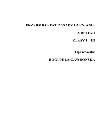 PRZEDMIOTOWE ZASADY OCENIANIA Z RELIGII KLASY I – III Opracowała: BOGUMIŁA GAWROŃSKA Ocenę z religii ustalamy w oparciu o kryteria poznawcze, kształcące i wychowawcze. W ocenianiu z religii obowiązują poniższe zasady: 1. Obiektywność – zastosowanie jednolitych norm i kryteriów oceniania. 2. Jawność – podawanie na bieżąco wyników pracy ucznia (systematyczne wpisy do dziennika). 3. Instruktywność – wskazanie na występujące braki. I. Obszary oceniania: 1. Mówienie. 2. Zainteresowanie przedmiotem. 3. Czytanie. 4. Słuchanie. 5. Umiejętność zastosowania poznanych wiadomości w życiu. 6. Postawa. 7. Pisanie. 8. Aktywność. 9. Praca domowa. II. Formy i częstotliwość oceniania aktywności ucznia: • Wypowiedzi ustne – 3 razy w okresie • Prace pisemne – kartkówki z ostatniej lekcji – 3 razy w okresie (tylko III klasa) • Prace domowe – dowód pracy własnej ucznia (wg potrzeb, minimum raz w okresie) • Praca na katechezie – oceniana przez nauczyciela plusami (3 plusy = ocena bardzo dobra) • Przygotowanie do katechezy – uczeń powinien mieć podręcznik, ćwiczenia i potrzebne przybory szkolne – zeszyt ćwiczeń sprawdzany na ocenę jeden raz w okresie (uczeń ma obowiązek uzupełnić zaległe tematy podczas swojej nieobecności w szkole) • Prace dodatkowe dla chętnych – dwa razy w okresie lub wg potrzeb. • Uczeń otrzymuje minus za brak pracy domowej (3 minusy – uczeń otrzymuje ocenę niedostateczną) III. Kryteria oceniania poszczególnych form: - Mówienie: reagowanie werbalne na proste polecenia nauczyciela; recytowanie modlitw, tekstów liturgicznych, śpiewanie pieśni nazywanie rzeczy liturgicznych przedstawionych na kartach, plakatach - Słuchanie: reagowanie werbalnie i niewerbalnie na proste polecenia nauczyciela rozpoznawanie zwrotów kościelnych i stosowanych na co dzień, umiejętność posługiwania się nimi rozumienie ogólnego sensu krótkich tekstów biblijnych - Czytanie: czytanie ze zrozumieniem wyrazów i prostych zdań umiejętność znalezienia konkretnej informacji w tekście umiejętność korzystania z Pisma Świętego - Pisanie: przepisywanie wyrazów i prostych zdań IV. Sposób uzasadniania oceny bieżącej i przekazywania uczniowi: - Prace pisemne (kartkówki) oceniane są według skali punktowej określonej przez nauczyciela i przeliczane są skalą procentową odpowiadającą skali ocen: 100% - 90% - Bardzo dobry (5) 89% - 75% - Dobry (4) 74% - 50% - Dostateczny (3) 49% - 30% - Dopuszczający (2) 29% - 0 % - Niedostateczny (1) Ocenianie bieżące ma na celu monitorowanie pracy ucznia oraz przekazywaniu mu informacji o jego osiągnięciach edukacyjnych i ma formę stopnia wraz z komentarzem (ustnym lub pisemnym), w którym nauczyciel wskazuje, co uczeń robi dobrze, co i jak wymaga poprawy oraz jak powinien dalej się uczyć. V. Zasady ustalania oceny śródrocznej (rocznej). Ocenie podlegają: • wiadomości i umiejętności związane z realizowanym programem w klasie I, II i III • kartkówki • odpowiedzi ustne • aktywność na lekcji • prace domowe • zeszyt ćwiczeń • udział w konkursach • przygotowanie do katechezy • praca na katechezie Oceny wyrażone w stopniach dzielą się na: • cząstkowe, określające poziom wiadomości i umiejętności ucznia ze zrealizowanej części programu • okresowe i roczne, określające ogólny poziom wiadomości i umiejętności ucznia przewidzianych w programie nauczania na dany rok szkolny Ocena śródroczna i roczna nie jest średnią arytmetyczną ocen cząstkowych, ale oceną wiedzy, systematycznej pracy, zaangażowania ucznia oraz postawy na katechezie. Przed posiedzeniem klasyfikacyjnej Rady Pedagogicznej nauczyciel informuje uczniów o przewidywanej ocenie z przedmiotu. VI. Szczegółowe wymagania edukacyjne: Kl. I Uczeń: - ze zrozumieniem wykonuje znak krzyża, - umie modlitwę Ojcze nasz…, Zdrowaś Maryjo… (w zależności od możliwości dziecka z pomocą lub bez pomocy katechety) - umie pozdrowienie chrześcijańskie: Niech będzie pochwalony Jezus Chrystus..., Szczęść Boże, - poprawnie posługuje się dialogami i gestami stosowanymi w liturgii słowa, - umie teksty pieśni i piosenek zaplanowanych przez katechetę, - potrafi sformułować prostą modlitwę prośby do Boga i świętych - zna postawy i gesty w czasie modlitwy, - zna z Pisma Świętego scenę Zwiastowania, Bożego Narodzenia - umie wymienić kilku świętych (Maryję, św. Józefa itp.) - prowadzi zeszyt ćwiczeń na miarę swoich możliwości - umie wskazać tabernakulum, lampkę wieczną, ołtarz, ambonę, konfesjonał - umie powiedzieć do czego służy chrzcielnica, - umie powiedzieć kto stworzył świat - umie, że Maryja jest Matką Jezusa i wszystkich ludzi, że trzeba Ją czcić i kochać, - umie, że Pismo Święte jest listem Boga do człowieka, Kl. II Uczeń: – umie szanować Pismo Święte, – potrafi powiedzieć, co Bóg uczynił dla nas przez Jezusa Chrystusa, – potrafi opowiedzieć o niektórych postaciach z Pisma Świętego, np. Mojżeszu, Najświętszej Maryi Pannie, Janie Chrzcicielu (zgodnie z podręcznikiem ucznia), – zna przypowieść o synu marnotrawnym, – potrafi opowiedzieć o Bożym Narodzeniu i tradycjach bożonarodzeniowych, – potrafi wskazać obecność Boga Stwórcy w pięknie przyrody, – potrafi pozdrowić Najświętszy Sakrament, – umie powtórzyć formuły liturgii słowa przed i po czytaniu Pisma Świętego, - potrafi powiedzieć modlitwy: Ojcze nasz, Zdrowaś Mario, Chwała Ojcu, Święty, Święty, Baranku Boży) – potrafi powtórzyć akt wiary, nadziei, miłości, żalu, – potrafi powtórzyć i wyjaśnić dziesięć przykazań Bożych, – potrafi powtórzyć i wyjaśnić przykazania miłości, – potrafi ułożyć prostą modlitwę, – potrafi śpiewać (np. w grupie) wybrane pieśni, – potrafi wymienić siedem sakramentów świętych, siedem grzechów głównych – potrafi wskazać w koście