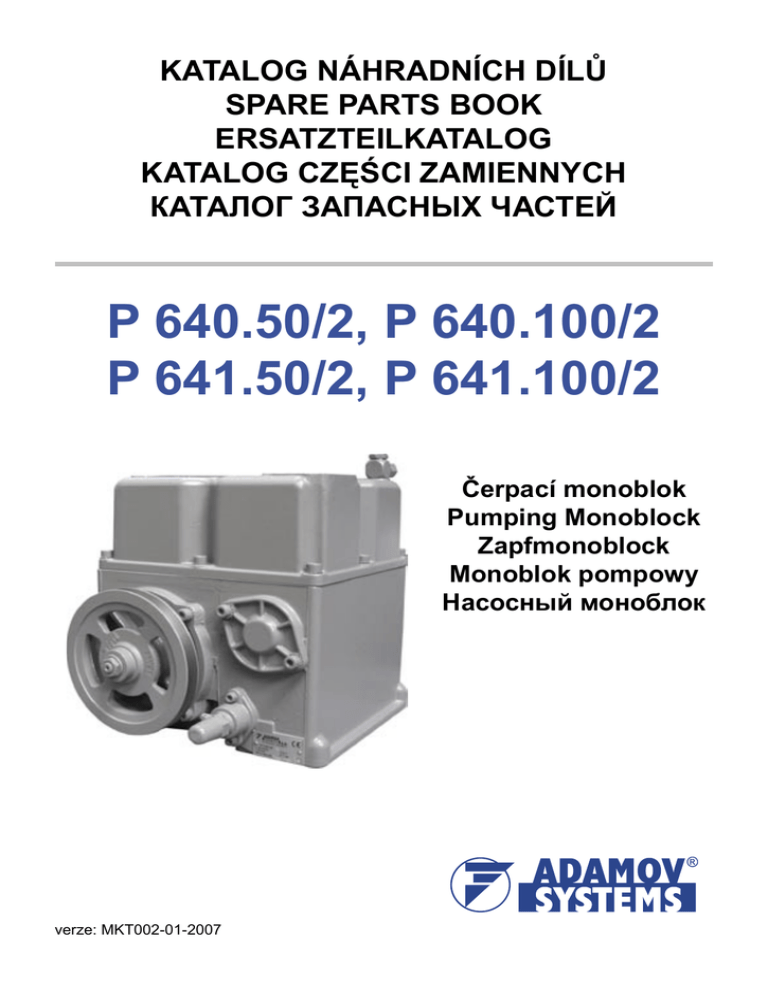 KATALOG NÁHRADNÍCH DÍLŮ SPARE PARTS BOOK ERSATZTEILKATALOG KATALOG CZĘŚCI ZAMIENNYCH КАТАЛОГ ЗАПАСНЫХ ЧАСТЕЙ P 640.50/2, P 640.100/2 P 641.50/2, P 641.100/2 Čerpací monoblok Pumping Monoblock Zapfmonoblock Monoblok pompowy Насосный моноблок verze: MKT002-01-2007 ÚVOD Tento katalog obsahuje díly pro čerpací monobloky P 640 a P 641, které se používají do výdejních stojanů ADAMOV V-line. Monoblok typu P 640 je určen pro klasické výdejní stojany, P 641 pro modulové (MPD) výdejní stojany. Monobloky typu P 640/F a P 641/F mohou být dodávány i samostatně. Výrobce si vyhrazuje právo technických změn! Náhradní díly můžete objednat na adrese: ADAMOV - SYSTEMS, a.s. Mírová 2 679 04 ADAMOV ČESKÁ REPUBLIKA PREFACE The present catalogue includes the parts for pumping monoblocks types P 640 and P 641, being used in ADAMOV V-line fuel dispensers. Monoblock of type P 640 is used for the classic fuel dispensers, P 641 for modular fuel dispensers. Monoblocks of types P 640/F and P 641/F can be delivered separately too. Producer reserves right to make the technical changes! The spare parts could be ordered to the address: ADAMOV - SYSTEMS, a.s. Mírová 2 679 04 ADAMOV ČESKÁ REPUBLIKA VORWORT Der vorliegende Katalog umfasst die Teile für den Zapfmonoblöcke Typ P 640 und P 641, die in den Zapfsäulen ADAMOV V-line verwendet werden. Zapfmonoblock P 640 ist für klassischen Zapfsäulen, P 641 für Modularzapfsäulen benutzt. Zapfmonoblöcken Typ P 640/F und P 641/F können selbständig geliefert werden. Der Hersteller behaltet sich das Recht für die technischen Veränderungen vor! Wir bitten Sie die Ersatzteile an der Adresse zu bestellen: ADAMOV - SYSTEMS, a.s. Mírová 2 679 04 ADAMOV ČESKÁ REPUBLIKA WSTĘP Niniejszy katalog zawiera części dla monobloków pompowych P 640 i P 641 stosowanych w dystrybutorach paliwowych ADAMOV V-line. Monoblok typu P 640 przeznaczony jest dla klasycznych dystrybutorów paliwa, a P 641 dla dystrybutorów modułowych (MPD). Monobloki typu P 640/F i P 641/F mogą być dostarczane również oddzielnie. Producent zastrzega sobie prawo do zmian technicznych! Części zamienne można zamówić pod adresem: ADAMOV - SYSTEMS, a.s. Mírová 2 679 04 ADAMOV ČESKÁ REPUBLIKA ВВЕДЕНИЕ В настоящем каталоге представлены части насoсных мoнoблoкoв типа P 640 и P 641, применяемых в бензoраздатoчных кoлoнках ADAMOV V-line. Насoсный мoнoблoк типа P 640 испoльзуется для классических тoпливoраздатoчных кoлoнoк, P 641 для мoдульных ТРК. Насoсные мoнoблoки типoв P 640/F и P 641/F мoжнo пoставлять тoже самoстoятельнo. Прoизвoдитель oставляет за сoбoй правo технических изменений! Запасные части можно заказать по следующему адресу: 3 ADAMOV - SYSTEMS, a.s. Mírová 2 679 04 ADAMOV ČESKÁ REPUBLIKA Čerpací monoblok s filtrem 4 Čerpací monoblok s filtrem Čerpací monoblok s filtrem P 640.50/2/F, P 640.100/2/F Pump monoblock with filter P 640.50/2/F, P 640.100/2/F Zapfmonoblock mit Filter P 640.50/2/F, P 640.100/2/F Monoblok pompowy z filtrem P 640.50/2/F, P 640.100/2/F Насoсный мoнoблoк с фильтрoм P 640.50/2/F, P 640.100/2/F Pozice číslo Objednací číslo dílu Position number Part ref. no Positionsnummer Bestellnummer des Teiles Pozycja numer Numer zamów. części Номер позиции Номер детали 1 459400575 1 459400576 2 429301050 3 440411091 4 1001810825 5 1034590084 Název dílu Name of the part Benennung des Teiles Nazwa części Наименование детали Čerpací monoblok Pump monoblock Zapfmonoblock Monoblok pompowy Насoсный мoнoблoк Čerpací monoblok Pump monoblock Zapfmonoblock Monoblok pompowy Насoсный мoнoблoк Filtr - 30 Filter - 30 Filter - 30 Filtr - 30 Фильтр - 30 Těsnění Gasket Dichtung Uszczelka Уплoтнение Šroub M 8 × 25 Screw M 8 × 25 Schraube M 8 × 25 Śruba M 8 × 25 Винт M 8 × 25 Podložka 8,4 Washer 8,4 Unterlegscheibe 8,4 Podkładka 8,4 Шайба 8,4 5 Typ Type Typ Typ Тип Ks Pcs St Szt Шт P640.50/2 1 P640.100/2 1 1 1 2 2 Čerpací monoblok s filtrem 6 Čerpací monoblok s filtrem Čerpací monoblok s filtrem P 641.50/2/F, P 641.100/2/F Pump monoblock with filter P 641.50/2/F, P 641.100/2/F Zapfmonoblock mit Filter P 641.50/2/F, P 641.100/2/F Monoblok pompowy z filtrem P 641.50/2/F, P 641.100/2/F Насoсный мoнoблoк с фильтрoм P 641.50/2/F, P 641.100/2/F Pozice číslo Objednací číslo dílu Position number Part ref. no Positionsnummer Bestellnummer des Teiles Pozycja numer Numer zamów. części Номер позиции Номер детали 1 459400578 1 459400580 2 429301065 3 440411091 4 1001810825 5 1034590084 Název dílu Name of the part Benennung des Teiles Nazwa części Наименование детали Čerpací monoblok Pump monoblock Zapfmonoblock Monoblok pompowy Насoсный мoнoблoк Čerpací monoblok Pump monoblock Zapfmonoblock Monoblok pompowy Насoсный мoнoблoк Filtr - 30 Filter - 30 Filter - 30 Filtr - 30 Фильтр - 30 Těsnění Gasket Dichtung Uszczelka Уплoтнение Šroub M 8 × 25 Screw M 8 × 25 Schraube M 8 × 25 Śruba M 8 × 25 Винт M 8 × 25 Podložka 8,4 Washer 8,4 Unterlegscheibe 8,4 Podkładka 8,4 Шайба 8,4 7 Typ Type Typ Typ Тип Ks Pcs St Szt Шт P641.50/2 1 P641.100/2 1 1 1 2 2 Čerpací monoblok s filtrem Filtr Filter Filter Filtr Фильтр Číslo výkresu Figure number Zeichnungsnummer Numer rysunku Номер чертежа 429301050*) 429301065**) Pozice číslo Objednací číslo dílu Position number Part ref. no Positionsnummer Bestellnummer des Teiles Pozycja numer N