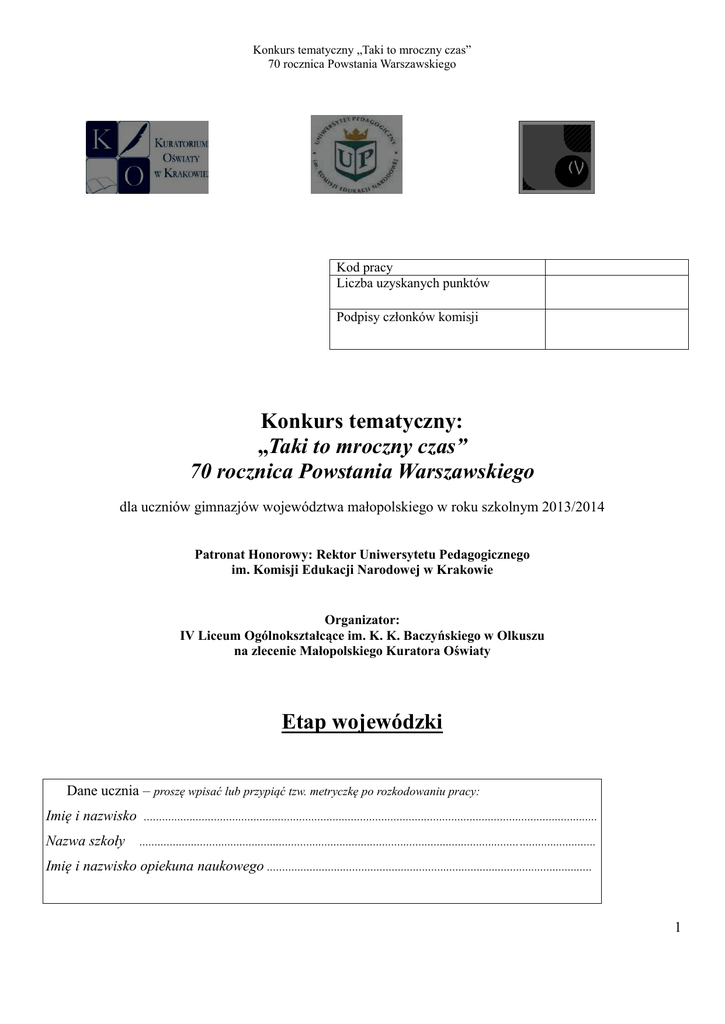 Konkurs tematyczny „Taki to mroczny czas” 70 rocznica Powstania Warszawskiego Kod pracy Liczba uzyskanych punktów Podpisy członków komisji Konkurs tematyczny: „Taki to mroczny czas” 70 rocznica Powstania Warszawskiego dla uczniów gimnazjów województwa małopolskiego w roku szkolnym 2013/2014 Patronat Honorowy: Rektor Uniwersytetu Pedagogicznego im. Komisji Edukacji Narodowej w Krakowie Organizator: IV Liceum Ogólnokształcące im. K. K. Baczyńskiego w Olkuszu na zlecenie Małopolskiego Kuratora Oświaty Etap wojewódzki Dane ucznia – proszę wpisać lub przypiąć tzw. metryczkę po rozkodowaniu pracy: Imię i nazwisko ..................................................................................................................................................... Nazwa szkoły ............................................................................................................................. ......................... Imię i nazwisko opiekuna naukowego ........................................................................................................... 1 Konkurs tematyczny „Taki to mroczny czas” 70 rocznica Powstania Warszawskiego Szanowny Gimnazjalisto! Przed Tobą znajduje się test zawierający 19 zadań konkursowych poświęconych Powstaniu Warszawskiemu. Zanim przystąpisz do udzielania odpowiedzi przeczytaj uważnie pytania. Wykonuj zadania zgodnie z poleceniami. Pamiętaj, pisz wyraźnie oraz nie używaj korektora i ołówka. Staraj się nie popełniać błędów przy zaznaczaniu odpowiedzi, ale jeśli się pomylisz, błędne zaznaczenie otocz kółkiem i zaznacz inną odpowiedź. Powodzenia ☺ Czas trwania testu – 90 minut Maksymalna liczba punktów do zdobycia – 140 2 Konkurs tematyczny „Taki to mroczny czas” 70 rocznica Powstania Warszawskiego Zadanie I. Wskaż jedną prawidłową odpowiedź na poniższe pytania. (0-14 punktów) 1. Plan ostatecznego rozwiązania kwestii żydowskiej powstał w: a. styczniu 1941 r. b. styczniu 1942 r. c. styczniu 1943 r. 2. a. b. c. Plan ostatecznego rozwiązania kwestii żydowskiej został podpisany w: Wannsee Monachium Lipsku 3. a. b. c. Dystrykt galicyjski został powołany w: 1939 r. 1940 r. 1941 r. 4. a. b. c. Generalny Plan Wschodni na Zamojszczyźnie Niemcy realizowali: od jesieni 1942 r. od jesieni 1943 r. od jesieni 1944 r. 5. Kurier Rządu Emigracyjnego na spotkaniu KG AK w lipcu przekazał stanowisko władz dotyczące przygotowań do powstania. Był to: a. Stefan Korboński b. Jan Nowak-Jeziorański c. Tomasz Arciszewski 6. a. b. c. Powstanie warszawskie trwało 63 dni w okresie: 1 sierpnia – 2 października 1942 r. 1 sierpnia – 2 października 1943 r. 1 sierpnia – 2 października 1944 r. 7. a. b. c. Akt kapitulacji powstania warszawskiego podpisano w: Konstancinie Ożarowie Modlinie 8. a. b. c. W trakcie powstanie oddziały SS rozstrzelały ok. 40 tys. mieszkańców: Mokotowa Śródmieścia Woli 9. a. b. c. Po upadku Żoliborza w dniu 30 września samotnie walczyła część: Czerniakowa Mokotowa Śródmieścia 3 Konkurs tematyczny „Taki to mroczny czas” 70 rocznica Powstania Warszawskiego 10. Na czele Kedywu (Kierownictwa Dywersji) od listopada 1943 r. stał: a. gen. Stefan Grot-Rowecki b. gen. Tadeusz Bór-Komorowski c. płk August Emil Fieldorf- Nil 11. Sonderaktion Krakau polegała na: a. aresztowaniu profesorów krakowskich uczelni i wywiezieniu ich do niemieckich obozów koncentracyjnych b. walce Niemców z polską inteligencją c. gospodarczym eksploatowaniu ziemi krakowskiej 12. Niemiecka polityka Lebensraum polegała m.in. na: a. utworzeniu państw satelickich sprzymierzonych z III Rzeszą b. utworzeniu na okupowanych przez Sowietów ziemiach polskich autonomicznego obszaru c. wysiedlaniu Polaków z włączonych do III Rzeszy ziem polskich i sprowadzaniu w ich miejsce niemieckich osadników 13. Jednym z celów akcji „Burza” była: a. ochrona ludności polskiej na Ukrainie i Wołyniu przed Ukraińcami b. podkreślenie woli walki Polskiego Państwa Podziemnego z Niemcami i przekonanie Sowietów do uznania polskich praw do obszarów po obu stronach linii Curzona c. przekonanie Sowietów do zmiany polityki wobec Polskiego Państwa Podziemnego 14. Podczas konferencji jałtańskiej ustalono, że: a. powołany zostanie polski rząd, w którym dominować będą przedstawiciele niekomunistycznego podziemia niepodległościowego b. powstanie polski rząd tymczasowy, który uzyska akceptację trzech mocarstw c. w skład państwa polskiego wejdą wszystkie ziemie włączone do Związku Sowieckiego po agresji 17 września Zadanie II. Uszereguj chronologicznie podane poniżej wydarzenia wpisując je do tabel, zaczynając od tego, które było najwcześniejsze. (0-3 punkty) a) wydarzenia: a) układ Sikorski-Majski b) powstanie ZWZ c) powstanie rządu PKWN d) zamordowanie jeńców polskich w Katyniu przez Sowietów e) wybuch Powstania Warszawskiego 4 Konkurs tematyczny „Taki to mroczny czas” 70 rocznica Powstania Warszawskiego Kolejność wydarzeń 1 2 3 4 5 b) wydarzenia: a) agresja Niemiec na ZSRR d) niemiecko-sowiecki układ o granicach b) zawarcie polsko-radzieckiego układu o nieagresji e) ewakuacja żołnierzy i cywilów polskich ze Związku Sowieckiego pod dowództwem gen. Andersa c) I transport jeńców polskich do obozu Auschwitz Kolejność wydarzeń 1 2 3 4 5 c) wydarzenia: a) utworzenie KRN d) Testament Polski Walczącej b) powstanie Generalnego Gubernatorstwa e) odkrycie grobów jeńców polskich w Katyniu c) proces szesnastu przywódców Polskiego Państwa Podziemnego w Moskwie Kolejność wydarzeń 1 2 3 4 5 5 Konkurs tematyczny „Taki to mroczny czas” 70 rocznica Powstania Warszawskiego Zadanie III. Przeczytaj zamieszczony poniżej tekst źródłowy, a następnie odpowiedz na pytania. (0-4 punkty) „Chcemy, by pan powiedział polskiemu rządowi, rządom i czołowym przywódcom alianckim, że jesteśmy bezsilni wobec niemieckich zbrodniarzy. Nie możemy si