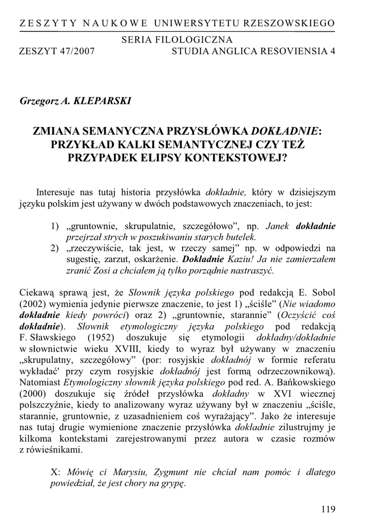 Z E S Z Y T Y N A U K O W E UNIWERSYTETU RZESZOWSKIEGO ZESZYT 47/2007 SERIA FILOLOGICZNA STUDIA ANGLICA RESOVIENSIA 4 Grzegorz A. KLEPARSKI ZMIANA SEMANYCZNA PRZYSŁÓWKA DOKŁADNIE: PRZYKŁAD KALKI SEMANTYCZNEJ CZY TE PRZYPADEK ELIPSY KONTEKSTOWEJ? Interesuje nas tutaj historia przysłówka dokładnie, który w dzisiejszym jzyku polskim jest uywany w dwóch podstawowych znaczeniach, to jest: 1) „gruntownie, skrupulatnie, szczegółowo”, np. Janek dokładnie przejrzał strych w poszukiwaniu starych butelek. 2) „rzeczywicie, tak jest, w rzeczy samej” np. w odpowiedzi na sugesti, zarzut, oskarenie. Dokładnie Kaziu! Ja nie zamierzałem zrani$ Zosi a chciałem j! tylko porz!dnie nastraszy$. Ciekaw% spraw% jest, e Słownik jzyka polskiego pod redakcj% E. Sobol (2002) wymienia jedynie pierwsze znaczenie, to jest 1) „cile” (Nie wiadomo dokładnie kiedy powróci) oraz 2) „gruntownie, starannie” (Oczy"ci$ co" dokładnie). Słownik etymologiczny jzyka polskiego pod redakcj% F. Sławskiego (1952) doszukuje si etymologii dokładny/dokładnie w słownictwie wieku XVIII, kiedy to wyraz był uywany w znaczeniu „skrupulatny, szczegółowy” (por: rosyjskie dokładnój w formie referatu wykłada' przy czym rosyjskie dokładnój jest form% odrzeczownikow%). Natomiast Etymologiczny słownik jzyka polskiego pod red. A. Bakowskiego (2000) doszukuje si &ródeł przysłówka dokładny w XVI wiecznej polszczy&nie, kiedy to analizowany wyraz uywany był w znaczeniu „cile, starannie, gruntownie, z uzasadnieniem co wyraaj%cy”. Jako e interesuje nas tutaj drugie wymienione znaczenie przysłówka dokładnie zilustrujmy je kilkoma kontekstami zarejestrowanymi przez autora w czasie rozmów z rówienikami. X: Mówi ci Marysiu, Zygmunt nie chciał nam pomóc i dlatego powiedział, (e jest chory na gryp. 119 Y: Dokładnie! Nie martw si, we#miemy paru ruskich to pokryj! nam dach na oborze za pół ceny. X: Albo nic nie rozumiesz albo udajesz, (e nie rozumiesz. Chodzi o to, (eby"my płacili mniejsze podatki, droga (ono! Y: Dokładnie! I dlatego musimy zacz!$ rozlicza$ si z urzdem podatkowym razem, a nie osobno, drogi m(u. X: Nie chodzi o to, (eby"my zaoszczdzili jak najwicej tylko o to, (eby"my mieli wakacje na jakie sobie naprawd zasłu(yli"my, Kaziu! Y: Dokładnie! I dlatego przesta)my rozmawia$ o cenach a zacznijmy cieszy$ si, (e jeste"my dwa tygodnie na Bermudach. X: Ostatnie doniesienia prasowe z parlamentu "wiadcz!, (e nie wszyscy posłowie powinni tam zasiada$. Y: Dokładnie! Cz"$ posłów nie spełnia swoich obowi!zków i dba jedynie o własn! karier. X: Mimo ci(kiej pracy nigdy nie mo(na by$ pewnym, (e nasze starania zostan! docenione. Y: Tak, dokładnie! Taka jest rzeczywisto"$, niestety. Zauwamy, e uycie przysłówka dokładnie w znaczeniu „w rzeczy samej, tak jest, rzeczywicie” rozprzestrzeniło si w jzyku polskim w ci%gu kilku ostatnich lat i to nie tylko wród młodziey, ale równie słyszymy ten przysłówek w interesuj%cym nas znaczeniu w rodkach masowego przekazu, w mowie ludzi wiata biznesu i polityki a take w polszczy&nie potocznej. Pytanie, które chcemy tutaj postawi brzmi: czy mamy tu do czynienia z typow% wewn%trzjzykow% polisemizacj% przysłówka dokładnie, czy te moe z innymi procesami, które przyczyniły si do rozwinicia omawianego tutaj ci%gu polisemicznego? Dla anglisty ledz%cego zmiany zachodz%ce w jzyku polskim po upadku Muru Berliskiego opisane midzy innymi przez Maczak-Wohlfeld (1994) i (1995), Kleparskiego (2001), Kochman-Haładyj (2001) nasuwaj% si pewne paralele z histori% dwóch angielskich odpowiedników polskiego przysłówka dokładnie to jest ewolucj% znaczeniow% przysłówków precisely oraz exactly. Angielski przysłówek precisely jest prawdopodobnie zapoyczony z jzyka francuskiego1 i uywany był u pocz%tków swego istnienia w jzyku angielskim 1 Jak dowodzi Ayto (1990:409) ostatecznych &ródeł przysłówka precisely naley doszukiwa si w łaciskim wyrazie praecidere, wyrazie złoonym składaj%cym si z prefiksu prae- „z przodu” oraz caedere „ci%” który etymologicznie znaczy „obcina z przodu”. 120 w wieku XV i XVI w znaczeniu „całkowicie, absolutnie, w rzeczy samej” (patrz: The Oxford English Dictionary on Historical Principles)2. Znaczenie współczesne, „dokładnie, rygorystycznie, z du% dokładnoci%”, które mona nazwa znaczeniem centralnym, we współczesnej angielszczy&nie pojawia si dopiero w pierwszej połowie wieku XVI3. To co jest najbardziej interesuj%ce dla naszych rozwaa to fakt, i w połowie wieku XVII angielski przysłówek precisely zaczyna by uywany jako kwalifikator relacji czasowych, przestrzennych b%d& logicznych, wynikaj%cych z kontekstu a wic uywany jako wyraz aprobaty/dezaprobaty czy te solidaryzowania si/braku solidaryzowania si z wyraonym przez interlokutora pogl%dem, propozycj% czy te rozwi%zaniem4. Podobnie przysłówek angielski exactly, którego korzenie wydaj% si siga łaciskiego exactus5, pojawia si w jzyku angielskim w wieku XVI w znaczeniu „gruntownie, dokładnie, kompletnie”6. Pod koniec wieku XIX przysłówek ten pojawia si – pocz%tkowo w rejestrze kolokwialnym – jako zwrot eliptyczny wyraaj%cy aprobat (lub jej brak), solidaryzowanie si z wyraanym przez interlokutora pogl%dem, ocen%, aprobat%/dezaprobat%7. Jak informuje nas midzy innymi Longman Dictionary of Contemporary English (1987) we współczesnym jzyku angielskim przysłówek precisely uywany jest w dwóch odcieniach znaczeniowych, to jest: 1) „dokładnie, skrupulatnie” (The train leaves at ten o’clock precisely) oraz 2) jako wykrzyknik w znaczeniu „to prawda, w rzeczy samej, tak włanie jest” (X: So you think we ought to wait until autumn?, Y: Precisely! Podobnie to samo &ródło słownikowe informuje nas, e przysłówek exactly uywany jest w znaczeniu 1) „dokładnie, skrupulatnie, kompletnie” (The train arrived exactly at five o’clock), oraz jako wyraenie ekspresywnie nacechowane, uywane w znaczeniu drugim „włani