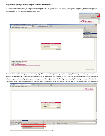 Czyszczenie pamięci podręcznej dla Internet Explorer 8 i 9. 1. Uruchamiamy pakiet „Narzędzia deweloperskie”. Przycisk ‘F12’ lub opcja „Narzędzia” (trybik), z wywołanej listy menu opcja „F12 Narzędzia deweloperskie”. 2. W dolnej części przeglądarki otworzy się okienko, z którego należy wybrad opcję „Pamięd podręczna”, z menu wybieramy opcję „Wyczyśd pamięd podręczną przeglądarki dla tej domeny…”. Zatwierdzid komunikat „Czy na pewno chcesz wyczyścid pamięd podręczną przeglądarki dla tej domeny?”. Następnie z opcji „Pamięd podręczna” wybrad „Wyczyśd pliki cookie dla domeny”, zatwierdzid komunikat „Czy Ne pewno chcesz wyczyścid pliki cookie dla domeny?”.