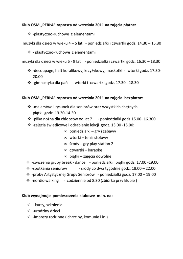 Klub OSM „PERŁA” zaprasza od września 2011 na zajęcia płatne: -plastyczno-ruchowe z elementami muzyki dla dzieci w wieku 4 – 5 lat - poniedziałki i czwartki godz. 14.30 – 15.30 - plastyczno-ruchowe z elementami muzyki dla dzieci w wieku 6 - 9 lat - poniedziałki i czwartki godz. 16.30 – 18.30 -decoupage, haft koralikowy, krzyżykowy, maskotki - wtorki godz. 17.3020.00 -gimnastyka dla pań - wtorki i czwartki godz. 17.30 - 18.30 Klub OSM „PERŁA” zaprasza od września 2011 na zajęcia bezpłatne: -malarstwo i rysunek dla seniorów oraz wszystkich chętnych piątki godz. 13.30-14.30 -piłka nożna dla chłopców od lat 7 - poniedziałki godz.15.00- 16.300 -zajęcia świetlicowe i odrabianie lekcji godz. 13.00 -15.00: • poniedziałki – gry i zabawy • wtorki – tenis stołowy • środy – gry play station 2 • czwartki – karaoke • piątki – zajęcia dowolne -ćwiczenia grupy break - dance - poniedziałki i piątki godz. 17.00 -19.00 -spotkania seniorów - środy co dwa tygodnie godz. 18.00 – 22.00 -próby Artystycznej Grupy Seniorów - poniedziałki godz. 17.00 – 19.00 -nordic-walking - codziennie od 8.30 (zbiórka przy klubie ) Klub wynajmuje pomieszczenia klubowe m.in. na: - kursy, szkolenia -urodziny dzieci -imprezy rodzinne ( chrzciny, komunie i in.)