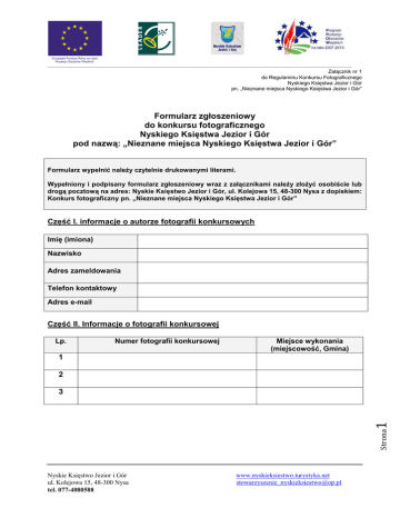 Europejski Fundusz Rolny na rzecz Rozwoju Obszarów Wiejskich -------------------------------------------------------------------------------------------------------------------------------------------------------------------------------------------------------------------------------------------------------------------------------- Załącznik nr 1 do Regulaminu Konkursu Fotograficznego Nyskiego Księstwa Jezior i Gór pn. „Nieznane miejsca Nyskiego Księstwa Jezior i Gór” Formularz zgłoszeniowy do konkursu fotograficznego Nyskiego Księstwa Jezior i Gór pod nazwą: „Nieznane miejsca Nyskiego Księstwa Jezior i Gór” Formularz wypełnić naleŜy czytelnie drukowanymi literami. Wypełniony i podpisany formularz zgłoszeniowy wraz z załącznikami naleŜy złoŜyć osobiście lub drogą pocztową na adres: Nyskie Księstwo Jezior i Gór, ul. Kolejowa 15, 48-300 Nysa z dopiskiem: Konkurs fotograficzny pn. „Nieznane miejsca Nyskiego Księstwa Jezior i Gór” Część I. informacje o autorze fotografii konkursowych Imię (imiona) Nazwisko Adres zameldowania Telefon kontaktowy Adres e-mail Część II. Informacje o fotografii konkursowej Lp. Numer fotografii konkursowej Miejsce wykonania (miejscowość, Gmina) 1 2 Strona 1 3 Nyskie Księstwo Jezior i Gór ul. Kolejowa 15, 48-300 Nysa tel. 077-4080588 www.nyskieksiestwo.turystyka.net [email protected] Europejski Fundusz Rolny na rzecz Rozwoju Obszarów Wiejskich -------------------------------------------------------------------------------------------------------------------------------------------------------------------------------------------------------------------------------------------------------------------------------- Część III. Oświadczenia autora fotografii konkursowej Oświadczam, Ŝe wszystkie dane podane w niniejszym formularzu są prawdziwe. ....................................................... miejscowość, data ....................................................... czytelny podpis Oświadczam, Ŝe jestem jedynym autorem zgłoszonej fotografii konkursowej, ponoszę wyłączną odpowiedzialność za ewentualne naruszenie praw autorskich osób trzecich w przedłoŜonej pracy, a takŜe przyjmuję wszystkie warunki Konkursu zawarte w Regulaminie. ....................................................... miejscowość, data ....................................................... czytelny podpis WyraŜam zgodę na szerokie upowszechnianie mojej fotografii konkursowej dla celów promocyjnych przez Nyskie Księstwo Jezior i Gór, a takŜe na nieodpłatne przeniesienie na Organizatora Konkursu autorskich praw osobistych i majątkowych. ....................................................... miejscowość, data ....................................................... czytelny podpis WyraŜam zgodę na gromadzenie i przetwarzanie moich danych osobowych w celach niezbędnych do realizacji i promocji Konkursu zgodnie z przepisami ustawy z dnia 29 sierpnia 1997 r. o ochronie danych osobowych (Dz. U. z 2002 r., nr 101, poz. 926 z późn. zm.) oraz na podawanie do wiadomości publicznej mojego imienia i nazwiska w związku z udziałem w niniejszym Konkursie we wszelkich ogłoszeniach, zapowiedziach i informacjach o Konkursie i jego wynikach, w tym na opublikowanie moich danych osobowych na stronie internetowej www.nyskieksiestwo.turystyka.net. Jednocześnie oświadczam, Ŝe jestem świadomy dobrowolności podania danych oraz Ŝe zostałem poinformowany o prawie wglądu do moich danych oraz moŜliwości ich poprawiania. ....................................................... ....................................................... czytelny podpis Strona 2 miejscowość, data Nyskie Księstwo Jezior i Gór ul. Kolejowa 15, 48-300 Nysa tel. 077-4080588 www.nyskieksiestwo.turystyka.net [email protected]