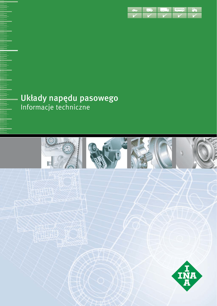 Układy napędu pasowego Informacje techniczne Spis treści 1. Układy napędu pasowego w pojazdach samochodowych 3 1.1 Napęd paska rozrządu / układy paska zębatego 4 1.2 Napęd paska pomocniczego / układy napędu paska pomocniczego 5 2. Rolki napinacza i rolki prowadzące napędów paska rozrządu i paska pomocniczego 6 2.1 Zespoły napinające napędu paska zębatego 8 2.2 Zespoły napinające napędu paska pomocniczego 9 3. Sprzęgiełka alternatora 12 3.1 Charakterystyka techniczna i zasada działania 13 3.2 Budowa sprzęgiełka alternatora 20 3.3 Przechowywanie sprzęgiełek alternatora i zasady postępowania 21 3.4 Test działania 22 4. Diagnozowanie awarii 23 5. Obsługa 25 2 1. Układy napędu pasowego w pojazdach samochodowych Układy napędu pasowego w pojazdach samochodowych spełniają dwa zadania: napęd paska rozrządu steruje zaworami za pomocą paska zębatego, który przekazuje ruch obrotowy wału korbowego na wałek rozrządu w proporcji 2:1, zapewniając w ten sposób doskonałą synchronizację ruchu tłoka i rozrządu zaworowego. Tak zwany napęd pomocniczy jest stosowany do napędzania urządzeń pomocniczych, takich jak alternator, pompa płynu chłodzącego, pompa wspomagania kierownicy czy sprężarka klimatyzacji. Funkcja ta była zazwyczaj realizowana za pomocą paska klinowego, który zapewniał pośrednie przeniesienie momentu z wału korbowego do alternatora i pompy płynu chłodzącego. Jednakże w nowoczesnych samochodach do zwiększania komfortu kierowcy używa się coraz większej ilości urządzeń elektronicznych. W rezultacie, jeden pasek klinowy nie wystarcza już do napędzania wysokowydajnego alternatora i urządzeń pomocniczych z przodu silnika, takich jak sprężarka klimatyzacji lub pompa wspomagania kierownicy. Aby rozwiązać ten problem stosowany jest pasek wielorowkowy, pozwalający na zmniejszenie kąta opasania, a przez to zwiększenie przełożenia. W przypadku silników o wyjątkowo zwartej budowie, urządzenia pomocnicze mogą być napędzane z wykorzystaniem przedniej i tylnej strony paska wielorowkowego. 3 1.1 Napęd paska rozrządu / układy paska zębatego Charakterystyka układów napędu paska zębatego: • Łączy wał korbowy z wałkiem (wałkami) rozrządu, • Może być wykorzystywany do przenoszenia napędu do pompy wtryskowej i pompy cieczy chłodzącej • Z wałkiem wyważającym lub pośrednim • Może składać się z jednego, dwóch lub kilku oddzielnych układów. Pasek zębaty jest wykonany z gumy, ze wzmocnieniem struktury paska włóknem szklanym i powłoką z tkaniny poliamidowej. Odporna na wysoką temperaturę warstwa pośrednia zapewnia idealne działanie zastosowanych materiałów. Zęby paska są również wzmocnione poliamidem w celu zwiększenia odporności na zużycie. Pasek zębaty, inaczej niż łańcuch rozrządu, nie wymaga smarowania, więc środowisko jego pracy nie wymaga uszczelnienia. Prosta osłona z tworzywa zapewnia wystarczającą ochronę przed wnikaniem zanieczyszczeń. Zalety nowoczesnych układów napędu paska zębatego: • Znakomita precyzja rozrządu zaworów w ciągu całego okresu eksploatacji • Duża żywotność / niski poziom hałasu podczas pracy • Łatwa i ekonomiczna obsługa i montaż • Praca bez smarowania, brak konieczności podawania oleju • Zwarta budowa • Minimalne tarcie • Wysoka sprawność Napęd paska rozrządu (1) koło pasowe wału korbowego (2) napinacz paska (3) pasek zębaty (4) koła pasowe wałka rozrządu (5) rolki prowadzące (opcjonalne) (6) pompa cieczy chłodzącej (opcjonalna) 4 1.2 Napęd paska pomocniczego / układy napędu paska pomocniczego Zalety nowoczesnych układów napędu paska pomocniczego: • Lepsza kontrola poślizgu w układzie napędu urządzeń pomocniczych, • Duża trwałość (160.000 km i więcej), • Zmniejszony hałas podczas pracy, • Niewielkie wymagania co do rozmiarów miejsca montażu, • Prosta obsługa. Układy napędu paska pomocniczego mogą składać się z jednego, dwóch lub kilku oddzielnych układów, ale normalnie są projektowane jako układ napędowy paska wielorowkowego. Urządzenia pomocnicze są napędzane za pomocą paska wieloklinowego lub wielorowkowego (f ) o profilu PK, którego naciąg jest precyzyjnie dobrany do wymaganych obciążeń za pomocą mechanicznego lub hydraulicznego układu napinającego. Do stworzenia kąta opasania paska, właściwego dla napędzania urządzeń pomocniczych stosuje się rolki prowadzące. Rolki te mogą być także wykorzystywane jako stabilizatory, eliminujące wibracje paska na dłuższych odcinkach. Paski wielorowkowe są zaprojektowane do przenoszenia dużego momentu obrotowego silnika - we współczesnych samochodach niczym niezwykłym jest moment do 350 Nm - bez poślizgu, z wału korbowego (a) do wszystkich urządzeń pomocniczych. Układy napędu paska pomocniczego Paski wielorowkowe są zaprojektowane do przenoszenia bez poślizgu dużego momentu obrotowego silnika z wału korbowego (a) do wszystkich urządzeń pomocniczych: Alternator (b), Pompa wspomagania kierownicy (c), Pompa cieczy chłodzącej (d), Sprężarka klimatyzacji (e) i inne urządzenia pomocnicze, takie jak wentylator lub mechaniczna sprężarka doładowująca. 5 2. Rolki napinające i rolki prowadzące układów paska rozrządu i paska pomocniczego Rolki napinające i rolki prowadzące są wykorzystywane zarówno do napędów paska rozrządu, jak i paska pomocniczego. Rolki napinające przenoszą siłę z napinacza paska na pasek, zapewniając w ten sposób stałe napięcie paska. Rolki prowadzące służą do zmiany prowadzenia paska odpowiednio do istniejących urządzeń pomocniczych z przodu silnika lub do stabilizowania paska i eliminowania drgań paska na dłuższych odcinkach swobodnych. Rolki napinające i prowadzące składają się z wykonanego ze stali lub tworzywa sztucznego koła pasowego ze zintegrowanym jednolub dwurzędowym łożyskiem kulkowym poprzecznym. Pow