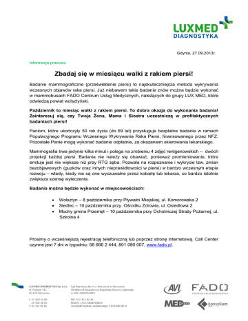 Gdynia, 27.09.2013r. Informacja prasowa Zbadaj się w miesiącu walki z rakiem piersi! Badanie mammograficzne (prześwietlenie piersi) to najskuteczniejsza metoda wykrywania wczesnych objawów raka piersi. Już niebawem takie badanie znów można będzie wykonać w mammobusach FADO Centrum Usług Medycznych, należących do grupy LUX MED, które odwiedzą powiat wolsztyński. Październik to miesiąc walki z rakiem piersi. To dobra okazja do wykonania badania! Zainteresuj się, czy Twoja Żona, Mama i Siostra uczestniczą w profilaktycznych badaniach piersi! Paniom, które ukończyły 50 rok życia (do 69 lat) przysługuje bezpłatne badanie w ramach Populacyjnego Programu Wczesnego Wykrywania Raka Piersi, finansowanego przez NFZ. Pozostałe Panie mogą wykonać badanie odpłatnie, za okazaniem skierowania lekarskiego. Mammografia trwa jedynie kilka minut i polega na zrobieniu 4 zdjęć rentgenowskich – dwóch projekcji każdej piersi. Badania nie należy się obawiać, ponieważ promieniowanie, które emituje jest nie większe niż przy RTG zęba. Pozwala na rozpoznanie i wykrycie tzw. zmian bezobjawowych (guzków oraz innych nieprawidłowości w piersi) w bardzo wczesnym etapie rozwoju – wtedy, kiedy nie są one wyczuwalne przez kobietę lub lekarza, co bardzo istotnie zwiększa szansę wyleczenia. Badania można będzie wykonać w miejscowościach: Wolsztyn – 8 października przy Pływalni Miejskiej, ul. Komorowska 2 Siedlec – 10 października przy Ośrodku Zdrowia, ul. Osiedlowa 2 Mochy gmina Przemęt – 10 października przy Ochotniczej Straży Pożarnej, ul. Szkolna 4 Prosimy o wcześniejszą rejestrację telefoniczną lub poprzez stronę internetową. Call Center czynne jest 7 dni w tygodniu: 58 666 2 444, 801 080 007, www.fado.pl. Informacje o Grupie LUX MED: Grupa LUX MED to największa firma medyczna w Polsce. Oferta Grupy kierowana jest zarówno do klientów korporacyjnych, jak i indywidualnych. Klienci korporacyjni korzystają z Pracowniczych Programów Zdrowotnych rozwijanych wokół medycyny pracy. Klienci indywidualni mogą skorzystać z opieki zdrowotnej na podstawie Planów Opieki Medycznej, a także tzw. świadczeń FFS (fee for service, opłaty za poszczególne usługi) oraz w ramach kontraktu z NFZ. Opieka ambulatoryjna świadczona jest w 118 centrach medycznych własnych i przyzakładowych. Pacjenci na terenie całego kraju mają do dyspozycji 50 placówek LUX MED i 24 centra medyczne Medycyny Rodzinnej, która specjalizuje się w obsłudze pacjentów w ramach kontraktu z NFZ. Pod marką PROFEMED działa specjalistyczna przychodnia lekarska przeznaczona specjalnie dla klientów „fee for service”. Z Grupą współpracuje ok. 1500 poradni partnerskich w całej Polsce. Pod jej opieką znajduje się ponad 1 200 000 pacjentów. Grupa ma cztery szpitale: dwa świadczące usługi jednego dnia (Endoterapia w Łodzi i MegaMed w Bełchatowie) oraz dwa szpitale w Warszawie, z których jeden świadczy szeroki zakres usług specjalistycznych (LUX MED), a drugi specjalizuje się w endoskopii i chirurgii (Endoterapia). Grupa LUX MED prowadzi również działalność ubezpieczeniową - LUX MED Ubezpieczenia jest oddziałem szwedzkiego towarzystwa ubezpieczeniowego LMG Försäkrings AB. W ramach Grupy LUX MED działają także spółki: LUX MED Diagnostyka, Tabita, Endoterapia i MegaMed. Endoterapia świadczy wysokospecjalistyczne usługi endoskopowe, a MegaMed opiekę ambulatoryjna i chirurgię jednego dnia. Tabita to ośrodek opiekuńczo-rehabilitacyjny dla osób starszych, samotnych oraz pacjentów w każdym wieku wymagających stałej opieki specjalistycznej i rehabilitacji. Grupa LUX MED jest częścią międzynarodowej grupy medycznej Bupa. LUX MED Diagnostyka Do Grupy LUX MED należy też LUX MED Diagnostyka, w skład której wchodzą AVI Diagnostyka Obrazowa, FADO Centrum Usług Medycznych, Konsylium oraz Med-Sport. Ośrodki diagnostyczne AVI specjalizują się w szerokiej gamie badań radiologicznych (tomografii komputerowej i rezonansu magnetycznego). Równoległym obszarem działalności AVI jest rehabilitacja. FADO – to największy w Polsce świadczeniodawca badań mammograficznych, dysponuje 15 mobilnymi pracowniami – mammobusami oraz trzema placówkami stacjonarnymi – w Warszawie, Gdańsku oraz Poznaniu. Med-Sport prowadzi pracownie tomografii komputerowej i rezonansu magnetycznego w Częstochowie, a także pracownie tomografii komputerowej w Lublińcu, Kłobucku oraz Pajęcznie. Konsylium to wrocławski ośrodek, wyposażony w i rezonans magnetyczny. Więcej informacji o Grupie LUX MED można znaleźć na www.luxmed.pl Kontakt dla dziennikarzy: Agata Jabłonowska Specjalista ds. Marketingu i PR FADO Centrum Usług Medycznych LUX MED Diagnostyka Ul. Nocznickiego 8A 81-454 Gdynia [email protected] Tel. 607 931 133 tomograf komputerowy