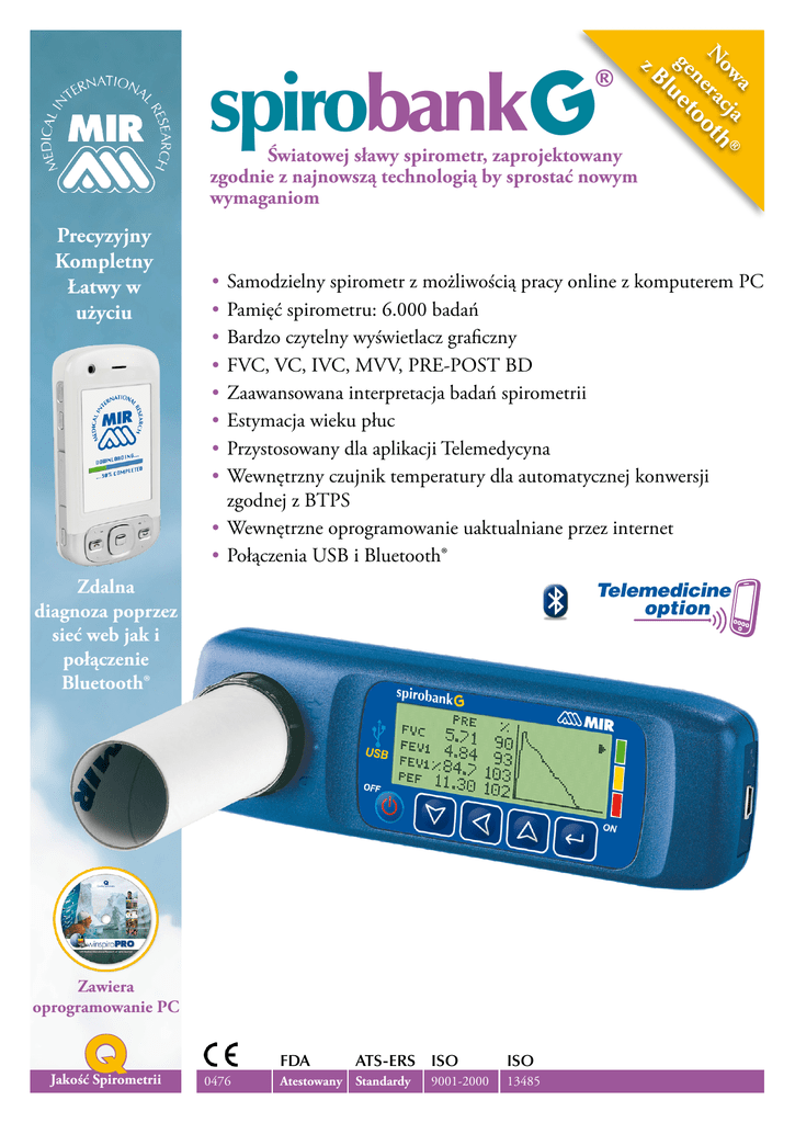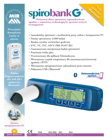 Światowej sławy spirometr, zaprojektowany zgodnie z najnowszą technologią by sprostać nowym wymaganiom Precyzyjny Kompletny Łatwy w użyciu • Samodzielny spirometr z możliwością pracy online z komputerem PC • Pamięć spirometru: 6.000 badań • Bardzo czytelny wyświetlacz graficzny • FVC, VC, IVC, MVV, PRE-POST BD • Zaawansowana interpretacja badań spirometrii • Estymacja wieku płuc • Przystosowany dla aplikacji Telemedycyna • Wewnętrzny czujnik temperatury dla automatycznej konwersji zgodnej z BTPS • Wewnętrzne oprogramowanie uaktualniane przez internet • Połączenia USB i Bluetooth® Zdalna diagnoza poprzez sieć web jak i połączenie Bluetooth® Zawiera oprogramowanie PC Q Jakość Spirometrii a ow ja ® N erac oth n o ge uet l zB spirobank G ® FDA 0476 ATS-ERS ISO Atestowany Standardy 9001-2000 ISO 13485 Q Wydruk raportu spirometrii Jakość Spirometrii System motywacyjny dla dzieci Szczegółowe wyniki spirometrii Pełne podsumowanie wyników Oprogramowanie PC winspiroPRO Używane na całym świecie przez ponad 50.000 lekarzy •Połączenie online z PC przez interfejs graficzny •Krzywe Przepływ/Objętość i Objętość/ Czas w czasie rzeczywistym •Porównanie wyników PRE-POST próby rozkurczowej •Zaawansowana interpretacja badań spirometrii •Estymacja wieku płuc •System motywacyjny dla dzieci •Badanie prowokacji oskrzeli z rezultatami FEV1 po podaniu leku i krzywą •Kilka zestawów wartości należnych •Eksport danych również poprzez e-mail •Integracja z Elektroniczną Dokumentacją Medyczną spirobank G ® Światowej sławy spirometr, zaprojektowany zgodnie z najnowszą technologią by sprostać nowym wymaganiom Graficzny wyświetlacz z przyjaznymi ikonami ułatwiającymi użytkowanie wymiary rzeczywiste rozmiary rzeczywiste Dostępne dwa różne czujniki przepływu FlowMir jednorazowa turbina •Wysoka precyzja •Łatwa do wymiany •Ekonomiczna •Zaprojektowana do użytku ze spirometrami MIR •Turbina FlowMir jest fabrycznie kalibrowana •Dostępna w kartonach po 100 szt. Wyłączny Patent MIR •Bez konserwacji-Bez filtra-Bez problemu •Gwarantowana 100% higieniczność dzięki indywidualnemu pakowaniu Turbina wielokrotnego użytku dla długoterminowego stosowania •Wysoka precyzja •Długotrwała stabilność •Łatwa w czyszczeniu jak i sterylizacji Cyfrowe turbiny MIR wielokrotnego i jednorazowego użytku są opracowywane zgodnie ze standardami ATS, gwarantują precyzyjność w każdych warunkach przeprowadzania badania spirobank G ® Światowej sławy spirometr, zaprojektowany zgodnie z najnowszą technologią by sprostać nowym wymaganiom Dane techniczne Czujnik temperatury: półprzewodnik (0-45°C) Przepływomierz: cyfrowa turbina dwukierunkowa Max. objętość: 10l Zakres przepływu: ±16l/s Dokładność objętości: ±3% lub 50ml Dokładność przepływu: ±5% lub 200ml/s Rezystancja dynamiczna przy 12l/s: <0,5 cmH2O/l/s Wyświetlacz: 128 × 48 pikseli, grafika LCD-FSTN Klawiatura: 5 klawiszy Połączenie: USB, Bluetooth® Zasilanie: 9V DC (bateria PP3) Wymiary: 162×49×32 mm (6,4×1,9×1,3 cali) Waga: 180 gram (6,4 Oz) z baterią Mierzone parametry Standardowe wyposażenie zawiera • Kabel USB • spirobank G® podstawowe urządzenie • Futerał na spirometr • Klips na nos • Bateria alkaliczna 9V • CD z oprogramowaniem winspiroPRO Opcja Oprogramowanie PC winspiroPRO NET Wersja Sieciowa Wymagania sprzętowe PC dla winspiroPRO • Microsoft Windows: Vista, 2000, XP • Rozdzielczość ekranu: 1024 × 768 • Napęd CD-ROM • Dostępna pamięć na dysku twardym: 500 MB • Dostępny port USB MIR - Medical International Research Via del Maggiolino, 125 - 00155 Roma (Italy) Tel. +39 06.22754777 - Fax. +39 06.22754785 www.spirometry.com [email protected] MIR zastrzega sobie prawo do aktualizacji charakterystyki technicznej w dowolnym momencie spirobankG_USB_POL_10_Rev0.indd www.spirometry.com FVC, FEV1, FEV1/FVC%, FEV3, FEV3/FVC%, FEV6, FEV1/FEV6%, PEF, FEF25%, FEF50%, FEF75%, FEF2575%, FET, Vext, Wiek Płuc, FIVC, FIV1, FIV1/FIVC%, PIF, VC, IVC, IC, ERV, FEV1/VC%, VT, VE, Rf, ti, te, ti/t-tot, VT/ti, MVV