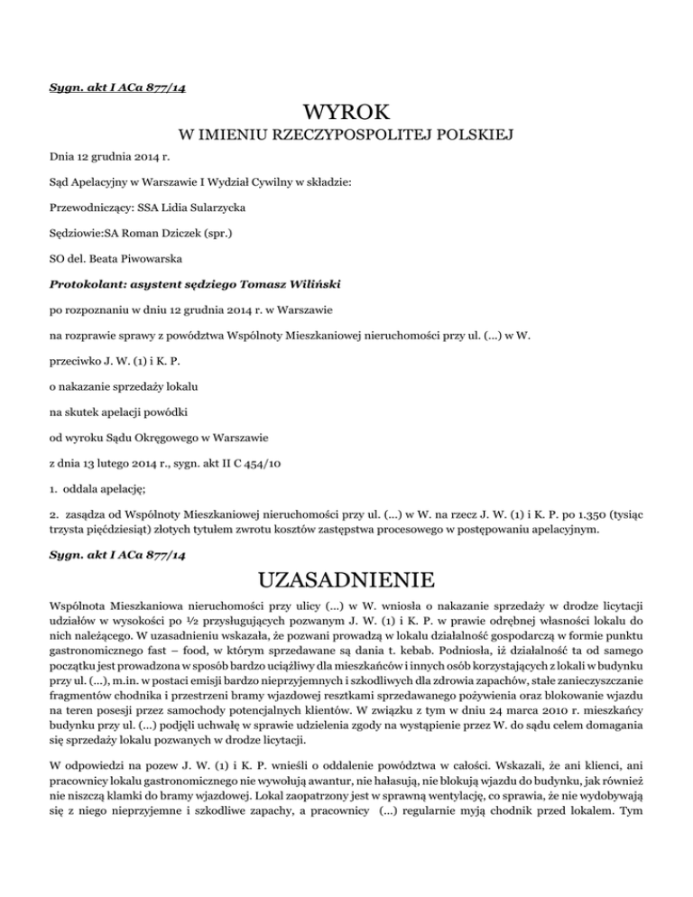 Sygn. akt I ACa 877/14 WYROK W IMIENIU RZECZYPOSPOLITEJ POLSKIEJ Dnia 12 grudnia 2014 r. Sąd Apelacyjny w Warszawie I Wydział Cywilny w składzie: Przewodniczący: SSA Lidia Sularzycka Sędziowie:SA Roman Dziczek (spr.) SO del. Beata Piwowarska Protokolant: asystent sędziego Tomasz Wiliński po rozpoznaniu w dniu 12 grudnia 2014 r. w Warszawie na rozprawie sprawy z powództwa Wspólnoty Mieszkaniowej nieruchomości przy ul. (...) w W. przeciwko J. W. (1) i K. P. o nakazanie sprzedaży lokalu na skutek apelacji powódki od wyroku Sądu Okręgowego w Warszawie z dnia 13 lutego 2014 r., sygn. akt II C 454/10 1. oddala apelację; 2. zasądza od Wspólnoty Mieszkaniowej nieruchomości przy ul. (...) w W. na rzecz J. W. (1) i K. P. po 1.350 (tysiąc trzysta pięćdziesiąt) złotych tytułem zwrotu kosztów zastępstwa procesowego w postępowaniu apelacyjnym. Sygn. akt I ACa 877/14 UZASADNIENIE Wspólnota Mieszkaniowa nieruchomości przy ulicy (...) w W. wniosła o nakazanie sprzedaży w drodze licytacji udziałów w wysokości po ½ przysługujących pozwanym J. W. (1) i K. P. w prawie odrębnej własności lokalu do nich należącego. W uzasadnieniu wskazała, że pozwani prowadzą w lokalu działalność gospodarczą w formie punktu gastronomicznego fast – food, w którym sprzedawane są dania t. kebab. Podniosła, iż działalność ta od samego początku jest prowadzona w sposób bardzo uciążliwy dla mieszkańców i innych osób korzystających z lokali w budynku przy ul. (...), m.in. w postaci emisji bardzo nieprzyjemnych i szkodliwych dla zdrowia zapachów, stałe zanieczyszczanie fragmentów chodnika i przestrzeni bramy wjazdowej resztkami sprzedawanego pożywienia oraz blokowanie wjazdu na teren posesji przez samochody potencjalnych klientów. W związku z tym w dniu 24 marca 2010 r. mieszkańcy budynku przy ul. (...) podjęli uchwałę w sprawie udzielenia zgody na wystąpienie przez W. do sądu celem domagania się sprzedaży lokalu pozwanych w drodze licytacji. W odpowiedzi na pozew J. W. (1) i K. P. wnieśli o oddalenie powództwa w całości. Wskazali, że ani klienci, ani pracownicy lokalu gastronomicznego nie wywołują awantur, nie hałasują, nie blokują wjazdu do budynku, jak również nie niszczą klamki do bramy wjazdowej. Lokal zaopatrzony jest w sprawną wentylację, co sprawia, że nie wydobywają się z niego nieprzyjemne i szkodliwe zapachy, a pracownicy (...) regularnie myją chodnik przed lokalem. Tym samym ich zachowanie nie wypełnia znamion określonych w art. 16 ustawy o własności lokali. Podnieśli, że w budynku przy ul. (...) znajduje się znaczna liczba lokali użytkowych, w tym m.in. bank zaopatrzony w całodobowe bankomaty, sklep, Agencja (...) oraz Zespół Adwokacki, który obsługuje nieograniczoną liczbę klientów w ciągu całego dnia pracy. Z kolei naprzeciwko lokalu znajduje się przystanek autobusowy, obsługujący linie autobusów nocnych oraz przystanek tramwajowy, wobec czego większość hałasów wytwarzana jest przez osoby oczekujące na tych przystankach. Podkreślili, że w okresie przed podjęciem przez Wspólnotę uchwały o sprzedaży lokalu, podejmowali próby wyjaśnienia prawdziwości podnoszonych zarzutów, deklarując gotowość ograniczenia pracy baru. Zaproponowali przeprowadzenie obserwacji okolic budynku w celu zidentyfikowania źródeł hałasu, a także zwrócili się do Wspólnoty o wskazanie rodzaju badań, które mieliby przeprowadzić oraz rodzaju instalacji, które mieliby zamontować w lokalu. W odpowiedzi na tę propozycję Wspólnota wystosowała wyłącznie żądanie ograniczenia pracy (...) do godzin 9 – 22, przy czym ograniczenie to nie miałoby zostać poprzedzone obserwacją, czy rzeczywiście (...) stanowi źródło hałasów. Postanowieniem z dnia 4 lutego 2013 r. Sąd skierował sprawę do mediacji. W piśmie procesowym z dnia 15 lutego 2013 r. powódka oświadczyła, iż nie widzi możliwości zakończenia sporu na drodze postępowania mediacyjnego. Sąd Okręgowy w Warszawie wyrokiem z dnia 13 lutego 2014 r. oddalił powództwo oraz orzekł o kosztach procesu. Sąd ten ustalił, że J. W. (1) i K. P. są współwłaścicielami w częściach równych lokalu użytkowego oznaczonego numerem (...) położonego na parterze budynku mieszkalnego przy ul. (...) w W., dla którego Sąd Rejonowy dla Warszawy Mokotowa w Warszawie X Wydział Ksiąg Wieczystych prowadzi księgę wieczystą o nr (...). Na mocy uchwały nr (...) z dnia 30 stycznia 2004 r. funkcję członków Zarządu Wspólnoty Mieszkaniowej (...) pełnią B. K., R. S., G. T., A. Z. oraz E. S.. We W. obowiązuje regulamin porządku domowego uchwalony w dniu 21 marca 2006 r., zgodnie z którym na terenie posesji obowiązuje cisza nocna od godziny 22:00 do godziny 6:00, a także niedozwolone jest emitowanie hałasu, zapachów oraz substancji zakłócających lub utrudniających spokojne zamieszkiwanie właścicieli lokali i najemców w zajmowanych lokalach mieszkalnych lub korzystanie z lokali użytkowych. Od 2000 roku lokal użytkowy nr (...) wynajmowany jest na prowadzenie działalności gastronomicznej pod nazwą (...). Wcześniej również znajdował się w nim punkt gastronomiczny. Działalność w lokalu polega na sprzedaży na wynos kebabów, bułek i sałatek. Część z tych posiłków odgrzewana jest w mikrofalówce, natomiast mięso jest podgrzewane bez użycia oleju. Bar funkcjonuje od 9.00 rano do późnych godzin nocnych, tj. do godziny 3.00 w nocy, a w soboty do ok. 4.00 rano. Przed okienkiem, przez które wydawane jest jedzenie stoi stolik i krzesła, z których mogą korzystać klienci. Obok stolika znajdują się również kosze na śmieci, przeznaczone na opakowania po spożytym jedzeniu. Klientami baru są najczęściej przechodnie oraz osoby, które podjeżdżają pod bar samochodami m.in. taksówkarze i policjanci. Obok baru znajduje się wejście do bloku z bramą i zamykanym domofonem, a także bank wraz z całodobowym ba