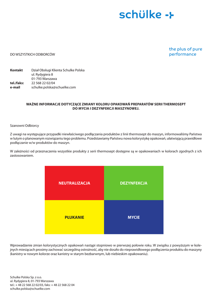 the plus of pure performance DO WSZYSTKICH ODBIORCÓW Kontakt Dział Obsługi Klienta Schulke Polska ul. Rydygiera 8 01-793 Warszawa tel./faks: 22 568 22 02/04 [email protected] Ważne informacje dotyczące zmiany koloru opakowań preparatów serii thermosept do mycia i dezynfekcji maszynowej. Szanowni Odbiorcy Z uwagi na występujące przypadki niewłaściwego podłączania produktów z linii thermosept do maszyn, informowaliśmy Państwa w lutym o planowanym rozwiązaniu tego problemu. Przedstawiamy Państwu nowa kolorystykę opakowań, ułatwiającą prawidłowe podłączanie w/w produktów do maszyn. W zależności od przeznaczenia wszystkie produkty z serii thermosept dostępne są w opakowaniach w kolorach zgodnych z ich zastosowaniem. NEUTRALIZACJA DEZYNFEKCJA PŁUKANIE MYCIE Wprowadzenie zmian kolorystycznych opakowań nastąpi stopniowo w pierwszej połowie roku. W związku z powyższym w kolejnych miesiącach prosimy zachować szczególną ostrożność, aby nie doszło do nieprawidłowego podłączenia produktu do maszyny (kanistry w nowym kolorze oraz kanistry w starym bezbarwnym, lub niebieskim opakowaniu). Schulke Polska Sp. z o.o. ul. Rydygiera 8, 01-793 Warszawa tel.: + 48 22 568 22 02/03, faks: + 48 22 568 22 04 [email protected] Z naszego punktu widzenia podwyższone ryzyko pomyłki może wystąpić w pracowniach endoskopowych podczas podłączania thermoseptu AF/ED – preparat do dezynfekcji maszynowej endoskopów (wcześniej niebieski kolor kanistra, teraz zielony) z thermoseptem ER – preparat do mycia maszynowego endoskopów (wcześniej bezbarwny kolor kanistra, teraz niebieski). Proszę zwrócić szczególną uwagę na nazwy preparatów podczas podłączania do maszyny. Dodatkowo proponujemy Państwu kolorowe naklejki do odpowiedniego oznaczenia przewodów zasysających. Proszę również poinformować o tej zmianie cały personel, w celu wyeliminowania w przyszłości ewentualnych pomyłek. Nowy schemat kolorów produktów: NEUTRALIZACJA DEZYNFEKCJA thermosept NKZ thermosept NKP thermosept neutralizer thermosept ED thermosept EF thermosept NDR thermosept DK PŁUKANIE MYCIE thermosept BSK thermosept SEK thermosept KSK thermosept SKS thermosept RKF thermosept RKF forte thermosept rkf soka thermosept RKN-zym thermosept alka clean thermosept alka clean forte thermosept ER thermodent alka clean Ewentualne pytania prosimy kierować do Działu Obsługi Klienta Schulke Polska, tel: 022 568 22 02, e-mail: [email protected]. Z poważaniem Leszek Cichoń Kierownik Hurtowni Farmaceutycznej Schulke Polska Sp. z o.o. ul. Rydygiera 8, 01-793 Warszawa tel.: + 48 22 568 22 02/03, faks: + 48 22 568 22 04 [email protected] the plus of pure performance ODPOWIEDŹ: FORMULARZ na nr faksu: 22 568 22 04 Prosimy o potwierdzenie niniejszego pisma: Potwierdzam odbiór niniejszego pisma. Informuję, że zapoznałem się z jego treścią oraz podjąłem/am odpowiednie środki. __________________________________________________ Nazwisko / imię (pieczątka) __________________________________________________ Szpital / Firma __________________________________________________ Data __________________________________________________ Podpis Czy chcecie Państwo otrzymać kolorowe naklejki do oznaczenia przewodów zasysających? tak nie Proszę o wpisanie ilości naklejek: _______________________________ Schulke Polska Sp. z o.o. ul. Rydygiera 8, 01-793 Warszawa tel.: + 48 22 568 22 02/03, faks: + 48 22 568 22 04 [email protected]
