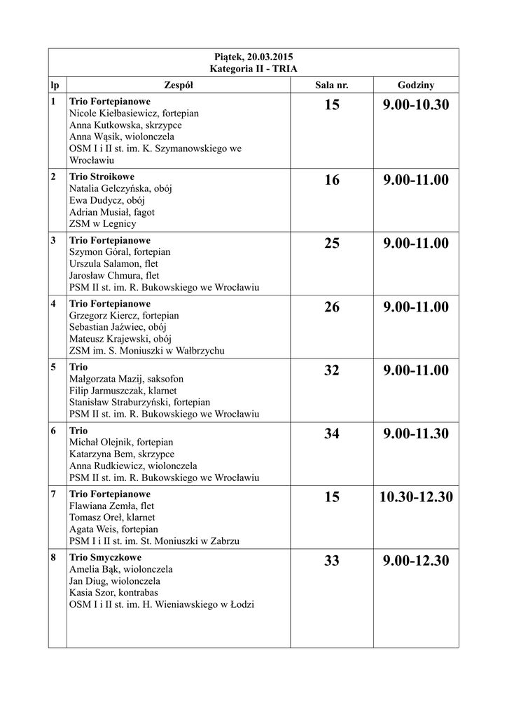 Piątek, 20.03.2015 Kategoria II - TRIA lp Zespół