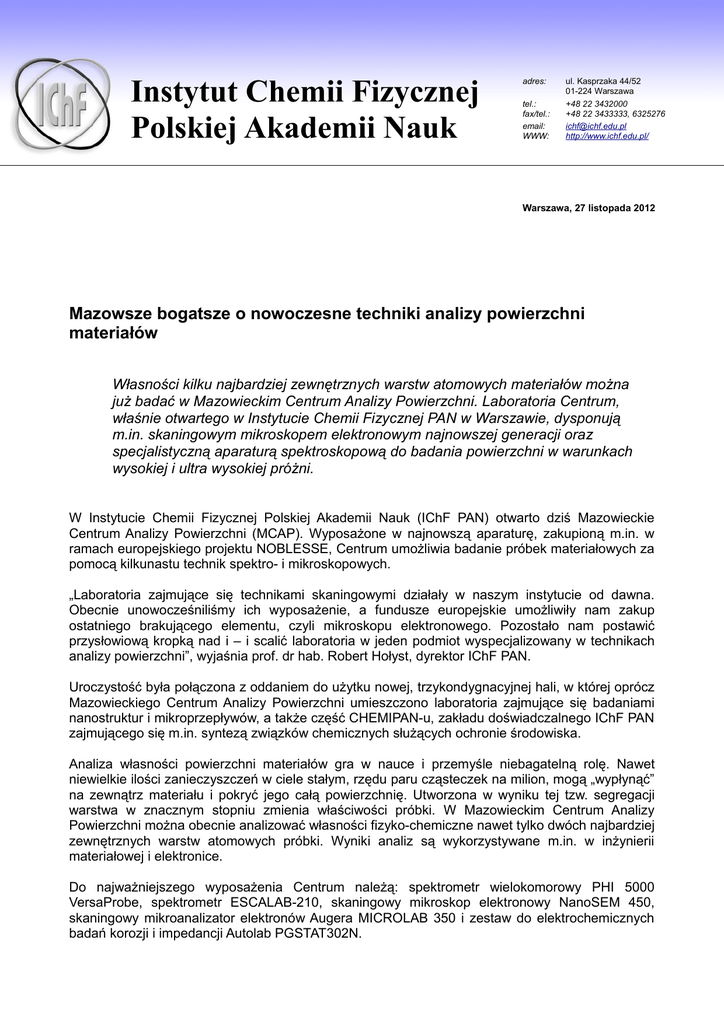 Instytut Chemii Fizycznej Polskiej Akademii Nauk adres: tel.: fax/tel.: email: WWW: ul. Kasprzaka 44/52 01-224 Warszawa +48 22 3432000 +48 22 3433333, 6325276 [email protected] http://www.ichf.edu.pl/ Warszawa, 27 listopada 2012 Mazowsze bogatsze o nowoczesne techniki analizy powierzchni materiałów Własności kilku najbardziej zewnętrznych warstw atomowych materiałów można już badać w Mazowieckim Centrum Analizy Powierzchni. Laboratoria Centrum, właśnie otwartego w Instytucie Chemii Fizycznej PAN w Warszawie, dysponują m.in. skaningowym mikroskopem elektronowym najnowszej generacji oraz specjalistyczną aparaturą spektroskopową do badania powierzchni w warunkach wysokiej i ultra wysokiej próżni. W Instytucie Chemii Fizycznej Polskiej Akademii Nauk (IChF PAN) otwarto dziś Mazowieckie Centrum Analizy Powierzchni (MCAP). Wyposażone w najnowszą aparaturę, zakupioną m.in. w ramach europejskiego projektu NOBLESSE, Centrum umożliwia badanie próbek materiałowych za pomocą kilkunastu technik spektro- i mikroskopowych. „Laboratoria zajmujące się technikami skaningowymi działały w naszym instytucie od dawna. Obecnie unowocześniliśmy ich wyposażenie, a fundusze europejskie umożliwiły nam zakup ostatniego brakującego elementu, czyli mikroskopu elektronowego. Pozostało nam postawić przysłowiową kropką nad i – i scalić laboratoria w jeden podmiot wyspecjalizowany w technikach analizy powierzchni”, wyjaśnia prof. dr hab. Robert Hołyst, dyrektor IChF PAN. Uroczystość była połączona z oddaniem do użytku nowej, trzykondygnacyjnej hali, w której oprócz Mazowieckiego Centrum Analizy Powierzchni umieszczono laboratoria zajmujące się badaniami nanostruktur i mikroprzepływów, a także część CHEMIPAN-u, zakładu doświadczalnego IChF PAN zajmującego się m.in. syntezą związków chemicznych służących ochronie środowiska. Analiza własności powierzchni materiałów gra w nauce i przemyśle niebagatelną rolę. Nawet niewielkie ilości zanieczyszczeń w ciele stałym, rzędu paru cząsteczek na milion, mogą „wypłynąć” na zewnątrz materiału i pokryć jego całą powierzchnię. Utworzona w wyniku tej tzw. segregacji warstwa w znacznym stopniu zmienia właściwości próbki. W Mazowieckim Centrum Analizy Powierzchni można obecnie analizować własności fizyko-chemiczne nawet tylko dwóch najbardziej zewnętrznych warstw atomowych próbki. Wyniki analiz są wykorzystywane m.in. w inżynierii materiałowej i elektronice. Do najważniejszego wyposażenia Centrum należą: spektrometr wielokomorowy PHI 5000 VersaProbe, spektrometr ESCALAB-210, skaningowy mikroskop elektronowy NanoSEM 450, skaningowy mikroanalizator elektronów Augera MICROLAB 350 i zestaw do elektrochemicznych badań korozji i impedancji Autolab PGSTAT302N. „W Centrum mamy teraz do dyspozycji kilkanaście technik powierzchniowych do badania powierzchni ciał stałych, w tym spektroskopię fotoelektronów, spektroskopię Augera oraz mikroskopie: tunelową, sił atomowych i inne. To dość unikalny kompleks metod, działających w jednej, ultrawysokiej próżni”, mówi prof. dr hab. Aleksander Jabłoński, kierownik MCAP. „Warto też podkreślić, że nasz sprzęt trafi do elektronicznej bazy aparatury naukowej ELAD, która ma służyć małym i średnim przedsiębiorstwom oraz instytucjom naukowym współpracującym w ramach projektu Mazowiecka Dolina Zielonej Chemii”, dodaje. Część pomiarów w MCAP jest wykonywana na zlecenie instytucji naukowych i badawczych należących do konsorcjum NANOBIOM, zajmującego się wykorzystaniem kwantowych nanostruktur półprzewodnikowych w biologii i medycynie. „Obecnie 40% czasu badań jest związana z pracami wykonywanymi na zewnątrz, coraz częściej dla przemysłu. Łącznie współpracowaliśmy już z blisko setką podmiotów zewnętrznych. A trzeba pamiętać, że na naszej aparaturze realizujemy jeszcze własne badania i granty”, podkreśla prof. Jabłoński. W uroczystości otwarcia Mazowieckiego Centrum Analizy Powierzchni uczestniczyli przedstawiciele Ministerstwa Nauki i Szkolnictwa Wyższego, władz samorządowych, Mazowieckiej Doliny Zielonej Chemii oraz kilkunastu uczelni i instytucji naukowo-badawczych – m.in. Instytutu Chemii Organicznej PAN, Instytutu Fizyki PAN, Instytutu Wysokich Ciśnień PAN, Instytutu Chemii i Techniki Jądrowej, Instytutu Chemii Przemysłowej, Instytutu Farmaceutycznego, Instytutu Przemysłu Organicznego, Politechniki Warszawskiej, Uniwersytetu Warszawskiego i Wojskowej Akademii Technicznej. Materiał prasowy przygotowany w ramach grantu NOBLESSE z działania „Potencjał badawczy” 7. Programu Ramowego Unii Europejskiej. Instytut Chemii Fizycznej Polskiej Akademii Nauk (http://www.ichf.edu.pl/) został powołany w 1955 roku jako jeden z pierwszych instytutów chemicznych PAN. Profil naukowy Instytutu jest silnie powiązany z najnowszymi światowymi kierunkami rozwoju chemii fizycznej i fizyki chemicznej. Badania naukowe są prowadzone w 9 zakładach naukowych. Działający w ramach Instytutu Zakład Doświadczalny CHEMIPAN wdraża, produkuje i komercjalizuje specjalistyczne związki chemiczne do zastosowań m.in. w rolnictwie i farmacji. Instytut publikuje około 200 oryginalnych prac badawczych rocznie. KONTAKTY DO NAUKOWCÓW: prof. dr hab. Robert Hołyst dyrektor Instytutu Chemii Fizycznej Polskiej Akademii Nauk tel. +48 22 3433123 email: [email protected] prof. dr hab. Aleksander Jabłoński kierownik Mazowieckiego Centrum Analizy Powierzchni tel. +48 22 3433331 email: [email protected] POWIĄZANE STRONY WWW: http://ichf.edu.pl/res/res_pl/labs/mcap/mcap_pl.html Strona Mazowieckiego Centrum Analizy Powierzchni. http://www.ichf.edu.pl/ Strona Instytutu Chemii Fizycznej Polskiej Akademii Nauk. http://www.ichf.edu.pl/press/ Serwis prasowy Instytutu Chemii Fizycznej PAN. MATERIAŁY GRAFICZNE: IChF121127b_fot01s.jpg HR: http://ichf.edu.pl/press/2012/11/IChF121127b_fot01.jpg Mazowie
