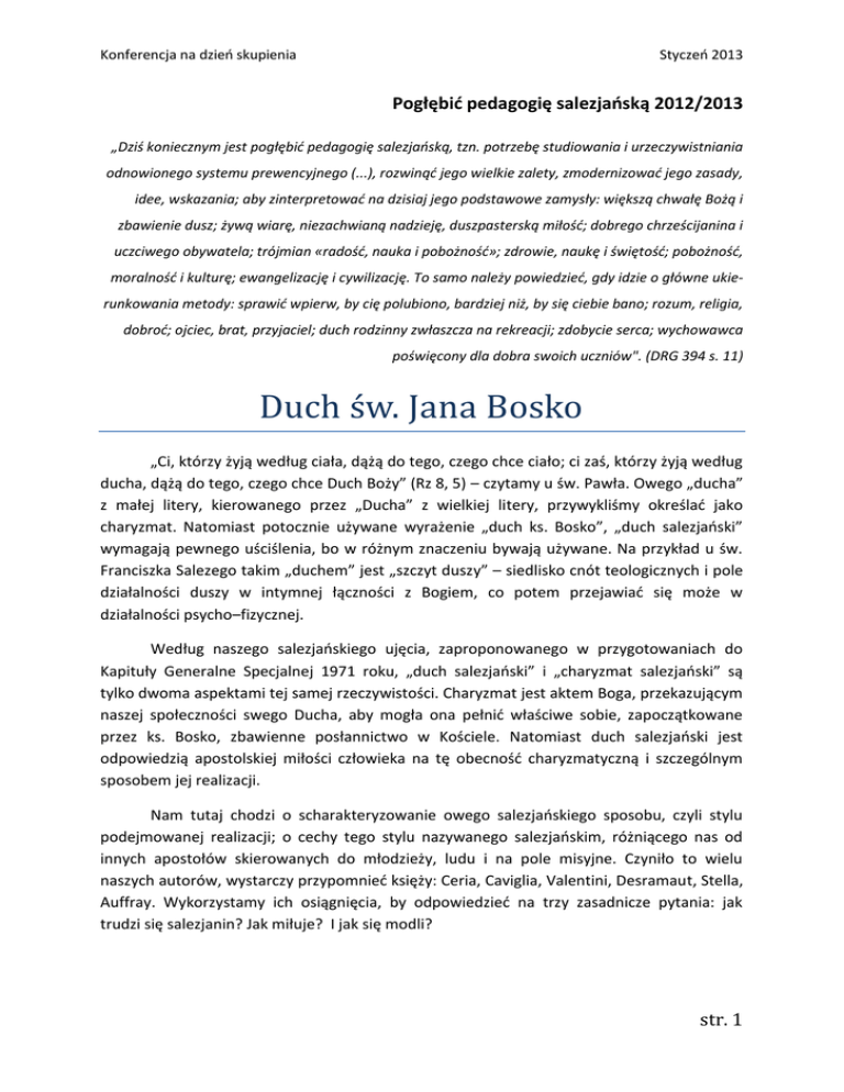 Konferencja na dzień skupienia Styczeń 2013 Pogłębić pedagogię salezjańską 2012/2013 „Dziś koniecznym jest pogłębić pedagogię salezjańską, tzn. potrzebę studiowania i urzeczywistniania odnowionego systemu prewencyjnego (...), rozwinąć jego wielkie zalety, zmodernizować jego zasady, idee, wskazania; aby zinterpretować na dzisiaj jego podstawowe zamysły: większą chwałę Bożą i zbawienie dusz; żywą wiarę, niezachwianą nadzieję, duszpasterską miłość; dobrego chrześcijanina i uczciwego obywatela; trójmian «radość, nauka i pobożność»; zdrowie, naukę i świętość; pobożność, moralność i kulturę; ewangelizację i cywilizację. To samo należy powiedzieć, gdy idzie o główne ukierunkowania metody: sprawić wpierw, by cię polubiono, bardziej niż, by się ciebie bano; rozum, religia, dobroć; ojciec, brat, przyjaciel; duch rodzinny zwłaszcza na rekreacji; zdobycie serca; wychowawca poświęcony dla dobra swoich uczniów". (DRG 394 s. 11) Duch św. Jana Bosko „Ci, którzy żyją według ciała, dążą do tego, czego chce ciało; ci zaś, którzy żyją według ducha, dążą do tego, czego chce Duch Boży” (Rz 8, 5) – czytamy u św. Pawła. Owego „ducha” z małej litery, kierowanego przez „Ducha” z wielkiej litery, przywykliśmy określać jako charyzmat. Natomiast potocznie używane wyrażenie „duch ks. Bosko”, „duch salezjański” wymagają pewnego uściślenia, bo w różnym znaczeniu bywają używane. Na przykład u św. Franciszka Salezego takim „duchem” jest „szczyt duszy” – siedlisko cnót teologicznych i pole działalności duszy w intymnej łączności z Bogiem, co potem przejawiać się może w działalności psycho–fizycznej. Według naszego salezjańskiego ujęcia, zaproponowanego w przygotowaniach do Kapituły Generalne Specjalnej 1971 roku, „duch salezjański” i „charyzmat salezjański” są tylko dwoma aspektami tej samej rzeczywistości. Charyzmat jest aktem Boga, przekazującym naszej społeczności swego Ducha, aby mogła ona pełnić właściwe sobie, zapoczątkowane przez ks. Bosko, zbawienne posłannictwo w Kościele. Natomiast duch salezjański jest odpowiedzią apostolskiej miłości człowieka na tę obecność charyzmatyczną i szczególnym sposobem jej realizacji. Nam tutaj chodzi o scharakteryzowanie owego salezjańskiego sposobu, czyli stylu podejmowanej realizacji; o cechy tego stylu nazywanego salezjańskim, różniącego nas od innych apostołów skierowanych do młodzieży, ludu i na pole misyjne. Czyniło to wielu naszych autorów, wystarczy przypomnieć księży: Ceria, Caviglia, Valentini, Desramaut, Stella, Auffray. Wykorzystamy ich osiągnięcia, by odpowiedzieć na trzy zasadnicze pytania: jak trudzi się salezjanin? Jak miłuje? I jak się modli? str. 1 Konferencja na dzień skupienia Styczeń 2013 Jak uświęca się salezjanin? Ks. Bosko był z powołania apostołem i swoim hasłem Da mihi anima caetera tolle zmobilizował ludzi bliskich mu duchem i zaangażowanych w Chrystusową akcję zbawczą. Każdy zwolennik ks. Bosko uświęca się przez praktykowanie żywej wiary, nadziei związanej z powołaniem, miłości w konsekracji, przez mobilizowanie się w pracy i powściągliwości doskonalonej łącznością z Bogiem, aby do bliźnich, zwłaszcza do młodzieży zaniedbanej, do ludu i do trzeciego świata wyjść z apostolstwem opartym na systemie prewencyjnym. Teraz jednak w tych najbardziej salezjańskich środkach podkreślić trzeba to, co szczególnie charakteryzuje styl św. Założyciela. Jak trudzi się salezjanin? Wyrażenie „trudzi się” określa tu zarówno pracę, jak i powściągliwość – ten znamienity dwumian ks. Bosko. O nich więc kolejno będzie mowa. Zacznijmy od pracy. Można powiedzieć, że salezjańskie życie to miłość w czynie, a nie wielomówstwo, według pouczenia św. Jana: „dzieci, nie miłujmy słowem i językiem, ale czynem i prawdą ( 1J 3, 18). Ks. Valentini mówi o „pierwszeństwie czynu”, który u salezjanina może przemienić się w „pracę – modlitwę”, podejmowaną dla Boga i z Bogiem w budowaniu Królestwa Bożego na ziemi. Wtedy, według ks. Aubry, mamy do czynienia z „mistyką pracy”. Wyrażenie to sugeruje wielkie napięcie w kontaktach z Bogiem i gorliwość miłości zdobywającej ludzi dla Chrystusa. Dla ks. Bosko każda chwila była sposobna do kontemplacji – zarówno chwila modlitwy, jak i chwila wytężonej pracy. Podobnie dla salezjanina, po wewnętrznej szarpaninie godzenia obowiązku ze skupieniem następuje wirtualne oddanie się Bogu, a wtedy praca apostolska może przerodzić się w „działalność kontemplującą” – jak to określa ks. Vanetini. Zanim jednak codzienny trud osiągnie takie szczyty, powinien być on dla salezjanina „ascezą pracy”, na jaką wyraźnie wskazuje druga część przyjętego hasła „caetera tolle”, zakładającego rezygnację ze wszystkiego, co niezgodne z duchem apostolskim, jak komfort, wygodnictwo, zmysłowość, gonitwa za uciechami. Tę ascezę powinno cechować ochotne podejmowanie mozołu pracy i bohaterstwo w „straszliwej codzienności”, jak to określił Pius XI. W tym wszystkim tkwi element umartwienia, niezbędny w życiu duchowym, a przez ks. Bosko nazywany powściągliwością. Ks. Bosko żądał „postu zmysłów” (MB 12, 143), panowania nad dolegliwościami fizycznymi, cierpliwego znoszenia przeciwności życiowych. Dlatego ks. Caviglia powiada, że jego środkiem umartwienia, narzędziem, powiedzmy dyscypliną, było samo życie – surowe, ubogie, poskromione, a więc powściągliwe umyślnie i ofiarnie. Salezjanin powinien dbać o realność wykonywanej pracy; o to aby była ona dyktowana rzeczywistymi potrzebami, sugerowanymi przez „znaki czasu”, a choć str. 2 Konferencja na dzień skupienia Styczeń 2013 prowadzona w ramach obowiązku, to jednak nie powinna być pozbawiona inicjatywy osobistej i twórczego wy