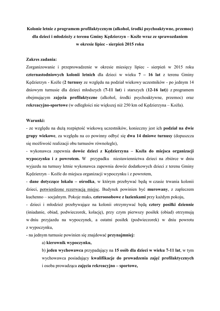 Kolonie letnie z programem profilaktycznym (alkohol, środki psychoaktywne, przemoc) dla dzieci i młodzieży z terenu Gminy Kędzierzyn – Koźle wraz ze sprawozdaniem w okresie lipiec - sierpień 2015 roku Zakres zadania: Zorganizowanie i przeprowadzenie w okresie miesięcy lipiec - sierpień w 2015 roku czternastodniowych kolonii letnich dla dzieci w wieku 7 – 16 lat z terenu Gminy Kędzierzyn - Koźle (2 turnusy ze względu na podział wiekowy uczestników - po jednym 14 dniowym turnusie dla dzieci młodszych (7-11 lat) i starszych (12-16 lat)) z programem obejmującym zajęcia profilaktyczne (alkohol, środki psychoaktywne, przemoc) oraz rekreacyjno-sportowe (w odległości nie większej niż 250 km od Kędzierzyna – Koźla). Warunki: - ze względu na dużą rozpiętość wiekową uczestników, konieczny jest ich podział na dwie grupy wiekowe, za względu na co powinny odbyć się dwa 14 dniowe turnusy (dopuszcza się możliwość realizacji obu turnusów równolegle), - wykonawca zapewnia dowóz dzieci z Kędzierzyna – Koźla do miejsca organizacji wypoczynku i z powrotem. W przypadku niestawiennictwa dzieci na zbiórce w dniu wyjazdu na turnusy letnie wykonawca zapewnia dowóz dodatkowych dzieci z terenu Gminy Kędzierzyn – Koźle do miejsca organizacji wypoczynku i z powrotem, - dane dotyczące lokalu – ośrodka, w którym przebywać będą w czasie trwania kolonii dzieci, potwierdzone rezerwacją miejsc. Budynek powinien być murowany, z zapleczem kuchenno – socjalnym. Pokoje maks. czteroosobowe z łazienkami przy każdym pokoju, - dzieci i młodzież przebywające na kolonii otrzymywać będą cztery posiłki dziennie (śniadanie, obiad, podwieczorek, kolację), przy czym pierwszy posiłek (obiad) otrzymują w dniu przyjazdu na wypoczynek, a ostatni posiłek (podwieczorek) w dniu powrotu z wypoczynku, - na jednym turnusie powinien się znajdować przynajmniej: a) kierownik wypoczynku, b) jeden wychowawca przypadający na 15 osób dla dzieci w wieku 7-11 lat, w tym wychowawca posiadający kwalifikacje do prowadzenia zajęć profilaktycznych i osoba prowadząca zajęcia rekreacyjno – sportowe, c) jeden wychowawca przypadający na 20 osób dla dzieci w wieku 12-16 lat, w tym wychowawca posiadający kwalifikacje do prowadzenia zajęć profilaktycznych i osoba prowadząca zajęcia rekreacyjno – sportowe, d) pielęgniarka lub ratownik medyczny (do oferty należy dołączyć stosowne dokumenty), e) dochodzący lekarz (do oferty należy dołączyć stosowne dokumenty), - opiekę nad dziećmi w trakcie trwania wypoczynku zapewnią wychowawcy posiadający stosowne kwalifikacje oraz wychowawca posiadający uprawnienia do prowadzenia zajęć profilaktycznych (alkohol, środki psychoaktywne, przemoc) z dziećmi, udokumentowane kopiami dyplomów, zaświadczeń lub certyfikatów, potwierdzonymi za zgodność z oryginałem. Kadra powinna legitymować się kwalifikacjami, o których mowa w § 11 ust. 1 i § 12 ust.1 Rozporządzenia Ministra Edukacji Narodowej z dnia 21.01.1997r. w sprawie warunków, jakie muszą spełniać organizatorzy wypoczynku dla dzieci i młodzieży szkolnej, a także zasad jego organizowania i nadzorowania (Dz. U. z 1997r. Nr 12 poz. 67 z późn. zm.). Każdy opiekun powinien posiadać przynajmniej pięcioletnie doświadczenie w ciągłej pracy z dziećmi i młodzieżą potwierdzone odpowiednimi zaświadczeniami oraz referencjami wystawionymi przez macierzystą placówkę. Wykonawca niezwłocznie (tj. do 3 dni) powiadomi Gminę o każdej zmianie kadry z przyczyn niezależnych od Wykonawcy, przedkładając jednocześnie wszystkie określone w warunkach osobowych dokumenty celem ich weryfikacji oraz akceptacji przez Gminę, - wykonawca przedmiotu zamówienia winien jest zapewnić opiekę medyczną ze strony stałej pielęgniarki lub ratownika medycznego i dochodzącego lekarza oraz podstawowy zestaw leków i innych środków pomocy doraźnej, - w trakcie wypoczynku prowadzony ma być program profilaktyczny (alkohol, środki psychoaktywne, przemoc), którego dokumentacja powinna zostać przekazana do Wydziału PMS po zakończeniu realizacji zadania, wraz ze sprawozdaniem, - w trakcie wypoczynku prowadzony ma być program zajęć rekreacyjno – sportowych, którego dokumentacja powinna zostać przekazana do Wydziału PMS po zakończeniu realizacji zadania, wraz ze sprawozdaniem, - wynagrodzenie za przeprowadzony wypoczynek zostanie wypłacone po zakończeniu zadania oraz dostarczeniu sprawozdania z jego realizacji, wraz z dokumentacją zajęć profilaktycznych oraz zajęć rekreacyjno-sportowych. Za datę wykonania usługi przyjmuje się termin dostarczenia kompletu powyższych dokumentów. W przypadku stwierdzenia nieprawidłowości w wykonaniu usługi Gmina zastrzega sobie prawo potrącenia kar umownych. Gmina nie ponosi odpowiedzialności finansowej za szkody wyrządzone przez uczestników wypoczynku podczas trwania obu turnusów letnich, - posiadanie zezwolenie na organizowanie imprez rekreacyjnych, o którym mowa w art.4 ust. 1 ustawy z dnia 29 sierpnia 1997r. o usługach turystycznych (Dz. U. z 2014r. poz. 196) ważne co najmniej do 31 sierpnia 2015r., - doświadczenie w zakresie organizacji i prowadzenia wypoczynku dla dzieci w latach 2012 – 2015 (min. 300 os.) potwierdzone stosownymi dokumentami (referencjami), z których wynika okres w jakim prowadzony był wypoczynek oraz liczba osób uczestniczących w wypoczynku, - posiadanie ważnego ubezpieczenia OC z tytułu prowadzenia działalności gospodarczej w zakresie organizacji imprez turystycznych, - wykonawca przedmiotu zamówienia zapewni dzieciom ubezpieczenie od następstw nieszczęśliwych wypadków. Do oferty należy dołączyć: - dokumenty rejestrowe (wypis z KRS, wpis do ewidencji działalności gospodarczej lub inne właściwe dla oferenta – wystawione nie wcześniej niż 3 miesiące przed datą składania oferty), - zezwolenie na organizowanie imprez rekreacyjnych, o którym mowa w a