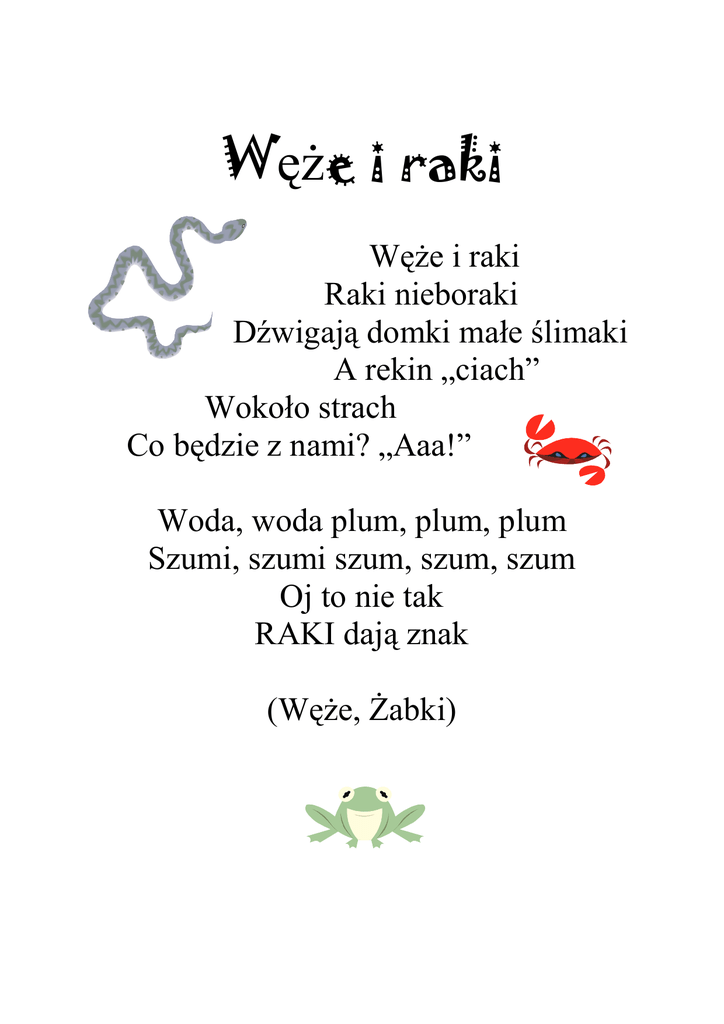 WęŜe i raki WęŜe i raki Raki nieboraki Dźwigają domki małe ślimaki A rekin „ciach” Wokoło strach Co będzie z nami? „Aaa!” Woda, woda plum, plum, plum Szumi, szumi szum, szum, szum Oj to nie tak RAKI dają znak (WęŜe, śabki)