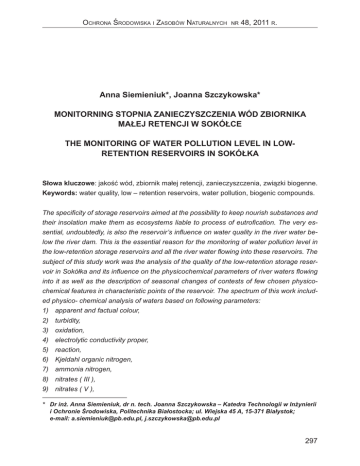 Ochrona Środowiska i Zasobów Naturalnych nr 48, 2011 r. Anna Siemieniuk*, Joanna Szczykowska* Monitorning stopnia zanieczyszczenia wód zbiornika małej retencji w Sokółce The monitoring of water pollution level in lowretention reservoirs in Sokółka Słowa kluczowe: jakość wód, zbiornik małej retencji, zanieczyszczenia, związki biogenne. Keywords: water quality, low – retention reservoirs, water pollution, biogenic compounds. The specificity of storage reservoirs aimed at the possibility to keep nourish substances and their insolation make them as ecosystems liable to process of eutrofication. The very essential, undoubtedly, is also the reservoir’s influence on water quality in the river water below the river dam. This is the essential reason for the monitoring of water pollution level in the low-retention storage reservoirs and all the river water flowing into these reservoirs. The subject of this study work was the analysis of the quality of the low-retention storage reservoir in Sokółka and its influence on the physicochemical parameters of river waters flowing into it as well as the description of seasonal changes of contests of few chosen physicochemical features in characteristic points of the reservoir. The spectrum of this work included physico- chemical analysis of waters based on following parameters: 1) apparent and factual colour, 2) turbidity, 3) oxidation, 4) electrolytic conductivity proper, 5) reaction, 6) Kjeldahl organic nitrogen, 7) ammonia nitrogen, 8) nitrates ( III ), 9) nitrates ( V ), * Dr inż. Anna Siemieniuk, dr n. tech. Joanna Szczykowska – Katedra Technologii w Inżynierii i Ochronie Środowiska, Politechnika Białostocka; ul. Wiejska 45 A, 15-371 Białystok; e-mail: [email protected], [email protected] 297 Anna Siemieniuk, Joanna Szczykowska 10) phosphates, 11) ferrum, 12) manganese. The researches of samples of water, taken from surface layer of a coastal zone, taken place every month in the period from March 2007 to February 2011. The analysis of physico- chemical features of water was done according to current methodology and the statistical calculations, were based on all achieved results of tests, were done using three -factor analysis of variation for individual years, months and points where samples were collected from. The difference was measured with Tucke test on two confidence levels α = 0.05 and α = 0.01. 1. WPROWADZENIE Zanieczyszczenie wód pierwiastkami śladowymi ma szczególne znaczenie ze względu na rolę, jaką one spełniają w krążeniu składników chemicznych, między różnymi elementami środowiska. Zanieczyszczenie to zależy zarówno od czynników naturalnych, jak i odczynników antropogenicznych, substancje skażające zaś dostają się do wód bezpośrednio lub pośrednio. [Kabata-Pendias A. i Pendias H. 1993] Mała retencja wodna pozwala na gospodarowanie wodami i ich wykorzystywanie w obrębie małych zlewni. Pojęcie to kryje szereg działań technicznych i nietechnicznych, prowadzących do zmian i ingerencji człowieka w środowisko. Mała retencja wodna pozwala na podtrzymanie walorów przyrodniczych i środowiskowych regionów, a także na wykorzystanie wody do celów rolniczych i gospodarczych. Zbiorniki małej retencji to również możliwości rozwoju turystycznego regionów oraz miejsce wypoczynku i rekreacji dla ludności. Działania mające na celu retencjonowanie wody należy jednak rozpatrywać równolegle w powiązaniu z jej jakością i z realizacją zadań mających na celu poprawę stanu czystości tych wód, ponieważ jednym z celów małej retencji jest wydłużenie drogi obiegu zanieczyszczeń [Mioduszewski W. 2003]. Zmagazynowanie wody i jej okresowe przetrzymanie powinno poprawiać zdolności wód do samooczyszczania się, ponieważ zachodzące w tych wodach procesy chemiczne i biochemiczne prowadzą do rozkładu szkodliwych związków. Szczególnie istotne jest w tym wypadku usuwanie azotu i fosforu. Zapory rzeczne w wyniku sztucznego spiętrzenia wody przyczyniają się do wzmożonej sedymentacji substancji wnoszonych przez rzekę do zbiornika retencyjnego. Zdarza się, że ładunki są tak duże, iż żywotność zbiorników wynosi zaledwie kilkadziesiąt lat. Specyfika zbiorników retencyjnych, polegająca na możliwości zatrzymywania związków pokarmowych, oraz ich nasłonecznienie czynią z tych zbiorników ekosystemy podatne na proces eutrofizacji. Bardzo istotny jest także wpływ zbiornika na jakość wody w rzece poniżej zapory. [Klimaszyk P. 2006]. Dlatego istotnym staje się monitoring stanu czystości wód zbiorników małej retencji, jak również wód rzek zasilających te akweny. Celem opracowania była analiza jakości wód zbiornika małej retencji w Sokółce oraz 298 Monitorning stopnia zanieczyszczenia wód zbiornika małej retencji w Sokółce jego wpływu na parametry fizykochemiczne wód rzeki zasilającej, jak również określenie sezonowych zmian zawartości wybranych wskaźników fizykochemicznych w charakterystycznych punktach zbiornika. 2. MATERIAŁ I METODY BADAŃ Gmina Sokółka położona jest w północno-wschodniej części wojewódzwtwa podlaskiego. Wschodnia granica gminy pokrywa się z granicą polsko-białoruską. Gmina Sokółka jest gminą rolniczą. Badaniami objęto wybudowany przez Niemców w 1942 r. zbiornik sokólski, o objętości około 320 tys m3 i powierzchni zalewu 18,3 ha (przy normalnym piętrzeniu). Zbiornik położony jest na Kanale Sokólskim, który jest prawym dopływem rzeki Sokołda. Średnia głębokość zbiornika wynosi 1,75 m. Ze względu na położenie zbiornika w mieście Sokółka, zalew jest szczególnie szeroko wykorzystywany do celów społecznych, a przede wszystkim jako ośrodek rekreacyjny. Do badań wytypowano trzy punkty pomiarowo-kontrolne w czaszy zbiornika oraz po jednym punkcie na cieku doprowadzającym i odprowadzającym wody z akwenu. Wybór i rozmieszczenie punktów badawczych podyktowane były moż