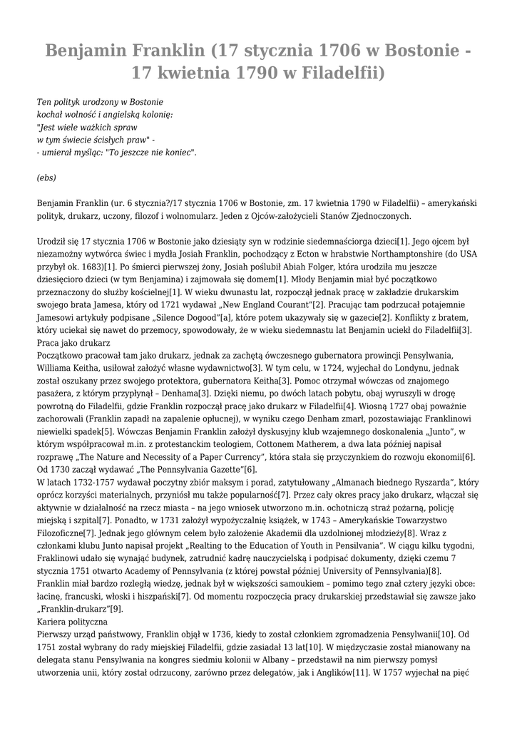 Benjamin Franklin (ur. 6 stycznia?/17 stycznia 1706 w Bostonie, zm. 17 kwietnia 1790 w Filadelfii) – amerykański