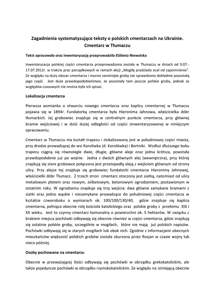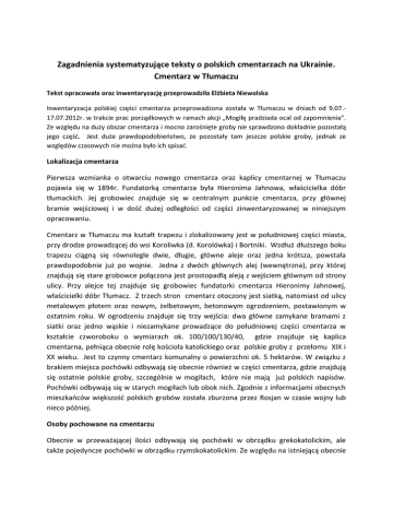Zagadnienia systematyzujące teksty o polskich cmentarzach na Ukrainie. Cmentarz w Tłumaczu Tekst opracowała oraz inwentaryzację przeprowadziła Elżbieta Niewolska Inwentaryzacja polskiej części cmentarza przeprowadzona została w Tłumaczu w dniach od 9.07.17.07.2012r. w trakcie prac porządkowych w ramach akcji „Mogiłę pradziada ocal od zapomnienia”. Ze względu na duży obszar cmentarza i mocno zarośnięte groby nie sprawdzono dokładnie pozostałą jego część. Jest duże prawdopodobieństwo, że pozostały tam jeszcze polskie groby, jednak ze względów czasowych nie można było ich spisać. Lokalizacja cmentarza Pierwsza wzmianka o otwarciu nowego cmentarza oraz kaplicy cmentarnej w Tłumaczu pojawia się w 1894r. Fundatorką cmentarza była Hieronima Jahnowa, właścicielka dóbr tłumackich. Jej grobowiec znajduje się w centralnym punkcie cmentarza, przy głównej bramie wejściowej i w dość dużej odległości od części zinwentaryzowanej w niniejszym opracowaniu. Cmentarz w Tłumaczu ma kształt trapezu i zlokalizowany jest w południowej części miasta, przy drodze prowadzącej do wsi Koroliwka (d. Korolówka) i Bortniki. Wzdłuż dłuższego boku trapezu ciągną się równolegle dwie, długie, główne aleje oraz jedna krótsza, powstała prawdopodobnie już po wojnie. Jedna z dwóch głównych alej (wewnętrzna), przy której znajdują się stare grobowce połączona jest prostopadłą aleją z wejściem głównym od strony ulicy. Przy alejce tej znajduje się grobowiec fundatorki cmentarza Hieronimy Jahnowej, właścicielki dóbr Tłumacz. Z trzech stron cmentarz otoczony jest siatką, natomiast od ulicy metalowym płotem oraz nowym, żelbetowym, betonowym ogrodzeniem, postawionym w ostatnim roku. W ogrodzeniu znajduje się trzy wejścia: dwa główne zamykane bramami z siatki oraz jedno wąskie i niezamykane prowadzące do południowej części cmentarza w kształcie czworoboku o wymiarach ok. 100/100/130/40, gdzie znajduje się kaplica cmentarna, pełniąca obecnie rolę kościoła katolickiego oraz polskie groby z przełomu XIX i XX wieku. Jest to czynny cmentarz komunalny o powierzchni ok. 5 hektarów. W związku z brakiem miejsca pochówki odbywają się obecnie również w części cmentarza, gdzie znajdują się ostatnie polskie groby, szczególnie w mogiłach, które nie mają już polskich napisów. Pochówki odbywają się w starych mogiłach lub obok nich. Zgodnie z informacjami obecnych mieszkańców większość polskich grobów została zburzona przez Rosjan w czasie wojny lub nieco później. Osoby pochowane na cmentarzu Obecnie w przeważającej ilości odbywają się pochówki w obrządku grekokatolickim, ale także pojedyncze pochówki w obrządku rzymskokatolickim. Ze względu na istniejącą obecnie w Tłumaczu dość dużą ilość wiernych kościoła prawosławnego prawdopodobnie pochówki odbywają się także w tymże obrządku. Od momentu założenia cmentarza do roku 1944/45, czyli do czasu ekspatriacji Polaków z Tłumacza cmentarz był wyraźnie dwuwyznaniowy i pochówki odbywały się w dwóch obrządkach – rzymskokatolickim i grekokatolickim. Trudno jest ocenić, które z grobów przynależą do odpowiedniego obrządku. Można założyć, że groby opisane cyrylicą należą do wiernych wyznania grekokatolickiego, lecz wiele z nich, szczególnie te z okresu powojennego może należeć do wiernych wyznania rzymskokatolickiego o czym świadczyć mogą zapisane cyrylicą polskie nazwiska. Wśród nielicznych zachowanych, polskich grobów przetrwały w dość dobrym stanie przede wszystkim groby oraz grobowce osób zamożnych i znaczących dla Tłumacza. Wynika to zapewne z zasobności rodzin i związaną z tym trwałość i solidność nagrobków z piaskowca, granitu lub marmuru. Nagrobki osób zasłużonych dla Tłumacza 1. Ks. Franciszek Sawa - proboszcz obrządku łacińskiego w Tłumaczu w latach 1866-1879. Jego zasługą była konsekracja w 1876r. murowanego kościoła parafialnego p.w. św. Anny. Pełnił funkcję marszałka powiatu, był posłem do Rady Państwa w Wiedniu oraz na Sejm Galicyjski. Znany był też z hojności dla ubogich. 2. Leonard Ziemblic Bogusz – starosta tłumacki w latach 1871-1883, członek Towarzystwa Agronomicznego i Towarzystwa Przyjaciół Oświaty Ludowej. (zachowane fotografie, częściowo zniszczone. 3. Rodzina Szankowskich: Wincenty Krzywda Szankowski – magister farmacji i aptekarz w Tłumaczu, służył w gwardii Narodowej Lwowskiej Legii Akademickiej w dobie Wiosny Ludów, Marjan Teofil Krzywda Szankowski - syn Wincentego. Właściciel apteki w Tłumaczu od 1902r., doskonały farmaceuta oraz wybitny działacz społeczny i samorządowy. Brał czynny udział w pracach Towarzystwa Szkół Ludowych, Towarzystwa Kółek Rolniczych, zakładał czytelnie i sklepy wiejskie. Był bardzo czynny w Radzie Powiatowej i Radzie Szkolnej. Udzielał się w pracach "Sokoła" i Czerwonego Krzyża. Najwięcej uwagi poświęcał sprawom miasta, w którego Radzie zasiadał od 1905 r. W czasie I wojny światowej działał społecznie służąc pomocą i radą wszystkim potrzebującym. Po odzyskaniu niepodległości, jako jeden z wybitnych przedstawicieli społeczeństwa został w 1926 roku mianowany Komisarzem Rządowym. W roku 1927 został przez członków Rady Miejskiej jednogłośnie wybrany na stanowisko burmistrza miasta Tłumacza, który pod jego kierownictwem odbudowywał się po zniszczeniach wojennych. Szczególnych starań dokładał w celu jego upiększenia. Za Jego to sprawą i dzięki jego ofiarności umieszczono zegar na wieży kościoła pw. Świętej Anny, był też fundatorem figury Matki Boskiej w parku miejskim. Jako człowiek dużego serca, znany był ze swej dobroczynności. Często pomagał ludziom ubogim. Dzięki jego staraniom i wsparciu finansowemu jeden z bardzo zdolnych uczniów gimnazjum, którego rodziców nie było stać na kształcenie syna, skończył gimnazjum, a następn