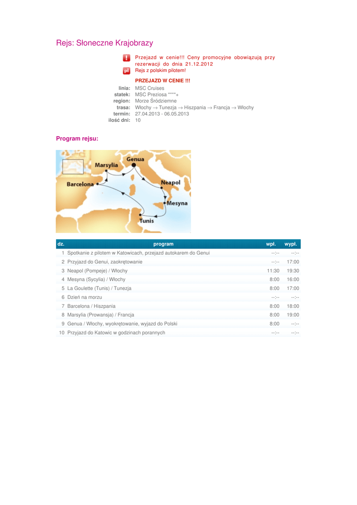 Rejs: Słoneczne Krajobrazy Przejazd w cenie!!! Ceny promocyjne obowiązują przy rezerwacji do dnia 21.12.2012 Rejs z polskim pilotem! linia: statek: region: trasa: termin: ilość dni: PRZEJAZD W CENIE !!! MSC Cruises MSC Preziosa ****+ Morze Śródziemne Włochy → Tunezja → Hiszpania → Francja → Włochy 27.04.2013 - 06.05.2013 10 Program rejsu: dz. program wpł. wypł. 1 Spotkanie z pilotem w Katowicach, przejazd autokarem do Genui --:-- --:-- 2 Przyjazd do Genui, zaokrętowanie --:-- 17:00 3 Neapol (Pompeje) / Włochy 11:30 19:30 4 Mesyna (Sycylia) / Włochy 8:00 16:00 5 La Goulette (Tunis) / Tunezja 8:00 17:00 --:-- --:-- 7 Barcelona / Hiszpania 8:00 18:00 8 Marsylia (Prowansja) / Francja 8:00 19:00 9 Genua / Włochy, wyokrętowanie, wyjazd do Polski 8:00 --:-- --:-- --:-- 6 Dzień na morzu 10 Przyjazd do Katowic w godzinach porannych 27 kwiecień 2013 (sobota) - 6 maj 2013 (poniedziałek) kategoria* kabina wewnętrzna cena katalogowa cena promocyjna 879 ÷ 1.019 549 kabina zewnętrzna z oknem 1.179 ÷ 1.279 669 kabina zewnętrzna z balkonem 1.379 ÷ 1.679 819 3 lub 4 osoba dorosła w kabinie 369 3 lub 4 osoba do 18 lat w kabinie 275 opłaty portowe 125 przejazd autokarem (opcjonalnie) Zobacz pozostałe terminy: 125 W CENIE * Ceny za osobę w EUR w kabinie dwuosobowej 06.04.2013 | 27.04.2013 | 29.06.2013 | 17.08.2013 | 14.09.2013 | 12.10.2013 Informacje dodatkowe: cena za rejs obejmuje: rejs statkiem MSC Preziosa****+; zakwaterowanie w kabinie wybranej kategorii (7 noclegów); serwis bagażowy i kabinowy; wyżywienie – 3 główne posiłki, przekąski między posiłkami, bufet lub przekąski o północy; korzystanie z basenu i innych urządzeń sportowo-rekreacyjnych; udział we wszystkich imprezach organizowanych na statku, przejazd autokarem do Genui, opiekę polskiego pilota. cena nie obejmuje: opłat portowych i podatków, ubezpieczenia KL, NW i bagażu (125 EUR/os.); ewentualnych noclegów w hotelu przed/po rejsie i transferów (na zapytanie); wycieczek fakultatywnych; korzystania z punktów usługowych (pralnia, fotograf, salon piękności i odnowy biologicznej, internet); napojów do obiadów i kolacji, drinków oraz napiwków obowiązkowych dla obsługi statku (ok. 7€/dzień/osobę dorosłą; 3,5€/dzień/dziecko). uwagi: kabiny 3/4 osobowe nie są dostępne we wszystkich kategoriach, a ich liczba jest ograniczona – sprzedaż tylko po potwierdzeniu. Grupa realizowana przy min. 18 osobach. DOJAZD WŁASNY: zniżka - 70 EUR/os. ALL INCLUSIVE (opcja) istnieje możliwość wykupienia pakietu ALL INCLUSIVE obejmującego wybrane napoje alkoholowe i bezalkoholowe dostępne bez ograniczeń we wszystkich barach. Cena pakietu 23 EUR/dzień/ osoba dorosła i 12 EUR/ dzień/ dziecko. Warunkiem skorzystania z pakietu all inclusive jest wykupienie pakietu przez wszystkich pasażerów podróżujących w jednej kabinie na czas całego rejsu.
