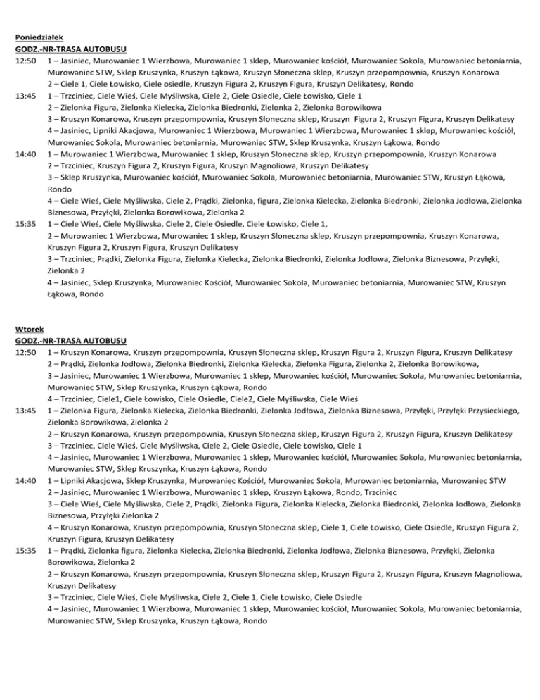 Poniedziałek GODZ.-NR-TRASA AUTOBUSU 12:50 1 – Jasiniec, Murowaniec 1 Wierzbowa, Murowaniec 1 sklep, Murowaniec kościół, Murowaniec Sokola, Murowaniec betoniarnia, Murowaniec STW, Sklep Kruszynka, Kruszyn Łąkowa, Kruszyn Słoneczna sklep, Kruszyn przepompownia, Kruszyn Konarowa 2 – Ciele 1, Ciele Łowisko, Ciele osiedle, Kruszyn Figura 2, Kruszyn Figura, Kruszyn Delikatesy, Rondo 13:45 1 – Trzciniec, Ciele Wieś, Ciele Myśliwska, Ciele 2, Ciele Osiedle, Ciele Łowisko, Ciele 1 2 – Zielonka Figura, Zielonka Kielecka, Zielonka Biedronki, Zielonka 2, Zielonka Borowikowa 3 – Kruszyn Konarowa, Kruszyn przepompownia, Kruszyn Słoneczna sklep, Kruszyn Figura 2, Kruszyn Figura, Kruszyn Delikatesy 4 – Jasiniec, Lipniki Akacjowa, Murowaniec 1 Wierzbowa, Murowaniec 1 Wierzbowa, Murowaniec 1 sklep, Murowaniec kościół, Murowaniec Sokola, Murowaniec betoniarnia, Murowaniec STW, Sklep Kruszynka, Kruszyn Łąkowa, Rondo 14:40 1 – Murowaniec 1 Wierzbowa, Murowaniec 1 sklep, Kruszyn Słoneczna sklep, Kruszyn przepompownia, Kruszyn Konarowa 2 – Trzciniec, Kruszyn Figura 2, Kruszyn Figura, Kruszyn Magnoliowa, Kruszyn Delikatesy 3 – Sklep Kruszynka, Murowaniec kościół, Murowaniec Sokola, Murowaniec betoniarnia, Murowaniec STW, Kruszyn Łąkowa, Rondo 4 – Ciele Wieś, Ciele Myśliwska, Ciele 2, Prądki, Zielonka, figura, Zielonka Kielecka, Zielonka Biedronki, Zielonka Jodłowa, Zielonka Biznesowa, Przyłęki, Zielonka Borowikowa, Zielonka 2 15:35 1 – Ciele Wieś, Ciele Myśliwska, Ciele 2, Ciele Osiedle, Ciele Łowisko, Ciele 1, 2 – Murowaniec 1 Wierzbowa, Murowaniec 1 sklep, Kruszyn Słoneczna sklep, Kruszyn przepompownia, Kruszyn Konarowa, Kruszyn Figura 2, Kruszyn Figura, Kruszyn Delikatesy 3 – Trzciniec, Prądki, Zielonka Figura, Zielonka Kielecka, Zielonka Biedronki, Zielonka Jodłowa, Zielonka Biznesowa, Przyłęki, Zielonka 2 4 – Jasiniec, Sklep Kruszynka, Murowaniec Kościół, Murowaniec Sokola, Murowaniec betoniarnia, Murowaniec STW, Kruszyn Łąkowa, Rondo Wtorek GODZ.-NR-TRASA AUTOBUSU 12:50 1 – Kruszyn Konarowa, Kruszyn przepompownia, Kruszyn Słoneczna sklep, Kruszyn Figura 2, Kruszyn Figura, Kruszyn Delikatesy 2 – Prądki, Zielonka Jodłowa, Zielonka Biedronki, Zielonka Kielecka, Zielonka Figura, Zielonka 2, Zielonka Borowikowa, 3 – Jasiniec, Murowaniec 1 Wierzbowa, Murowaniec 1 sklep, Murowaniec kościół, Murowaniec Sokola, Murowaniec betoniarnia, Murowaniec STW, Sklep Kruszynka, Kruszyn Łąkowa, Rondo 4 – Trzciniec, Ciele1, Ciele Łowisko, Ciele Osiedle, Ciele2, Ciele Myśliwska, Ciele Wieś 13:45 1 – Zielonka Figura, Zielonka Kielecka, Zielonka Biedronki, Zielonka Jodłowa, Zielonka Biznesowa, Przyłęki, Przyłęki Przysieckiego, Zielonka Borowikowa, Zielonka 2 2 – Kruszyn Konarowa, Kruszyn przepompownia, Kruszyn Słoneczna sklep, Kruszyn Figura 2, Kruszyn Figura, Kruszyn Delikatesy 3 – Trzciniec, Ciele Wieś, Ciele Myśliwska, Ciele 2, Ciele Osiedle, Ciele Łowisko, Ciele 1 4 – Jasiniec, Murowaniec 1 Wierzbowa, Murowaniec 1 sklep, Murowaniec kościół, Murowaniec Sokola, Murowaniec betoniarnia, Murowaniec STW, Sklep Kruszynka, Kruszyn Łąkowa, Rondo 14:40 1 – Lipniki Akacjowa, Sklep Kruszynka, Murowaniec Kościół, Murowaniec Sokola, Murowaniec betoniarnia, Murowaniec STW 2 – Jasiniec, Murowaniec 1 Wierzbowa, Murowaniec 1 sklep, Kruszyn Łąkowa, Rondo, Trzciniec 3 – Ciele Wieś, Ciele Myśliwska, Ciele 2, Prądki, Zielonka Figura, Zielonka Kielecka, Zielonka Biedronki, Zielonka Jodłowa, Zielonka Biznesowa, Przyłęki Zielonka 2 4 – Kruszyn Konarowa, Kruszyn przepompownia, Kruszyn Słoneczna sklep, Ciele 1, Ciele Łowisko, Ciele Osiedle, Kruszyn Figura 2, Kruszyn Figura, Kruszyn Delikatesy 15:35 1 – Prądki, Zielonka figura, Zielonka Kielecka, Zielonka Biedronki, Zielonka Jodłowa, Zielonka Biznesowa, Przyłęki, Zielonka Borowikowa, Zielonka 2 2 – Kruszyn Konarowa, Kruszyn przepompownia, Kruszyn Słoneczna sklep, Kruszyn Figura 2, Kruszyn Figura, Kruszyn Magnoliowa, Kruszyn Delikatesy 3 – Trzciniec, Ciele Wieś, Ciele Myśliwska, Ciele 2, Ciele 1, Ciele Łowisko, Ciele Osiedle 4 – Jasiniec, Murowaniec 1 Wierzbowa, Murowaniec 1 sklep, Murowaniec kościół, Murowaniec Sokola, Murowaniec betoniarnia, Murowaniec STW, Sklep Kruszynka, Kruszyn Łąkowa, Rondo Środa GODZ.-NR-TRASA AUTOBUSU 12:50 1 – Kruszyn Konarowa, Kruszyn przepompownia, Kruszyn Słoneczna sklep, Ciele 1, Ciele Łowisko, Ciele Osiedle, Kruszyn Figura 2, Kruszyn Figura, Kruszyn Delikatesy 3 – Murowaniec 1 Wierzbowa, Murowaniec 1 sklep, Murowaniec kościół, Murowaniec Sokola, Murowaniec betoniarnia, Murowaniec STW, Sklep Kruszynka, Kruszyn Łąkowa, Rondo 4 – Ciele Wieś, Ciele Myśliwska, Ciele 2, Prądki, Zielonka Jodłowa, Zielonka Biedronki, Zielonka Kielecka, Zielonka Figura, Zielonka 2, Zielonka Borowikowa 13:45 1 – Kruszyn Konarowa, Kruszyn przepompownia, Kruszyn Słoneczna sklep, Kruszyn Figura 2, Kruszyn Figura, Kruszyn Delikatesy 2 – Zielonka Figura, Zielonka Kielecka, Zielonka Biedronki, Zielonka Jodłowa, Przyłęki, Zielonka 2 3 – Trzciniec, Ciele Wieś, Ciele Myśliwska, Ciele 2, Ciele Łowisko, Ciele Osiedle, Ciele 1 4 – Jasiniec, Murowaniec 1 Wierzbowa, Murowaniec 1 sklep, Murowaniec kościół, Murowaniec Sokola, Murowaniec betoniarnia, Murowaniec STW, Sklep Kruszynka, Kruszyn Łąkowa, Rondo 14:40 1 – Prądki, Zielonka Figura, Zielonka, Kielecka, Zielonka Biedronki,, Zielonka Jodłowa, Zielonka Biznesowa, Przyłęki, Przyłęki Przysieckiego, Zielonka Borowikowa, Zielonka 2 2 – Kruszyn Konarowa, Kruszyn przepompownia, Kruszyn Słoneczna sklep, Kruszyn figura 2, Kruszyn figura, Kruszyn Magnoliowa, Kruszyn Delikatesy 3 – Jasiniec, Sklep Kruszynka, Murowaniec kościół, Murowaniec Sokola, Murowaniec betoniarnia, Murowaniec STW, Rondo 4 – Murowaniec 1 Wierzbowa, Murowaniec 1 sklep, Kruszyn Łąkowa, Ciele 1, Ciele Łowisko, Ciele Osiedle, Ciele 2, Ciele Myśliwska, Ciele Wieś 15:35 1 – Trzciniec, Ciele Wie