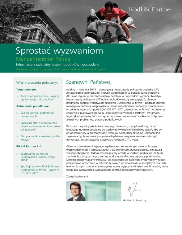 Sprostać wyzwaniom Mandantenbrief Polska Informacje z dziedziny prawa, podatków i gospodarki Wydanie: kwiecień - czerwiec 2014 · www.roedl.de / www.roedl.com/pl W tym wydaniu polecamy: Temat numeru >> Akcyza na gaz ziemny – więcej uprawnionych do zwolnień Aktualności podatkowe >> Więcej kontroli podmiotów powiązanych >> Specjalne strefy ekonomiczne – rewolucyjne orzeczenie w zakresie zezwoleń >> Bieżąca korekta kosztów podatkowych Rödl & Partner info >> Zaproszenie na Forum „Odnawialne Źródła Energii 2014" >> Spotkajmy się w Rödl & Partner: „Samochód w firmie – aspekty CIT, PIT i VAT” Szanowni Państwo, od dnia 1 kwietnia 2014 r. obowiązują nowe zasady odliczania podatku VAT, związanego z czynnościami, których przedmiotem są pojazdy samochodowe. Aktualne regulacje prezentowaliśmy Państwu w poprzednim wydaniu biuletynu. Nowe zasady odliczania VAT od samochodów rodzą szereg pytań, dlatego pragniemy zaprosić Państwa na szkolenia „Samochód w firmie”, podczas których rozwiejemy Państwa wątpliwości, a temat samochodów omówimy kompleksowo w zakresie wszystkich podatków: CIT, PIT i VAT. „Samochód w firmie” to pierwsze szkolenie z planowanego cyklu „Spotkajmy się w Rödl & Partner”. W ramach tego cyklu będziemy Państwu systematycznie proponować spotkania, dotyczące aktualnych problemów prawno-podatkowych. W trosce o wysoką jakość treści naszego biuletynu, zdecydowaliśmy, że od bieżącego numeru będziemy go wydawać kwartalnie. Dołożymy starań, aby był on obszerniejszy, a prezentowane treści jak najbardziej aktualne. Jednocześnie zapewniamy, że na zmiany w prawie będziemy reagować równie szybko jak dotychczas, systematycznie przesyłając Państwu CATL News. Głównym tematem niniejszego wydania jest akcyza na gaz ziemny. Przepisy wprowadzone od 1 listopada 2013 r. dla niektórych przedsiębiorców oznaczają większe obciążenia. Jednak my pragniemy przede wszystkim podkreślić, że teraz zwolnienia z akcyzy na gaz ziemny są dostępne dla szerszej grupy podmiotów. Dlatego podpowiadamy Państwu, jak skorzystać ze zwolnień. Prezentujemy także przełomowe orzeczenie w zakresie zezwoleń na działalność w specjalnych strefach ekonomicznych i zwracamy uwagę na nowe wytyczne Ministerstwa Finansów, które mogą być zapowiedzią wzmożonych kontroli podmiotów powiązanych. Z pozdrowieniami dr Marcin Jamroży Temat numeru >> Akcyza na gaz ziemny – więcej uprawnionych do zwolnień Adrian Maczura, Rödl & Partner Wrocław Tadeusz Piekłowski, Rödl & Partner Wrocław Od 1 listopada 2013 r. obowiązują nowe przepisy w zakresie akcyzy na gaz ziemny i inne paliwa gazowe, które poszerzają katalog wyrobów gazowych objętych akcyzą. Z drugiej strony obejmują większe grono podmiotów uprawnionych do zwolnienia z tego podatku. Bezwarunkowe zwolnienie z akcyzy dla gazu ziemnego, pozostałych węglowodorów gazowych oraz pozostałych paliw opałowych gazowych dla celów opałowych przestało obowiązywać z końcem października 2013 r. Więcej rodzajów gazu objętych akcyzą Zgodnie z nowymi przepisami (Dz.U. z 2013 r., poz. 1231) od 1 listopada 2013 r. obowiązuje akcyza nie tylko na gaz ziemny mokry skroplony (CN 2711 11 00) czy ziemny mokry w stanie gazowym (CN 2711 21 00), lecz także na: węglowy, wodny, generatorowy i podobne gazy o kodzie CN 2705 00 00 oraz pozostałe węglowodory gazowe w stanie gazowym (CN 2711 29 00), tj. metan i pozostałe paliwa opałowe. Jak widać, przepisy obejmują wiele różnych rodzajów gazu, np. koksowniczy, ekspansyjny i gazy resztkowe powstające w ciągach technologicznych nieorganicznych, konwektorowy, wielkopiecowy oraz biogaz. Zgodnie z nowymi przepisami zakłada się, że akcyza jest należna dopiero na etapie ostatniej transakcji poprzedzającej konsumpcję oraz przy zużyciu własnym wyprodukowanych przez siebie wyrobów gazowych. Nowelizacja wprowadziła także dwa rodzaje podmiotów w kontekście obrotu paliwami gazowymi. Są nimi pośredniczący podmiot gazowy (PPG) oraz finalny nabywca gazowy (FNG). >> jest (towarowym) domem maklerskim, nabywającym wyroby gazowe. Sprzedaż paliwa gazowego pośredniczącemu podmiotowi gazowemu nie podlega opodatkowaniu akcyzą. Obowiązek naliczania podatku akcyzowego oraz rozliczania się z właściwym urzędem celnym spoczywa w tym przypadku na odbiorcy. Odbiorca nie musi jednak uiszczać akcyzy, jeżeli wykaże, że jest pośredniczącym podmiotem gazowym. W tym celu powinien powiadomić właściwy urząd celny o zamiarze rozpoczęcia działalności jako pośredniczący podmiot gazowy. Wówczas naczelnik urzędu celnego wyda potwierdzenie przyjęcia takiego powiadomienia. Jeżeli odbiorca dostarczy sprzedawcy poświadczoną za zgodność z oryginałem kopię tego potwierdzenia, wówczas nie podlega opodatkowaniu akcyzą. Jeżeli natomiast nie przedłoży takiego dokumentu, będzie traktowany jako finalny nabywca gazowy i zostanie obciążony podatkiem akcyzowym gazu wg. obowiązujących stawek. Finalny nabywca gazowy Finalnym nabywcą gazowym jest ten, kto nabywa na terytorium kraju, importuje lub nabywa wewnątrzwspólnotowo wyroby gazowe, lub ten, kto posiada wyroby gazowe, uzyskane w sposób inny niż w drodze nabycia, nie będąc jednocześnie pośredniczącym podmiotem gazowym. Sprzedaż paliwa gazowego dla takiego odbiorcy podlega opodatkowaniu akcyzą. Obowiązek naliczania podatku akcyzowego oraz rozliczania się z właściwym urzędem celnym spoczywa na sprzedawcy. Obowiązkiem nabywcy jest złożenie oświadczenia, na jaki cel przeznaczone jest paliwo gazowe. Powyższe oświadczenie jest podstawą do zastosowania właściwej stawki podatkowej lub zwolnienia z akcyzy. Dla kogo zwolnienia z akcyzy Nowelizacja wprowadziła również szeroki katalog zwolnień od akcyzy dla gazu w celach opałowych. Pośredniczący podmiot gazowy Pośredniczący podmiot gazowy to taki, który m.in.: >> >> 2 dokonuje sprzedaży, 