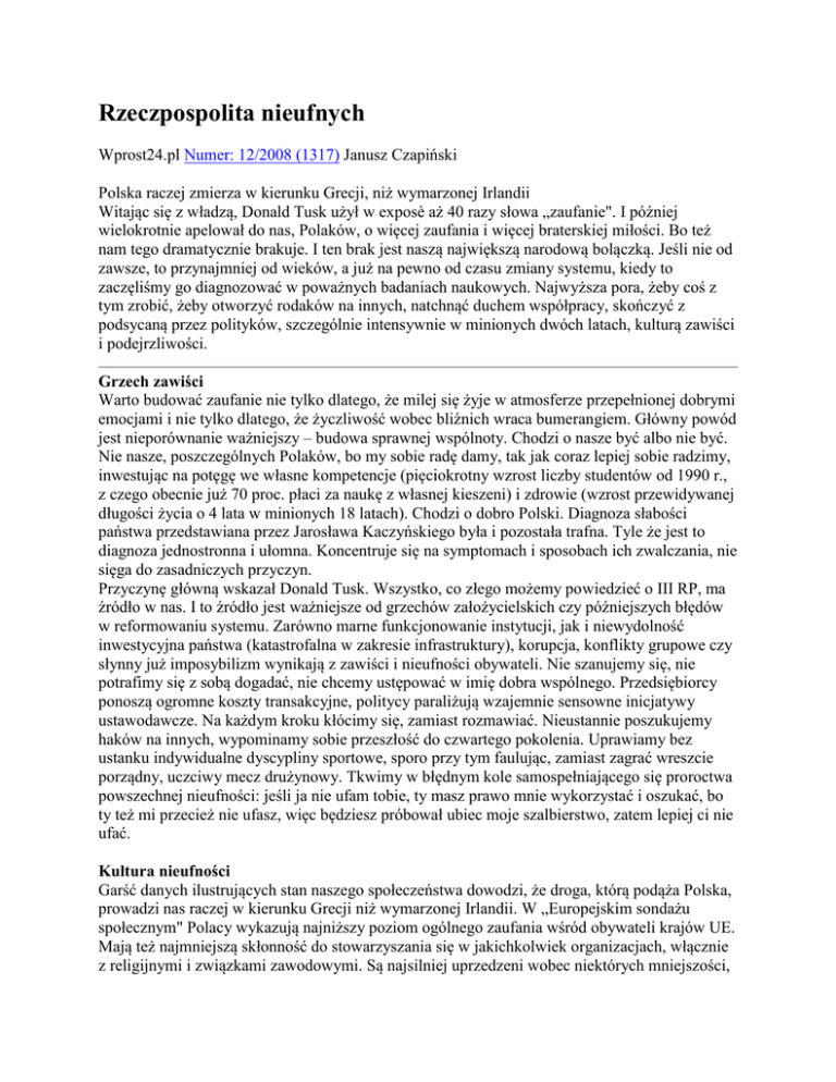 Rzeczpospolita nieufnych Wprost24.pl Numer: 12/2008 (1317) Janusz Czapiński Polska raczej zmierza w kierunku Grecji, niż wymarzonej Irlandii Witając się z władzą, Donald Tusk użył w exposè aż 40 razy słowa „zaufanie". I później wielokrotnie apelował do nas, Polaków, o więcej zaufania i więcej braterskiej miłości. Bo też nam tego dramatycznie brakuje. I ten brak jest naszą największą narodową bolączką. Jeśli nie od zawsze, to przynajmniej od wieków, a już na pewno od czasu zmiany systemu, kiedy to zaczęliśmy go diagnozować w poważnych badaniach naukowych. Najwyższa pora, żeby coś z tym zrobić, żeby otworzyć rodaków na innych, natchnąć duchem współpracy, skończyć z podsycaną przez polityków, szczególnie intensywnie w minionych dwóch latach, kulturą zawiści i podejrzliwości. Grzech zawiści Warto budować zaufanie nie tylko dlatego, że milej się żyje w atmosferze przepełnionej dobrymi emocjami i nie tylko dlatego, że życzliwość wobec bliźnich wraca bumerangiem. Główny powód jest nieporównanie ważniejszy – budowa sprawnej wspólnoty. Chodzi o nasze być albo nie być. Nie nasze, poszczególnych Polaków, bo my sobie radę damy, tak jak coraz lepiej sobie radzimy, inwestując na potęgę we własne kompetencje (pięciokrotny wzrost liczby studentów od 1990 r., z czego obecnie już 70 proc. płaci za naukę z własnej kieszeni) i zdrowie (wzrost przewidywanej długości życia o 4 lata w minionych 18 latach). Chodzi o dobro Polski. Diagnoza słabości państwa przedstawiana przez Jarosława Kaczyńskiego była i pozostała trafna. Tyle że jest to diagnoza jednostronna i ułomna. Koncentruje się na symptomach i sposobach ich zwalczania, nie sięga do zasadniczych przyczyn. Przyczynę główną wskazał Donald Tusk. Wszystko, co złego możemy powiedzieć o III RP, ma źródło w nas. I to źródło jest ważniejsze od grzechów założycielskich czy późniejszych błędów w reformowaniu systemu. Zarówno marne funkcjonowanie instytucji, jak i niewydolność inwestycyjna państwa (katastrofalna w zakresie infrastruktury), korupcja, konflikty grupowe czy słynny już imposybilizm wynikają z zawiści i nieufności obywateli. Nie szanujemy się, nie potrafimy się z sobą dogadać, nie chcemy ustępować w imię dobra wspólnego. Przedsiębiorcy ponoszą ogromne koszty transakcyjne, politycy paraliżują wzajemnie sensowne inicjatywy ustawodawcze. Na każdym kroku kłócimy się, zamiast rozmawiać. Nieustannie poszukujemy haków na innych, wypominamy sobie przeszłość do czwartego pokolenia. Uprawiamy bez ustanku indywidualne dyscypliny sportowe, sporo przy tym faulując, zamiast zagrać wreszcie porządny, uczciwy mecz drużynowy. Tkwimy w błędnym kole samospełniającego się proroctwa powszechnej nieufności: jeśli ja nie ufam tobie, ty masz prawo mnie wykorzystać i oszukać, bo ty też mi przecież nie ufasz, więc będziesz próbował ubiec moje szalbierstwo, zatem lepiej ci nie ufać. Kultura nieufności Garść danych ilustrujących stan naszego społeczeństwa dowodzi, że droga, którą podąża Polska, prowadzi nas raczej w kierunku Grecji niż wymarzonej Irlandii. W „Europejskim sondażu społecznym" Polacy wykazują najniższy poziom ogólnego zaufania wśród obywateli krajów UE. Mają też najmniejszą skłonność do stowarzyszania się w jakichkolwiek organizacjach, włącznie z religijnymi i związkami zawodowymi. Są najsilniej uprzedzeni wobec niektórych mniejszości, na przykład homoseksualistów. Tylko Grekom ustępujemy pod względem niewiary w dobre intencje bliźnich. Inne badania plasują nasz kraj na końcu światowej wręcz stawki pod względem wielkości wolontariatu: świadczenia nieodpłatnej pracy na rzecz potrzebujących. Dane na temat Polski potwierdzają też wyniki krajowych badań – „Polskiego generalnego sondażu społecznego" i „Diagnozy społecznej". Dowodzą one ponadto, że nic się w stopniu uspołecznienia Polaków nie zmieniło od początku transformacji. Cały czas tkwimy w kulturze nieufności i indywidualnej zaradności. Możliwe są dwie ścieżki rozwoju gospodarczego kraju: molekularna i wspólnotowa. Istotą ścieżki molekularnej jest indywidualna konkurencyjność oparta na zasobach intelektualnych, motywacyjnych i symbolicznych (np. prestiż), czyli na tym, co ekonomiści nazywają kapitałem ludzkim. Im więcej umiesz, im jesteś zdrowszy, bardziej motywowany do pracy i bardziej szanowany, tym więcej możesz finansowo osiągnąć. Istotą zaś kapitału społecznego jest konkurencyjność zespołowa oparta na dobrych relacjach członków grupy, czyli na tym, co ekonomiści nazywają kapitałem społecznym, a czego wskaźnikami są m.in. te cechy, których mamy najmniej w Europie, przede wszystkim ogólne zaufanie do ludzi. Większość państw rozwiniętych stosuje obie strategie, z naciskiem – szczególnie w krajach skandynawskich – na drogę wspólnotową: ludzie się kształcą, ale i współpracują, również z instytucjami państwa, a państwo potrafi wykorzystywać umiejętności obywateli i pomnażać wspólne dobro. Polska rozwija się natomiast niemal wyłącznie na ścieżce molekularnej: każdy sobie rzepkę skrobie. Setki badań dowodzą, że kapitał ludzki daje korzyści głównie tym, którzy weń inwestują (kształcą się i dbają o zdrowie). Kapitał społeczny, a zwłaszcza główny jego składnik – zaufanie – nie daje wprawdzie bezpośrednich korzyści temu, kto ufa i jest otwarty na współpracę, może nawet narażać go na straty, ale poprawia jakość życia całej wspólnoty, a tym samym pośrednio obdarowuje również ufających. Zaufanie jest rodzajem obywatelskiego poświęcenia. Gdy ufam, wszyscy mamy się lepiej, choć niekoniecznie ja sam. Rosnący kapitał ludzki zwiększa indywidualne dochody, a państwo bogaci się tylko przy okazji, ściągając z nas haracz podatkowy. W Polsce państwo wzbogacone na obywa