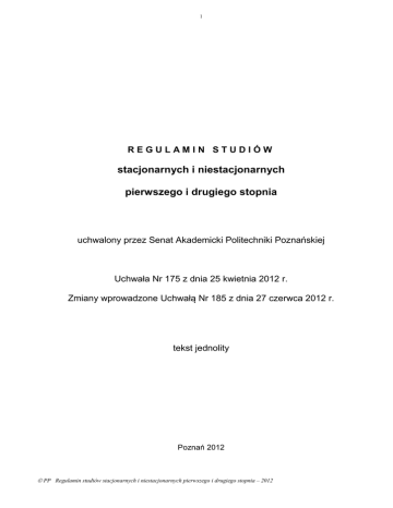 1 REGULAMIN STUDIÓW stacjonarnych i niestacjonarnych pierwszego i drugiego stopnia uchwalony przez Senat Akademicki Politechniki Poznańskiej Uchwała Nr 175 z dnia 25 kwietnia 2012 r. Zmiany wprowadzone Uchwałą Nr 185 z dnia 27 czerwca 2012 r. tekst jednolity Poznań 2012 PP Regulamin studiów stacjonarnych i niestacjonarnych pierwszego i drugiego stopnia – 2012 2 SPIS TREŚCI Str. I. PRZEPISY OGÓLNE .......................................................................... 3 II. ORGANIZACJA STUDIÓW ................................................................ 3 III. PRAWA I OBOWIĄZKI STUDENTA ................................................... 5 IV. ZALICZENIE SEMESTRU ORAZ ROKU STUDIÓW ......................... 9 A. Postanowienia ogólne .................................................................... 9 B. Zaliczenia ....................................................................................... 11 C. Egzaminy ....................................................................................... 11 D. Praktyki .......................................................................................... 12 E. Rygory ............................................................................................ 13 V. URLOPY ............................................................................................. 14 VI. NAGRODY, WYRÓŻNIENIA I KARY ................................................. 14 VII. PRACA DYPLOMOWA ....................................................................... 15 VIII. EGZAMIN DYPLOMOWY ................................................................... 16 IX. PRZEPISY KOŃCOWE ...................................................................... 18 Załącznik – oświadczenie dyplomanta ............................................... 19 Regulamin studiów prowadzonych wspólnie przez Uniwersytet im. Adama Mickiewicza w Poznaniu oraz Politechnikę Poznańską na makrokierunku studiów Bioinformatyka ......................................... 20 Regulamin studiów drugiego stopnia prowadzonych wspólnie przez Wydział Elektroniki i Telekomunikacji Politechniki Poznańskiej, Wydział Informatyki i Gospodarki Elektronicznej Uniwersytetu Ekonomicznego oraz Wydział Fizyki Uniwersytetu im. Adama Mickiewicza na kierunku Techniczne zastosowania Internetu ............................... 21 PP Regulamin studiów stacjonarnych i niestacjonarnych pierwszego i drugiego stopnia – 2012 3 I. PRZEPISY OGÓLNE §1 Regulamin obowiązuje studentów studiów pierwszego i drugiego stopnia oraz nauczycieli akademickich Politechniki Poznańskiej. §2 Zasady przyjęć na studia w Politechnice Poznańskiej określa Senat Uczelni. §3 1. Osoba przyjęta na studia nabywa prawa studenta z chwilą immatrykulacji i złożenia ślubowania. 2. Student otrzymuje legitymację studencką i indeks (jeżeli na danym wydziale prowadzenie dokumentacji przebiegu i wyników studiów obejmuje również indeksy). Indeks jest dokumentem przedstawiającym przebieg oraz wyniki studiów i stanowi własność studenta. 3. Senat Politechniki Poznańskiej, na wniosek dziekana zaopiniowany przez radę wydziału i organ wydziałowego Samorządu Studentów, może ograniczyć, w drodze uchwały, prowadzenie dokumentacji przebiegu i wyników studiów na danym wydziale do protokołów i kart okresowych osiągnięć studenta (zwanych także kartami Europejskiego Systemu Transferu i Akumulacji punktów ECTS). 4. Student jest obowiązany postępować zgodnie z treścią ślubowania i regulaminem studiów. §4 1. Student, po złożeniu egzaminu dyplomowego z wynikiem pozytywnym, otrzymuje dyplom absolwenta Politechniki Poznańskiej. 2. Politechnika Poznańska wydając dyplomy ukończenia studiów nadaje następujące tytuły zawodowe: a) licencjata, b) inżyniera, c) inżyniera architekta, d) magistra, e) magistra inżyniera, f) magistra inżyniera architekta. §5 1. Jedynym reprezentantem ogółu studentów Politechniki Poznańskiej są organy Samorządu Studentów. 2. Uczelniane organizacje studentów, a także działające w uczelni stowarzyszenia zrzeszające wyłącznie studentów lub studentów i nauczycieli akademickich, w zakresie ich statutowej działalności upoważnione są do występowania wobec władz Politechniki Poznańskiej lub organów Samorządu Studentów, w sprawach dotyczących studentów. II. ORGANIZACJA STUDIÓW §6 1. Studia prowadzone są w formie stacjonarnej i niestacjonarnej. 2. Studia niestacjonarne prowadzone są w trybie wieczorowym, zaocznym lub eksternistycznym. PP Regulamin studiów stacjonarnych i niestacjonarnych pierwszego i drugiego stopnia – 2012 4 3. Studia mogą być prowadzone z wykorzystaniem metod i technik kształcenia na odległość. §7 1. Rok akademicki rozpoczyna się nie później niż w pierwszym tygodniu października i kończy nie wcześniej niż w ostatniej dekadzie września i składa się z dwóch semestrów: zimowego i letniego. 2. Każdy semestr studiów obejmuje piętnastotygodniowy okres zajęć dydaktycznych oraz sesję egzaminacyjną. 3. Zajęcia zorganizowane w ostatnim semestrze studiów (dyplomowym) mogą, za zgodą dziekana, zostać zrealizowane w krótszym czasie. 4. Szczegółową organizację roku akademickiego ustala rektor i podaje do wiadomości najpóźniej cztery miesiące przed jego rozpoczęciem. 5. Zajęcia na studiach stacjonarnych i niestacjonarnych prowadzonych w trybie wieczorowym powinny odbywać się w dniach od poniedziałku do piątku, a na studiach niestacjonarnych prowadzonych w trybie zaocznym – w dni zwyczajowo wolne od pracy za wyjątkiem dni ustawowo wolnych od pracy lub po uzgodnieniu ze studentami, również w piątki. 6. Studia eksternistyczne oraz studia prowadzone z wykorzystaniem metod i technik kształcenia na odległość nie są związane terminami szczegółowej organizacji roku akademickiego, o której mowa w § 7 ust. 5. Na tych studiach obowiązuje semestralny sposób rozliczania 