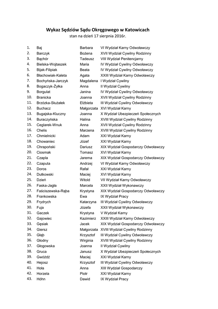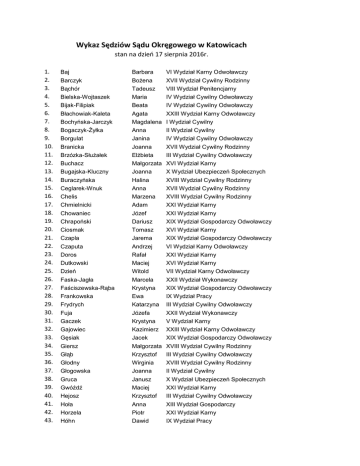 Wykaz Sędziów Sądu Okręgowego w Katowicach stan na dzień 17 sierpnia 2016r. 1. 2. 3. 4. 5. 6. 7. 8. 9. 10. 11. 12. 13. 14. 15. 16. 17. 18. 19. 20. 21. 22. 23. 24. 25. 26. 27. 28. 29. 30. 31. 32. 33. 34. 35. 36. 37. 38. 39. 40. 41. 42. 43. Baj Barbara VI Wydział Karny Odwoławczy Barczyk Bożena XVII Wydział Cywilny Rodzinny Bąchór Tadeusz VIII Wydział Penitencjarny Bielska-Wojtaszek Maria IV Wydział Cywilny Odwoławczy Bijak-Filipiak Beata IV Wydział Cywilny Odwoławczy Błachowiak-Kaleta Agata XXIII Wydział Karny Odwoławczy Bochyńska-Jarczyk Magdalena I Wydział Cywilny Bogaczyk-Żyłka Anna II Wydział Cywilny Borgulat Janina IV Wydział Cywilny Odwoławczy Branicka Joanna XVII Wydział Cywilny Rodzinny Brzózka-Służałek Elżbieta III Wydział Cywilny Odwoławczy Buchacz Małgorzata XVI Wydział Karny Bugajska-Kluczny Joanna X Wydział Ubezpieczeń Społecznych Buraczyńska Halina XVIII Wydział Cywilny Rodzinny Ceglarek-Wnuk Anna XVII Wydział Cywilny Rodzinny Chelis Marzena XVIII Wydział Cywilny Rodzinny Chmielnicki Adam XXI Wydział Karny Chowaniec Józef XXI Wydział Karny Chrapoński Dariusz XIX Wydział Gospodarczy Odwoławczy Ciosmak Tomasz XVI Wydział Karny Czapla Jarema XIX Wydział Gospodarczy Odwoławczy Czaputa Andrzej VI Wydział Karny Odwoławczy Doros Rafał XXI Wydział Karny Dutkowski Maciej XVI Wydział Karny Dzień Witold VII Wydział Karny Odwoławczy Faska-Jagła Marcela XXII Wydział Wykonawczy Faściszewska-Rąba Krystyna XIX Wydział Gospodarczy Odwoławczy Frankowska Ewa IX Wydział Pracy Frydrych Katarzyna III Wydział Cywilny Odwoławczy Fuja Józefa XXII Wydział Wykonawczy Gaczek Krystyna V Wydział Karny Gajowiec Kazimierz XXIII Wydział Karny Odwoławczy Gęsiak Jacek XIX Wydział Gospodarczy Odwoławczy Giersz Małgorzata XVIII Wydział Cywilny Rodzinny Głąb Krzysztof III Wydział Cywilny Odwoławczy Głodny Wirginia XVIII Wydział Cywilny Rodzinny Głogowska Joanna II Wydział Cywilny Gruca Janusz X Wydział Ubezpieczeń Społecznych Gwóźdź Maciej XXI Wydział Karny Hejosz Krzysztof III Wydział Cywilny Odwoławczy Hoła Anna XIII Wydział Gospodarczy Horzela Piotr XXI Wydział Karny Hóhn Dawid IX Wydział Pracy 44. 45. 46. 47. 48. 49. 50. 51. 52. 53. 54. 55. 56. 57. 58. 59. 60. 61. 62. 63. 64. 65. 66. 67. 68. 69. 70. 71. 72. 73. 74. 75. 76. 77. 78. 79. 80. 81. 82. 83. 84. 85. 86. 87. 88. 89. Jagiełło Magdalena V Wydział Karny Janus-Kordeusz Edyta XXI Wydział Karny Jeziorowska Grażyna XIX Wydział Gospodarczy Odwoławczy Jurek-Kozakiewicz Ewa XVII Wydział Cywilny Rodzinny Kałuża-Mirosławska Marzena XVIII Wydział Cywilny Rodzinny Kapuściok Józef XVI Wydział Karny Kardolińska Grażyna III Wydział Cywilny Odwoławczy Kasperek-Jajszczok Urszula VI Wydział Karny Odwoławczy Kawala Bożena X Wydział Ubezpieczeń Społecznych Kawaler Andrzej XI Wydział Ubezpieczeń Społecznych Kiepul Urszula III Wydział Cywilny Odwoławczy Kluszczyńska Zofia XI Wydział Ubezpieczeń Społecznych Klyta Grażyna XVII Wydział Cywilny Rodzinny Knych Izabella II Wydział Cywilny Kowalik Edyta VI Wydział Karny Odwoławczy Kowalska Małgorzata XIX Wydział Gospodarczy Odwoławczy Kowalska Justyna V Wydział Karny Kozera Joanna II Wydział Cywilny Krawczyk Jacek V Wydział Karny Król Barbara III Wydział Cywilny Odwoławczy Krziskowska Katarzyna XIII Wydział Gospodarczy Kubica Bogusława II Wydział Cywilny Kubiś Roman XVI Wydział Karny Kucharska Zofia VII Wydział Karny Odwoławczy Kułach-Sikora Jolanta XVII Wydział Cywilny Rodzinny Kurpas Jan VI Wydział Karny Odwoławczy Lazarek Manfred VII Wydział Karny Odwoławczy Lenc Elżbieta XVIII Wydział Cywilny Rodzinny Lewińska Karolina XVII Wydział Cywilny Rodzinny Lorens Joanna V Wydział Karny Łęcki Sławomir XIV Wydział Gospodarczy Łojan Danuta III Wydział Cywilny Odwoławczy Łukaszewicz Grażyna XVI Wydział Karny Mach Zbigniew XXIII Wydział Karny Odwoławczy Maksym Karina V Wydział Karny Malok Iwona X Wydział Ubezpieczeń Społecznych Marchaj Małgorzata XVIII Wydział Cywilny Rodzinny Markiewicz Krystian IV Wydział Cywilny Odwoławczy Marmol Renata XVI Wydział Karny Marzec Bożena XVII Wydział Cywilny Rodzinny Matuszowicz Adam XIII Wydział Gospodarczy Michalska-Bartosiak Elżbieta XVIII Wydział Cywilny Rodzinny Misina Grzegorz XIX Wydział Gospodarczy Odwoławczy Młynarczyk-Śmieja Agata I Wydział Cywilny Morys-Woźniak Danuta XVII Wydział Cywilny Rodzinny Mruk Elżbieta XI Wydział Ubezpieczeń Społecznych 90. 91. 92. 93. 94. 95. 96. 97. 98. 99. 100. 101. 102. 103. 104. 105. 106. 107. 108. 109. 110. 111. 112. 113. 114. 115. 116. 117. 118. 119. 120. 121. 122. 123. 124. 125. 126. 127. 128. 129. 130. 131. 132. 133. 134. 135. Musialik-Dudzińska Gabriela XXIII Wydział Karny Odwoławczy Nawaro Mariusz XIV Wydział Gospodarczy Niedobecki Igor VI Wydział Karny Odwoławczy Niedopytalski Michał XXIII Wydział Karny Odwoławczy Niemczyk Krzysztof IV Wydział Cywilny Odwoławczy Ogiewa Bartłomiej III Wydział Cywilny Odwoławczy Opitek Tomasz IV Wydział Cywilny Odwoławczy Osterczy-Frączek Ilona VIII Wydział Penitencjarny Ott Gabriela III Wydział Cywilny Odwoławczy Owczarek Damian V Wydział Karny Parma Marian VIII Wydział Penitencjarny Pasieka-Mrochem Dorota XXII Wydział Wykonawczy Pastuszka Dorota XVI Wydział Karny Petri Anna X Wydział Ubezpieczeń Społecznych Pieczyrak-Pisulińska Aneta II Wydział Cywilny Pisarek Piotr XVI Wydział Karny Polko Jolanta I Wydział Cywilny Popielarczyk Bogdan III Wydział Cywilny Odwoławczy Postawa-Gwóźdź Monika VI Wydział Karny Odwoławczy Powroźnik Halina XVI Wydział Karny Przybyła Elżbieta XVI Wydział Karny Przybyło Arkadiusz XIII Wydział Gospodarczy Radwan Zbigniew VII Wydział Karny Odwoławczy Report-Bobrzyńska Gabriela XIII Wydział Gospodarczy Reszczyńska-Łoboda Barbara X Wydział Ubezpieczeń Społecznych Roszkowski Michał VII Wydział Karny Odwoławczy Rumińska Jagna VI Wydział Karny Odwoła