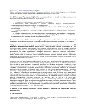 Kościoły i inne związki wyznaniowe Sprawy wynikające ze stosunków pomiędzy Państwem a kościołami i innymi związkami wyznaniowymi należą do zadań Departamentu Wyznań Religijnych oraz Mniejszości Narodowych i Etnicznych. Art. 25 Konstytucji Rzeczypospolitej Polskiej wyznacza podstawowe zasady określające status prawny kościołów i innych związków wyznaniowych. Są to zasady: 1. równouprawnienia kościołów i innych związków wyznaniowych; 2. bezstronności władz publicznych w sprawach przekonań religijnych, światopoglądowych i filozoficznych oraz swobody ich wyrażania w życiu publicznym; 3. poszanowania autonomii i wzajemnej niezależności państwa oraz kościołów i innych związków wyznaniowych; 4. współdziałania państwa z kościołami i innymi związkami wyznaniowymi dla dobra człowieka i dobra wspólnego; 5. regulacji stosunków między państwem a kościołami i innymi związkami wyznaniowymi w drodze ustaw uchwalonych na podstawie umów dwustronnych zawartych pomiędzy Radą Ministrów a właściwymi przedstawicielami tych kościołów i innych związków wyznaniowych. Zasady te zapewniają kościołom oraz innym związkom wyznaniowym swobodne i owocne realizowanie funkcji religijnych w społeczeństwie, możliwość zaspokajania potrzeb religijnych i rozwoju duchowego ich wyznawców. Wyżej wymienione zasady ściśle łączą się z wolnością sumienia i wyznania, zagwarantowaną w art. 53 Konstytucji Rzeczypospolitej Polskiej, z której wynika szereg uprawnień, zarówno dla jednostek, jak i dla kościołów i innych związków wyznaniowych. Konstytucja nie definiuje wolności sumienia, która jest wolnością wewnętrzną (psychiczną, uczuciową) jednostki. Obejmuje swoim zakresem uprawnienia do swobodnego wyboru, kształtowania czy zmiany światopoglądu, przekonań filozoficznych, religijnych, moralnych, obyczajowych. Urzeczywistnienie tych uprawnień może przejawiać się zarówno w formie działania, jak i określonej postawy. Norma konstytucyjna nie ustanawia, jedynie potwierdza wolność sumienia, bowiem sfera ta, pozostająca wewnętrzną (autonomiczną) sprawą jednostki, nie podlega kompetencji państwa. Zadaniem państwa jest jedynie równa ochrona podmiotów tej wolności. Jednostka, wolna w swoich wyborach i postawach, ze swej natury dąży do uzewnętrzniania własnych myśli, poglądów czy przekonań, także w sprawach religii. Dlatego też Konstytucja w art. 53 ust. 2 bardziej szczegółowo reguluje wolność religii (wyznania), zapewniając jednostkom – w aspekcie pozytywnym – prawo do wyboru i uzewnętrzniania, indywidualnie lub z innymi, publicznie lub prywatnie, swojej religii, poprzez uprawianie kultu i modlitwę, uczestniczenie w obrzędach, praktykowanie i nauczanie; prawo osób wierzących do korzystania z posługi religijnej tam gdzie się znajdują; prawo rodziców do zapewnienia dzieciom wychowania i nauczania moralnego i religijnego zgodnie ze swoimi przekonaniami (art. 53 ust. 3 Konstytucji), z zastrzeżeniem art. 48 ust. 1 Konstytucji, który nakazuje uwzględniać wolność religijną dziecka; prawo do odmowy służby wojskowej ze względu na przekonania religijne (art. 85 ust. 3 Konstytucji). W aspekcie negatywnym wolność religii polega na zakazie zmuszania do uczestniczenia lub do nieuczestniczenia w praktykach religijnych oraz do ujawniania swojego światopoglądu, przekonań religijnych lub wyznania (art. 53 ust. 6 i 7 Konstytucji). Konstytucja wylicza przykładowe uprawnienia związane z działalnością kościołów i innych związków wyznaniowych, takie jak: prawo do organizowania obrzędów i uroczystości religijnych, posiadania świątyń i innych miejsc kultu (art. 53 ust. 2 Konstytucji), prawo kościołów i innych związków o uregulowanej sytuacji prawnej do nauczania religii w szkole (art. 53 ust. 4 Konstytucji), a także prawo do występowania ze skargami i wnioskami do Trybunału Konstytucyjnego (art. 79 i art. 191 Konstytucji). I. Kościoły i inne związki wyznaniowe, których stosunki z Państwem są uregulowane ustawami partykularnymi. 1. Sytuacja prawna. Na terytorium Rzeczypospolitej Polskiej działa 15 kościołów i innych związków wyznaniowych, których stosunki z Państwem są uregulowane odrębnymi aktami prawnymi. Są to: 1. Kościół Katolicki w Rzeczypospolitej Polskiej – Konkordat między Stolicą Apostolską i Rzeczypospolitą Polską podpisany w Warszawie dnia 28 lipca 1993 r. (Dz. U. z 1998 r. Nr 51, poz. 318), zwany dalej „Konkordatem”, oraz ustawa z dnia 17 maja 1989 r. o stosunku Państwa do Kościoła Katolickiego w Rzeczypospolitej Polskiej (Dz. U. Nr 29, poz. 154, z późn. zm.), zwana dalej „ustawą katolicką”; 2. Polski Autokefaliczny Kościół Prawosławny – ustawa z dnia z dnia 4 lipca 1991 r. o stosunku Państwa do Polskiego Autokefalicznego Kościoła Prawosławnego (Dz. U. Nr 66, poz. 287, z późn. zm.); 3. Kościół Ewangelicko-Augsburski w Rzeczypospolitej Polskiej – ustawa z dnia 13 maja 1994 r. o stosunku Państwa do Kościoła Ewangelicko-Augsburskiego w Rzeczypospolitej Polskiej (Dz. U. Nr 73, poz. 323, z późn. zm.); 4. Kościół Ewangelicko-Reformowany w Rzeczypospolitej Polskiej – ustawa z dnia 13 maja 1994 r. o stosunku Państwa do Kościoła Ewangelicko-Reformowanego w Rzeczypospolitej Polskiej (Dz. U. Nr 73, poz. 324, z późn. zm.); 5. Kościół Ewangelicko-Metodystyczny w Rzeczypospolitej Polskiej – ustawa z dnia 30 czerwca 1995 r. o stosunku Państwa do Kościoła Ewangelicko-Metodystycznego w Rzeczypospolitej Polskiej (Dz. U. Nr 97, poz. 479, z późn. zm.); 6. Kościół Chrześcijan Baptystów w Rzeczypospolitej Polskiej – ustawa z dnia 30 czerwca 1995 r. o stosunku Państwa do Kościoła Chrześcijan Baptystów w Rzeczypospolitej Polskiej (Dz. U. Nr 97, poz. 480, z późn. zm.); 7. Kościół Adwentystów Dnia Siódmego w Rzeczypospolitej Polskiej – ustawa z dnia 30 czerwca 1995 r. o stosunku Państwa do K