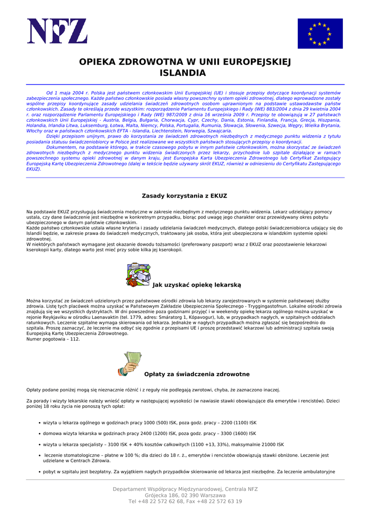 OPIEKA ZDROWOTNA W UNII EUROPEJSKIEJ ISLANDIA Od 1 maja 2004 r. Polska jest państwem członkowskim Unii Europejskiej (UE) i stosuje przepisy dotyczące koordynacji systemów zabezpieczenia społecznego. Każde państwo członkowskie posiada własny powszechny system opieki zdrowotnej, dlatego wprowadzone zostały wspólne przepisy koordynujące zasady udzielania świadczeń zdrowotnych osobom uprawnionym na podstawie ustawodawstw państw członkowskich. Zasady te określają przede wszystkim: rozporządzenie Parlamentu Europejskiego i Rady (WE) 883/2004 z dnia 29 kwietnia 2004 r. oraz rozporządzenie Parlamentu Europejskiego i Rady (WE) 987/2009 z dnia 16 września 2009 r. Przepisy te obowiązują w 27 państwach członkowskich Unii Europejskiej - Austria, Belgia, Bułgaria, Chorwacja, Cypr, Czechy, Dania, Estonia, Finlandia, Francja, Grecja, Hiszpania, Holandia, Irlandia Litwa, Luksemburg, Łotwa, Malta, Niemcy, Polska, Portugalia, Rumunia, Słowacja, Słowenia, Szwecja, Węgry, Wielka Brytania, Włochy oraz w państwach członkowskich EFTA - Islandia, Liechtenstein, Norwegia, Szwajcaria. Dzięki przepisom unijnym, prawo do korzystania ze świadczeń zdrowotnych niezbędnych z medycznego punktu widzenia z tytułu posiadania statusu świadczeniobiorcy w Polsce jest realizowane we wszystkich państwach stosujących przepisy o koordynacji. Dokumentem, na podstawie którego, w trakcie czasowego pobytu w innym państwie członkowskim, można skorzystać ze świadczeń zdrowotnych niezbędnych z medycznego punktu widzenia świadczonych przez lekarzy, przychodnie lub szpitale działające w ramach powszechnego systemu opieki zdrowotnej w danym kraju, jest Europejska Karta Ubezpieczenia Zdrowotnego lub Certyfikat Zastępujący Europejską Kartę Ubezpieczenia Zdrowotnego (dalej w tekście będzie używany skrót EKUZ, również w odniesieniu do Certyfikatu Zastępującego EKUZ). Zasady korzystania z EKUZ Na podstawie EKUZ przysługują świadczenia medyczne w zakresie niezbędnym z medycznego punktu widzenia. Lekarz udzielający pomocy ustala, czy dane świadczenie jest niezbędne w konkretnym przypadku, biorąc pod uwagę jego charakter oraz przewidywany okres pobytu ubezpieczonego w danym państwie członkowskim. Każde państwo członkowskie ustala własne kryteria i zasady udzielania świadczeń medycznych, dlatego polski świadczeniobiorca udający się do Islandii będzie, w zakresie prawa do świadczeń medycznych, traktowany jak osoba, która jest ubezpieczona w islandzkim systemie opieki zdrowotnej. W niektórych państwach wymagane jest okazanie dowodu tożsamości (preferowany paszport) wraz z EKUZ oraz pozostawienie lekarzowi kserokopii karty, dlatego warto jest mieć przy sobie kilka jej kserokopii. Jak uzyskać opiekę lekarską Można korzystać ze świadczeń udzielonych przez państwowe ośrodki zdrowia lub lekarzy zarejestrowanych w systemie państwowej służby zdrowia. Listę tych placówek można uzyskać w Państwowym Zakładzie Ubezpieczenia Społecznego - Tryggingastofnun. Lokalne ośrodki zdrowia znajdują się we wszystkich dystryktach. W dni powszednie poza godzinami przyjęć i w weekendy opiekę lekarza ogólnego można uzyskać w rejonie Reykjaviku w ośrodku Laenavaktin (tel. 1779, adres: Smáratorg 1, Kópavogur), lub, w przypadkach nagłych, w szpitalnych oddziałach ratunkowych. Leczenie szpitalne wymaga skierowania od lekarza. Jednakże w nagłych przypadkach można zgłaszać się bezpośrednio do szpitala. Proszę zaznaczyć, że leczenie ma odbyć się zgodnie z przepisami UE i proszę przedstawić lekarzowi lub administracji szpitala swoją Europejską Kartę Ubezpieczenia Zdrowotnego. Numer pogotowia – 112. Opłaty za świadczenia zdrowotne Opłaty podane poniżej mogą się nieznacznie różnić i z reguły nie podlegają zwrotowi, chyba, że zaznaczono inaczej. Za porady i wizyty lekarskie należy wnieść opłaty w następującej wysokości (w nawiasie stawki obowiązujące dla emerytów i rencistów). Dzieci poniżej 18 roku życia nie ponoszą tych opłat: wizyta u lekarza ogólnego w godzinach pracy 1000 (500) ISK, poza godz. pracy – 2200 (1100) ISK domowa wizyta lekarska w godzinach pracy 2400 (1200) ISK, poza godz. pracy – 3300 (1600) ISK wizyta u lekarza specjalisty – 3100 ISK + 40% kosztów całkowitych (1100 +13, 33%), maksymalnie 21000 ISK leczenie stomatologiczne – płatne w 100 %; dla dzieci do 18 r. ż., emerytów i rencistów obowiązują stawki obniżone. Leczenie jest udzielane w Centrach Zdrowia. pobyt w szpitalu jest bezpłatny. Za wyjątkiem nagłych przypadków skierowanie od lekarza jest niezbędne. Za leczenie ambulatoryjne Departament Współpracy Międzynarodowej, Centrala NFZ Grójecka 186, 02 390 Warszawa Tel +48 22 572 62 68, Fax +48 22 572 63 19 będziecie państwo obciążeni kosztami o wysokości 4000 ISK transport medyczny jest płatny w wysokości 4000 (2000) ISK Odpłatność za leki jest zróżnicowana i wynosi od 0 do 100%. Jeśli istnieje tańszy lek o tym samym działaniu, co lek przepisany na recepcie, należy pokryć różnicę ich cen. Trzeba okazać EKUZ oraz receptę, w przypadku nieokazania karty EKUZ zostaniecie państwo obciążeni pełnymi kosztami. Transport powrotny do Polski jest generalnie opłacany przez pacjenta. UWAGA! EKUZ nie zapewnia pokrycia kosztów transportu medycznego do Polski oraz obowiązujących w Islandii opłat za świadczenia medyczne, dlatego aby uniknąć obciążenia tymi kosztami, wskazane jest wykupienie dodatkowego prywatnego ubezpieczenia. Recepty Uprawnionym do wystawiania recepty objętej refundacją jest lekarz zarejestrowany w systemie państwowej służby zdrowia. Leczenie prywatne Korzystając ze świadczeń lekarza nieposiadającego umowy z kasą chorych, należy opłacić jego honorarium. Dokumenty niezbędne do uzyskania zwrotu poniesionych kosztów Oryginały rachunków, dowodów zapłaty. O zwrot części kosztów leczenia stomatologicznego można zwrócić 