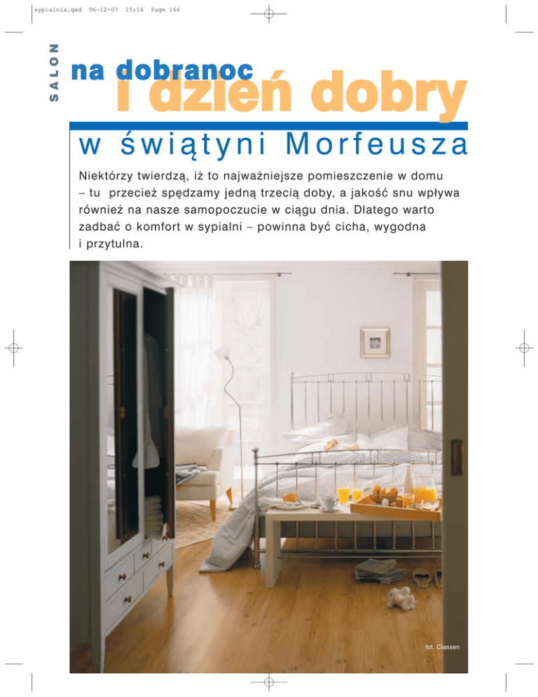 SALON sypialnia.qxd 06-12-07 15:16 Page 166 na dobranoc i dzień dobry w świątyni Morfeusza Niektórzy twierdzą, iż to najważniejsze pomieszczenie w domu – tu przecież spędzamy jedną trzecią doby, a jakość snu wpływa również na nasze samopoczucie w ciągu dnia. Dlatego warto zadbać o komfort w sypialni – powinna być cicha, wygodna i przytulna. fot. Classen sypialnia.qxd 06-12-07 15:16 Page 167 Sypialnię urządzamy zwykle na piętrze – w strefie nocnej domu. Dobrze, gdy usytuowana jest od strony ogrodu, by odgłosy z ulicy nie zakłócały snu domowników. Hałasy domowe wyciszą pełne drzwi, wykładzina dywanowa, wyściełany zagłówek i grube zasłony w oknie. Gdy okna sypialni wychodzą na stronę wschodnią – poranne słońce doda nam energii i pozytywnie nastawi do nowego dnia. Jeśli lubimy dłużej pospać, pomogą nam ciemne zasłony lub żaluzje. Natomiast światło w dobrze nasłonecznionych pokojach południowych i zachodnich przyda się w sypialni, w której będziemy spędzali więcej czasu – to także idealne miejsce na pokój dla dzieci i nastolatków. Jeśli to tylko możliwe, zaplanujmy przy sypialni garderobę lub szafą z suwanymi drzwiami zabudujmy nawet całą ścianę. Bardzo modnym i wygodnym rozwiązaniem jest umieszczenie przy sypialni małżeńskiej – łazienki. 1 ZDROWY SEN fot. IKEA 80 cm do 120 cm. Długość to zwykle 2 m. W sypialni dwuosobowej warto zapewnić dostęp do łóżka z obu stron – wygodnie będzie wtedy i wstawać i ścielić. Stawiamy je zagłówkiem przy ścianie, zostawiając z obu stron odstęp od ściany minimum 80 cm. Dobrze obok łóżka 2 postawić dwie szafki nocne, by każdy miał swoje miejsce na szklankę, książkę czy zegarek. Do czytania w łóżku wygodne będą lampy ruchome, na przegubach. Snop światła powinien być tak skierowany, by padał na kartki czytanej książki, a nie oślepiał drugiej osoby. MATERAC NA MIARĘ Szalenie ważnym elementem łóżka jest materac. Zły – to przyczyna niewyspania i bólów kręgosłupa. Najlepiej się śpi na materacach sprężystych, dostosowujących się do kształtów ciała – ani za twardych, ani za miękkich. Na dobrym materacu kręgosłup osoby ! 1 Łóżko z piękną metalową ramą z ozdobnym zagłówkiem i zanóżkiem. Do stylu „wiejskiej izby” pasują: wiklinowe pojemniki na pościel, tkane 167 chodniczki i drewniana szafa fot. Estima ! 2 Sypialnia „telewizyjna” z niskim łóżkiem i niską lampą na dłuuugim kablu 2007 Po pierwsze musimy wybrać łóżko. Kanapy, sofy i narożniki doskonale sprawdzą się w salonie, jako zapasowe spanie dla gości. Ale do sypialni, jeśli tylko mamy dość dużo miejsca, wybierzmy – materac z ramą. Zapewnia on największą wygodę i w każdej chwili gotowy jest przyjąć nas na małe polegiwanie. Łóżko nie może być za małe. Szerokość łóżka dwuosobowego wynosi od 140 cm do nawet 200 cm, a jednoosobowego – od sypialnia.qxd 06-12-07 15:16 Page 168 3 fot. IKEA leżącej na boku powinien być prosty, a przy leżeniu na wznak zachować naturalny kształt litery „S”. Najlepiej przed zakupem sprawdzić go wykonując prosty test. Wystarczy położyć się na plecach i włożyć dłoń pod odcinek lędźwiowy kręgosłupa – ręka powinna wejść z lekkim oporem. Jeśli materac jest za twardy – dłoń nie dotknie pleców, jeśli zabraknie jej miejsca – jest za miękki. W nowoczesnych, przyjaznych sklepach meblarskich potencjalni klienci „przymierzający” się do materacy są mile widziani. Materace mogą być wykonane z pianki poliuretanowej – są dosyć miękkie, a znajdujące się w nich tysiące pęcherzyków ułatwiają cyrkulację powietrza i wilgoci. Te z pianki termoplastycznej, która zmienia swą elastyczność w zależności od temperatury, dostosowują się idealnie do kształtu ciała, a ich porowata struktura pobudza krążenie krwi. Materace ze sprężynami w kieszonkach bardzo dobrze podpierają poszczególne części ciała, dopasowując się do kształtów śpiącego i nie przeszkadzając w krążeniu krwi. Lateksowe – podtrzymują ciało punktowo, co pozwala im idealnie dopasować się, zapewniając przy tym właściwe krążenie. Alergicy mogą wybrać materac zabezpieczony specjalną substancją, dzięki której nie osadzają się na nim roztocza, bakterie oraz grzyby. Z kolei dodatek włókien węglowych zapobiega gromadze4 fot. Komandor sypialnia.qxd 06-12-07 15:17 Page 169 fot. Velux 7 5 niu się elektryczności statycznej, a tym samym zbieraniu się kurzu – siedliska roztoczy. Oprócz materaca potrzebny będzie jeszcze stelaż. Najlepsze mają wydzielone strefy twardości – nawet siedem – dzięki czemu pracują synchronicznie z materacem wspomagając jego działanie. Bywają stelaże fot. S. Kasper z regulowaną wysokością podparcia – niezależnie górną (głowa i plecy) oraz dolną (nogi). Można podnosić je ręcznie lub przy pomocy silników elektrycznych. RAMA, RAMA Styl i wygląd łóżek zależy przede wszystkim od zagłówków i zanóżków. W ramach 6 drewnianych mogą być rzeźbione, pokryte reliefami, łączone z rattanem lub wikliną. Mogą mieć kolor naturalny lub być pokryte bejcą lub lakierem na różne wybarwienia. Bardzo efektowne są ramy metalowe z np. ręcznie kutego żelaza, które mogą być zdobione rzeźbami, kulami itp. Zagłówki mogą też być miękkie, wyściełane różnymi obiciami. ! 3 Piękna, bardzo konsekwentna kolorystycznie jednoosobowa sypialnia – oryginalne łóżko z trójstronnym „ogrodzeniem” ! 4 Rewia mody – przy sypialni wygodnie jest umieścić dużą garderobę ! 5 Nawet na niewysokim poddaszu możemy urządzić sypialnię pełną przestrzeni i światła, ale lepiej zrezygnować z ramy i materac położyć wprost na podłodze ! 6 Sypialnia małżeńska z łazienką – naprawdę warto! ! 7 Bardzo praktyczne oświetlenie łóżka – punktowa lampka oświetla tylko poduszkę czytającej