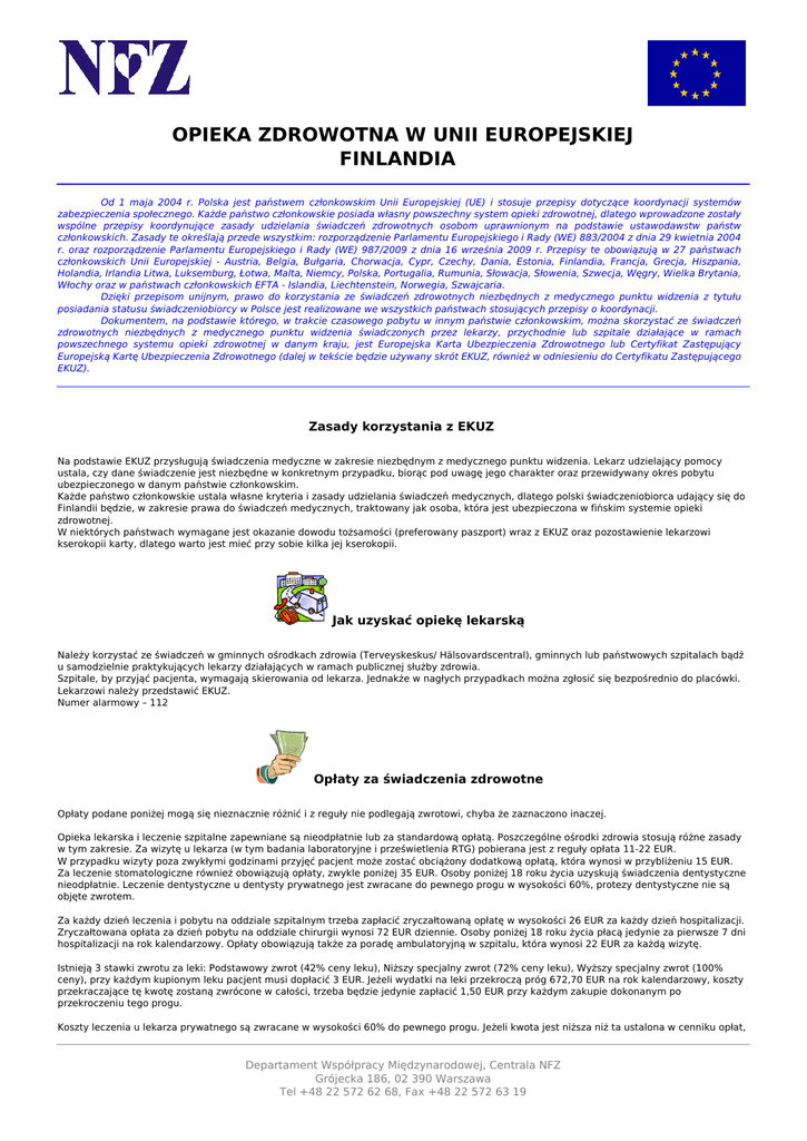 OPIEKA ZDROWOTNA W UNII EUROPEJSKIEJ FINLANDIA Od 1 maja 2004 r. Polska jest państwem członkowskim Unii Europejskiej (UE) i stosuje przepisy dotyczące koordynacji systemów zabezpieczenia społecznego. Każde państwo członkowskie posiada własny powszechny system opieki zdrowotnej, dlatego wprowadzone zostały wspólne przepisy koordynujące zasady udzielania świadczeń zdrowotnych osobom uprawnionym na podstawie ustawodawstw państw członkowskich. Zasady te określają przede wszystkim: rozporządzenie Parlamentu Europejskiego i Rady (WE) 883/2004 z dnia 29 kwietnia 2004 r. oraz rozporządzenie Parlamentu Europejskiego i Rady (WE) 987/2009 z dnia 16 września 2009 r. Przepisy te obowiązują w 27 państwach członkowskich Unii Europejskiej - Austria, Belgia, Bułgaria, Chorwacja, Cypr, Czechy, Dania, Estonia, Finlandia, Francja, Grecja, Hiszpania, Holandia, Irlandia Litwa, Luksemburg, Łotwa, Malta, Niemcy, Polska, Portugalia, Rumunia, Słowacja, Słowenia, Szwecja, Węgry, Wielka Brytania, Włochy oraz w państwach członkowskich EFTA - Islandia, Liechtenstein, Norwegia, Szwajcaria. Dzięki przepisom unijnym, prawo do korzystania ze świadczeń zdrowotnych niezbędnych z medycznego punktu widzenia z tytułu posiadania statusu świadczeniobiorcy w Polsce jest realizowane we wszystkich państwach stosujących przepisy o koordynacji. Dokumentem, na podstawie którego, w trakcie czasowego pobytu w innym państwie członkowskim, można skorzystać ze świadczeń zdrowotnych niezbędnych z medycznego punktu widzenia świadczonych przez lekarzy, przychodnie lub szpitale działające w ramach powszechnego systemu opieki zdrowotnej w danym kraju, jest Europejska Karta Ubezpieczenia Zdrowotnego lub Certyfikat Zastępujący Europejską Kartę Ubezpieczenia Zdrowotnego (dalej w tekście będzie używany skrót EKUZ, również w odniesieniu do Certyfikatu Zastępującego EKUZ). Zasady korzystania z EKUZ Na podstawie EKUZ przysługują świadczenia medyczne w zakresie niezbędnym z medycznego punktu widzenia. Lekarz udzielający pomocy ustala, czy dane świadczenie jest niezbędne w konkretnym przypadku, biorąc pod uwagę jego charakter oraz przewidywany okres pobytu ubezpieczonego w danym państwie członkowskim. Każde państwo członkowskie ustala własne kryteria i zasady udzielania świadczeń medycznych, dlatego polski świadczeniobiorca udający się do Finlandii będzie, w zakresie prawa do świadczeń medycznych, traktowany jak osoba, która jest ubezpieczona w fińskim systemie opieki zdrowotnej. W niektórych państwach wymagane jest okazanie dowodu tożsamości (preferowany paszport) wraz z EKUZ oraz pozostawienie lekarzowi kserokopii karty, dlatego warto jest mieć przy sobie kilka jej kserokopii. Jak uzyskać opiekę lekarską Należy korzystać ze świadczeń w gminnych ośrodkach zdrowia (Terveyskeskus/ Hälsovardscentral), gminnych lub państwowych szpitalach bądź u samodzielnie praktykujących lekarzy działających w ramach publicznej służby zdrowia. Szpitale, by przyjąć pacjenta, wymagają skierowania od lekarza. Jednakże w nagłych przypadkach można zgłosić się bezpośrednio do placówki. Lekarzowi należy przedstawić EKUZ. Numer alarmowy – 112 Opłaty za świadczenia zdrowotne Opłaty podane poniżej mogą się nieznacznie różnić i z reguły nie podlegają zwrotowi, chyba że zaznaczono inaczej. Opieka lekarska i leczenie szpitalne zapewniane są nieodpłatnie lub za standardową opłatą. Poszczególne ośrodki zdrowia stosują różne zasady w tym zakresie. Za wizytę u lekarza (w tym badania laboratoryjne i prześwietlenia RTG) pobierana jest z reguły opłata 11-22 EUR. W przypadku wizyty poza zwykłymi godzinami przyjęć pacjent może zostać obciążony dodatkową opłatą, która wynosi w przybliżeniu 15 EUR. Za leczenie stomatologiczne również obowiązują opłaty, zwykle poniżej 35 EUR. Osoby poniżej 18 roku życia uzyskują świadczenia dentystyczne nieodpłatnie. Leczenie dentystyczne u dentysty prywatnego jest zwracane do pewnego progu w wysokości 60%, protezy dentystyczne nie są objęte zwrotem. Za każdy dzień leczenia i pobytu na oddziale szpitalnym trzeba zapłacić zryczałtowaną opłatę w wysokości 26 EUR za każdy dzień hospitalizacji. Zryczałtowana opłata za dzień pobytu na oddziale chirurgii wynosi 72 EUR dziennie. Osoby poniżej 18 roku życia płacą jedynie za pierwsze 7 dni hospitalizacji na rok kalendarzowy. Opłaty obowiązują także za poradę ambulatoryjną w szpitalu, która wynosi 22 EUR za każdą wizytę. Istnieją 3 stawki zwrotu za leki: Podstawowy zwrot (42% ceny leku), Niższy specjalny zwrot (72% ceny leku), Wyższy specjalny zwrot (100% ceny), przy każdym kupionym leku pacjent musi dopłacić 3 EUR. Jeżeli wydatki na leki przekroczą próg 672,70 EUR na rok kalendarzowy, koszty przekraczające tę kwotę zostaną zwrócone w całości, trzeba będzie jedynie zapłacić 1,50 EUR przy każdym zakupie dokonanym po przekroczeniu tego progu. Koszty leczenia u lekarza prywatnego są zwracane w wysokości 60% do pewnego progu. Jeżeli kwota jest niższa niż ta ustalona w cenniku opłat, Departament Współpracy Międzynarodowej, Centrala NFZ Grójecka 186, 02 390 Warszawa Tel +48 22 572 62 68, Fax +48 22 572 63 19 zwrot opiera się na kosztach zapłaconych lekarzowi. W prywatnym zakładzie opieki zdrowotnej udział własny pacjenta wynosi 13,46 EUR. Do ustalonego progu jest zwracane 75% poniesionych kosztów. Za transport sanitarny obowiązuje zryczałtowana opłata w wysokości 9,25 EUR. Transport powrotny do Polski jest generalnie opłacany przez pacjenta. UWAGA! EKUZ nie zapewnia pokrycia kosztów transportu medycznego do Polski oraz obowiązujących w Finlandii opłat za świadczenia medyczne, dlatego aby uniknąć obciążenia tymi kosztami, wskazane jest wykupienie dodatkowego prywatnego ubezpieczenia. Recepty Każdy lekarz jest uprawnionym do wystawienia recepty objętej refundacją. Leczenie pr