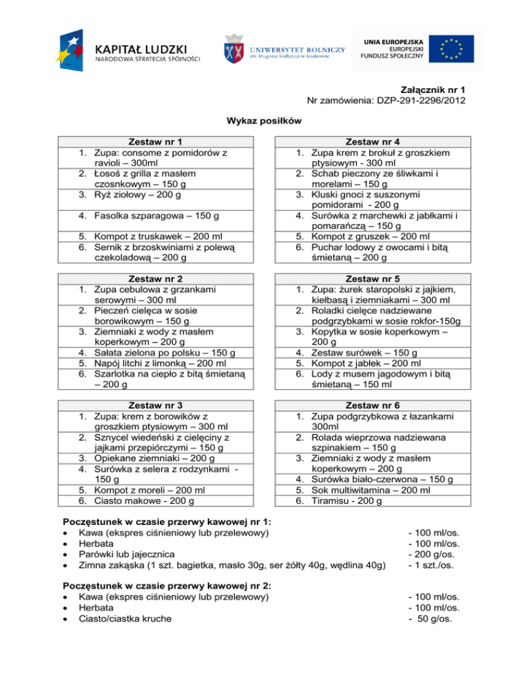 Załącznik nr 1 Nr zamówienia: DZP-291-2296/2012 Wykaz posiłków Zestaw nr 1 1. Zupa: consome z pomidorów z ravioli – 300ml 2. Łosoś z grilla z masłem czosnkowym – 150 g 3. RyŜ ziołowy – 200 g 5. Kompot z truskawek – 200 ml 6. Sernik z brzoskwiniami z polewą czekoladową – 200 g Zestaw nr 4 1. Zupa krem z brokuł z groszkiem ptysiowym - 300 ml 2. Schab pieczony ze śliwkami i morelami – 150 g 3. Kluski gnoci z suszonymi pomidorami - 200 g 4. Surówka z marchewki z jabłkami i pomarańczą – 150 g 5. Kompot z gruszek – 200 ml 6. Puchar lodowy z owocami i bitą śmietaną – 200 g Zestaw nr 2 1. Zupa cebulowa z grzankami serowymi – 300 ml 2. Pieczeń cielęca w sosie borowikowym – 150 g 3. Ziemniaki z wody z masłem koperkowym – 200 g 4. Sałata zielona po polsku – 150 g 5. Napój litchi z limonką – 200 ml 6. Szarlotka na ciepło z bitą śmietaną – 200 g Zestaw nr 5 1. Zupa: Ŝurek staropolski z jajkiem, kiełbasą i ziemniakami – 300 ml 2. Roladki cielęce nadziewane podgrzybkami w sosie rokfor-150g 3. Kopytka w sosie koperkowym – 200 g 4. Zestaw surówek – 150 g 5. Kompot z jabłek – 200 ml 6. Lody z musem jagodowym i bitą śmietaną – 150 ml Zestaw nr 3 1. Zupa: krem z borowików z groszkiem ptysiowym – 300 ml 2. Sznycel wiedeński z cielęciny z jajkami przepiórczymi – 150 g 3. Opiekane ziemniaki – 200 g 4. Surówka z selera z rodzynkami 150 g 5. Kompot z moreli – 200 ml 6. Ciasto makowe - 200 g Zestaw nr 6 1. Zupa podgrzybkowa z łazankami 300ml 2. Rolada wieprzowa nadziewana szpinakiem – 150 g 3. Ziemniaki z wody z masłem koperkowym – 200 g 4. Surówka biało-czerwona – 150 g 5. Sok multiwitamina – 200 ml 6. Tiramisu - 200 g 4. Fasolka szparagowa – 150 g Poczęstunek w czasie przerwy kawowej nr 1: • Kawa (ekspres ciśnieniowy lub przelewowy) • Herbata • Parówki lub jajecznica • Zimna zakąska (1 szt. bagietka, masło 30g, ser Ŝółty 40g, wędlina 40g) - 100 ml/os. - 100 ml/os. - 200 g/os. - 1 szt./os. Poczęstunek w czasie przerwy kawowej nr 2: • Kawa (ekspres ciśnieniowy lub przelewowy) • Herbata • Ciasto/ciastka kruche - 100 ml/os. - 100 ml/os. - 50 g/os.