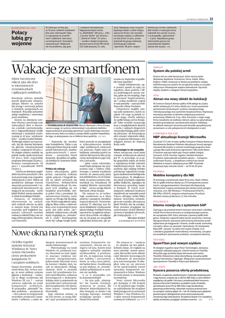 PULS BIZNESU, 19 SIERPNIA 2015 ROZRYWKI ON-LINE Polacy lubią gry wojenne W różne gry on-line gra aż 92 proc. polskich użytkowników sieci. Internautki robią to najczęściej na smartfonach i tabletach, internauci na komputerach i konsolach stacjonarnych. Większość nie ma problemu, aby grać z osobami nieznajomymi. Najpopularniejsze tytuły to „Battlefield” (40 proc.), „Fifa”, „Counter Strike” (po 39 proc.) i „World of Tanks” (37 proc.) — wynika z badań przeprowadzonych przez firmę PBI wśród 522 osób powyżej 15. roku życia. Najwięcej czasu na grach spędzają młodzi. Ludzie mający więcej niż 45 lat z tej rozrywki korzystają rzadziej, a całkowicie od niej stroni 15 proc. przedstawicieli tej grupy wiekowej. Dominują gry wojenne i sportowe. 56 proc. respon- Wakacje ze smartfonem Sektor turystyczny odkrył, jaka siła tkwi w internetowych wyszukiwarkach i aplikacjach mobilnych. Rewolucja cyfrowa zmieniła sposób planowania urlopów, zakupu biletów na samolot lub pociąg i rezerwacji pobytu w hotelach, pensjonatach czy hostelach. Wszystkie potrzebne usługi znajdziemy i zamówimy przez smartfona. Sześciu na dziesięciu turystów (59 proc.) porównuje ceny wakacyjnych ofert w internecie, a portale z porównywarkami to najpopularniejsze źródło informacji o atrakcjach (wykorzystuje je 42 proc. użytkowników) — wynika z badań Deloitte. Wybierając miejsce na wypoczynek, tak jak dawniej kierujemy się głównie rekomendacjami rodziny i znajomych (50 proc.). Na drugim miejscu znalazły się jednak media społecznościowe (33 proc.), które wyprzedziły programy telewizyjne (32 proc.), broszury touroperatorów (31 proc.) i wyszukiwarki WWW (31 proc.). — Sześciu na dziesięciu angielskich turystów powyżej 16. roku życia porównuje ceny wyjazdów wakacyjnych w sieci. Należy się spodziewać dalszego wzrostu znaczenia porównywarek i wyszukiwarek internetowych zajmujących się turystyką — mówi Jakub Wróbel, starszy menedżer w dziale konsultingu Deloitte. Zaznacza, że tendencje obserwowane na zachodnich rynkach obecne są także w naszym kraju. Powód jest oczywisty: pod względem znajomości cyfrowych nowinek zwłaszcza młodzi Polacy nie odstają od Brytyjczyków, Niemców czy Francuzów. TECHNOLOGIĄ W OSZUSTÓW: Marcin Maroszek z firmy Emapa zwraca uwagę, że systemy rekomendacji i wizualizacji obiektów wypoczynkowych pozwalają ograniczyć ryzyko bolesnego rozczarowania turysty, który na miejscu zastaje obiekt zupełnie niepodobny do tego, co pokazywano mu w folderze biura podróży. [FOT. ARC] — Naprawdę nie musimy mieć kompleksów. Także u nas wakacyjny biznes kręci się wokół portali internetowych, mediów społecznościowych i smartfonów — potwierdza Paweł Kacperek, specjalista od aplikacji mobilnych i systemów lokalizacyjnych. Polska nie odstaje Zanim zdecydujemy, gdzie jechać, najczęściej szukamy opinii, poleceń i fotografii hoteli na takich serwisach jak TripAdvisor, HolidayCheck albo Infoturystyka.pl. Na stronach tych znajdują się też bezpłatne przewodniki, oferty pokoi i fora z poradami. By zarezerwować kwaterę, warto zajrzeć na Trivago lub Booking. com. Wybór mają ułatwić opisy, zdjęcia, filmy wideo, a także miliony ocen wystawionych przez gości. Jest tylko jedno „ale”: niekiedy reklamowane ośrodki lepiej wyglądają na „obrazku” niż w „realu”. Rozwiązaniem może być usługa Google Earth, która pozwala na przeglądanie w trójwymiarowym modelu zdjęć satelitarnych, lotniczych czy panoram. Dzięki temu odbędziemy wirtualną podróż po mieście lub kurorcie albo przyjrzymy się budynkowi, jego wnętrzu i otoczeniu. — Jakże często schronisko, motel bądź pensjonat nie przypomina tego z folderu reklamowego, a zamiast trzydziestu metrów do piaszczystej plaży jest pół kilometra, i to do kamienistej. Za sprawą systemu rekomendacji czy wizualizacji 3D trudniej klientów wprowadzić w błąd — zwraca uwagę Marcin Maroszek z firmy Emapa. Nie oznacza to, że technologie wymierzone są w biura podróży i zarządców ośrodków wypoczynkowych. Przeciwnie: systemy IT ułatwiają tym firmom działalność i podnoszenie jakości obsługi. Przykład? Zmorą operatorów są zaginieni urlopowicze. Bywa różnie: od odłączenia się od grupy po przypadki najbardziej drastyczne, jak po- rwania czy śmiertelne wypadki. Jak temu zapobiec? — Dzięki lokalizatorom, np. w postaci opasek na rękę czy zegarków, biura podróży i bliscy podróżujących zawsze wiedzą, gdzie się oni znajdują. Daje to poczucie bezpieczeństwa, ale i realną możliwość reakcji w razie potrzeby — zauważa Piotr Nawrocki z firmy Trackimo. Urlopowicze mogliby ominąć pole namiotowe, motel czy zajazd. Od czego są jednak cyfrowe mapy, choćby należący do spółki Emapa serwis Emapi. pl? Takie nowinki wyznaczają trasy z uwzględnieniem danych o ruchu i opłatach drogowych oraz podpowiadają, gdzie warto się zatrzymać. Ale korzystają na nich również właściciele obiektów, ponieważ informacja o ich usługach dociera do większej liczby osób. Technologie to nie wszystko Sektor turystyczny coraz lepiej rozumie, że kluczem do sukcesu jest IT, co powoduje, że ta gałąź gospodarki należy do branż o największej liczbie wdrożeń teleinformatycznych. Dużo do myślenia daje ranking Deloitte poświęcony najszybciej rozwijającym się firmom technologicznie innowacyjnym. W ubiegłorocznej edycji zwyciężyła węgierska spółka Szallas.hu, zajmująca się internetową sprzedażą miejsc w hotelach. W trzech wcześniejszych odsłonach konkursu triumfował zaś rumuński portal Vola.ro, oferujący on-line bilety lotnicze. Oczywiście, technologie to nie wszystko. Jak zaznacza Jakub Wróbel, aby się rozwijać, firmy powinny przyglądać się zachowaniom swoich klientów zarówno w kanałach cyfrowych, jak i tradycyjnych. © Ⓟ Mirosław Konkel [email protected] 22-333-98-55 Nowe okna na r