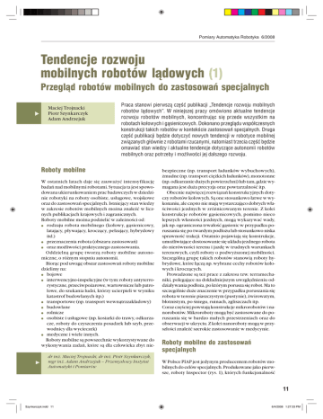 Pomiary Automatyka Robotyka 6/2008 Tendencje rozwoju mobilnych robotów lądowych (1) Przegląd robotów mobilnych do zastosowań specjalnych Maciej Trojnacki Piotr Szynkarczyk Adam Andrzejuk Praca stanowi pierwszą część publikacji „Tendencje rozwoju mobilnych robotów lądowych”. W niniejszej pracy omówiono aktualne tendencje rozwoju robotów mobilnych, koncentrując się przede wszystkim na robotach kołowych i gąsienicowych. Dokonano przeglądu współczesnych konstrukcji takich robotów w kontekście zastosowań specjalnych. Druga część publikacji będzie dotyczyć nowych tendencji w robotyce mobilnej związanych głównie z robotami rzucanymi, natomiast trzecia część będzie omawiać stan wiedzy i aktualne tendencje dotyczące autonomii robotów mobilnych oraz potrzeby i możliwości jej dalszego rozwoju. Roboty mobilne W ostatnich latach daje się zauważyć intensyfikację badań nad mobilnymi robotami. Sytuacja ta jest spowodowana ukierunkowaniem prac badawczych w dziedzinie robotyki na roboty osobiste, usługowe, wojskowe oraz do zastosowań specjalnych. Istniejący stan wiedzy w zakresie robotów mobilnych można znaleźć w licznych publikacjach krajowych i zagranicznych. Roboty mobilne można podzielić w zależności od: rodzaju robota mobilnego (kołowy, gąsienicowy, latający, pływający, kroczący, pełzający, hybrydowy itd.) przeznaczenia robota (obszaru zastosowań) oraz możliwości praktycznego zastosowania. Oddzielną grupę tworzą roboty mobilne autonomiczne, o różnym stopniu autonomii. Biorąc pod uwagę obszar zastosowań roboty mobilne dzielimy na: bojowe interwencyjno-inspekcyjne (w tym: roboty antyterrorystyczne, przeciwpożarowe, wartownicze lub patrolowe, do szukania ludzi, którzy ucierpieli w wyniku katastrof budowlanych itp.) transportowe (np. transport wewnątrzzakładowy) budowlane rolnicze osobiste i usługowe (np. kosiarki do trawy, odkurzacze, roboty do czyszczenia posadzek lub szyb, przewodnicy dla wycieczek) medyczne i wiele innych. Roboty mobilne są powszechnie wykorzystywane do wykonywania zadań, które są dla człowieka zbyt nie- dr inż. Maciej Trojnacki, dr inż. Piotr Szynkarczyk, mgr inż. Adam Andrzejuk – Przemysłowy Instytut Automatyki i Pomiarów bezpieczne (np. transport ładunków wybuchowych), żmudne (np. transport ciężkich ładunków), monotonne (np. odkurzanie dużych powierzchni) lub tam, gdzie wymagana jest duża precyzja oraz powtarzalność itp. Obecnie najwięcej rozwiązań konstrukcyjnych dotyczy robotów kołowych. Są one stosunkowo łatwe w wykonaniu, ale często nie mają wystarczająco dobrych właściwości jezdnych w zróżnicowanym terenie. Z kolei konstrukcje robotów gąsienicowych, pomimo nieco lepszych własności jezdnych, mogą wykazywać wady, jak np. ograniczona trwałość gąsienic w przypadku poruszania się po twardym podłożu lub stosunkowo niska sprawność trakcji. Ostatnio pojawiają się konstrukcje, umożliwiające dostosowanie się układu jezdnego robota do nierówności terenu i jazdę w trudnych warunkach terenowych, czyli roboty o podwyższonej mobilności. Szczególną grupę takich robotów stanowią roboty hybrydowe, które łączą np. wybrane cechy robotów kołowych i kroczących. Prowadzone są też prace z zakresu tzw. terramechaniki, polegające na dokładniejszym uwzględnieniu oddziaływania podłoża, po którym porusza się robot. Ma to szczególnie duże znaczenie w przypadku poruszania się robota w terenie piaszczystym (pustynie), żwirowatym, błotnistym, po śniegu, ruinach, zgliszczach itp. Coraz częściej powstają konstrukcje mikrorobotów i nanorobotów. Mikroroboty mogą być zastosowane do poruszania się w bardzo małych przestrzeniach oraz do obserwacji w ukryciu. Z kolei nanoroboty mogą w przyszłości znaleźć szerokie zastosowanie w medycynie. Roboty mobilne do zastosowań specjalnych W Polsce PIAP jest jedynym producentem robotów mobilnych do celów specjalnych. Produkowane jako pierwsze, roboty Inspector (rys. 1), których funkcjonalność 11 Szynkarczyk.indd 11 6/4/2008 1:27:33 PM Pomiary Automatyka Robotyka 6/2008 Rys. 1. Roboty: Inspector i Expert produkcji PIAP do rwania linek od min-pułapek oraz do podkładania ładunków pośrednich. Za pomocą manipulatora robot może transportować małe pakunki. Najnowszym produktem PIAP, jest robot pirotechniczno-rozpoznawczy IBIS (rys. 3). Jest zdalnie sterowanym urządzeniem przeznaczonym nie tylko do inspekcji i neutralizacji improwizowanych ładunków wybuchowych, ale również do realizacji zadań zwiadowczych i czynnego wsparcia działań bojowych. Robot, poruszając się na sześciu niezależnie napędzanych kołach, sprawnie pokonuje trudne przeszkody terenowe. Manipulator wraz z chwytakiem zapewnia robotowi zasięg przekraczający 3 m oraz dużą przestrzeń roboczą wokół robota. Prawdziwy potencjał robota widoczny jest podczas współpracy z szeroką gamą wyposażenia dodatkowego, tj. z urządzeniem rentgenowskim wyposażonym w system zobrazowania, czujnikiem skażeń chemicznych, wyrzutnikiem pirotechnicznym, urządzeniem do cięcia drutu ostrzowego, urządzeniem do wybijania szyb i wieloma innymi. Urządzenie zostało zbudowane z wykorzystaniem najnowszych technologii, co pozwoliło na uzyskanie niewielkiej masy, dużej niezawodności, dużej funkcjonalności i długiego czasu pracy przy zasilaniu z akumulatorów. Poza PIAP na rynku europejskim od wielu lat produkowane są roboty mobilne do zastosowań specjalnych. Znakomita część tych konstrukcji ma zastosowania policyjne i militarne, chociaż coraz częściej dostrzegane są również cywilne potrzeby ich wykorzystania. Firma Remotec jest producentem robota Mini Andros (rys. 4a), który jest małym robotem o masie 64 kg i maksymalnym udźwigu 18 kg. Cechą charakterystyczną tego robota, są uchylne gąsienice przednie i tylne, zwiększające możliwości mobilne urządzenia. Producent podaje, że na świecie pracuj