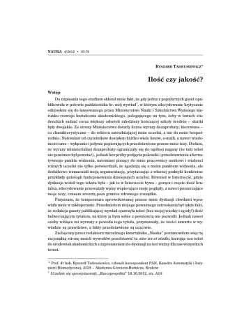 NAUKA 4/2012 • 65-76 RYSZARD TADEUSIEWICZ* Ilość czy jakość? Wstęp Do napisania tego studium skłonił mnie fakt, że gdy jedna z popularnych gazet opublikowała w połowie października br. mój wywiad1, w którym zdecydowanie krytycznie odniosłem się do lansowanego przez Ministerstwo Nauki i Szkolnictwa Wyższego kierunku rozwoju kształcenia akademickiego, polegającego na tym, żeby w ławach studenckich sadzać coraz większy odsetek młodzieży kończącej szkoły średnie – skutki były dwojakie. Ze strony Ministerstwa dotarły liczne wyrazy dezaprobaty, kierowane – co charakterystyczne – do rektora zatrudniającej mnie uczelni, a nie do mnie bezpośrednio. Natomiast od czytelników dostałem bardzo wiele listów, e-maili, a nawet wiadomości sms – wyłącznie i jedynie popierających przedstawione przeze mnie tezy. Dodam, że wyrazy ministerialnej dezaprobaty ograniczały się do ogólnej nagany (że taki tekst nie powinien był powstać), jednak bez próby podjęcia polemiki i przedstawienia alternatywnego punktu widzenia, natomiast piszący do mnie pracownicy naukowi i studenci różnych uczelni nie tylko potwierdzali, że zgadzają się z moim punktem widzenia, ale dodatkowo wzmacniali moją argumentację, przytaczając z własnej praktyki konkretne przykłady patologii funkcjonowania dzisiejszych uczelni. Również w Internecie, gdzie dyskusja wokół tego tekstu była – jak to w Internecie bywa – gorąca i często dość brutalna, zdecydowanie przeważały wpisy wspierające moje poglądy, a nawet poszerzające moje tezy, czasem zresztą poza granice zdrowego rozsądku. Przyznam, że temperatura sprowokowanej przeze mnie dyskusji chwilami wprawiała mnie w zakłopotanie. Przedmiotem mojego poważnego zatroskania był także fakt, że redakcja gazety publikującej wywiad opatrzyła tekst (bez mojej wiedzy i zgody!) dość bulwersującym tytułem, na który ja bym sobie z pewnością nie pozwolił. Jednak nawet osoby robiące mi wyrzuty z powodu tego tytułu, przyznawały, że treści zawarte w wywiadzie są prawdziwe, a fakty przedstawione są uczciwie. Zachęcony przez redaktora naczelnego kwartalnika „Nauka” postanowiłem więc tę racjonalną stronę moich wywodów przedstawić tu sine ira et studio, kierując ten tekst do środowisk akademickich z zaproszeniem do dyskusji na ten ważny dla nas wszystkich temat. * Prof. dr hab. Ryszard Tadeusiewicz, członek korespondent PAN, Katedra Automatyki i Inżynierii Biomedycznej, AGH – Akademia Górniczo-Hutnicza, Kraków 1 Uczelnie się sprostytuowały, „Rzeczpospolita” 18.10.2012, str. A10 66 R. Tadeusiewicz Postawienie problemu Nieszczęście zaczęło się od tego, że osoby decydujące o modelu polskiej uczelni uwierzyły w to, że jeżeli będziemy kształcić więcej ludzi, to będziemy mieli więcej ludzi twórczych. Tymczasem rozkład zdolności i talentów w populacji ludzkiej jest zgodny z krzywą Gaussa. Jak wiadomo, krzywa ta ma „lekkie ogony”, a to znaczy, że ludzi utalentowanych i twórczych było, jest i będzie niewielu. Dominuje przeciętność, miernota, bylejakość. Reguły tej nie zmieni fakt wręczania coraz większej liczbie intelektualnych karzełków dyplomów ukończenia studiów. Oni się od tego nie staną mądrzejsi, bo nawet najlepsza szkoła wyższa nie jest w stanie uformować myślącego i inteligentnego człowieka. Studiowanie – w odróżnieniu od edukacji średniej – jest w znacznym stopniu samodzielnym procesem, który szkoła wyższa powinna indukować i wspierać, ale którego nie może zastąpić. Studiowanie jest nie tylko zdobywaniem wiedzy, ale także (a może nawet przede wszystkim) kształceniem postaw, rozwojem ducha, wartości i tożsamości intelektualnej. Jeśli nawet wyposażymy absolwenta wyższej uczelni w duży zasób wiadomości (czego zresztą znaczna część funkcjonujących obecnie szkół wyższych także nie robi) – to i tak ta kolekcja wiadomości nie stanie się potrzebną społecznie wiedzą. Znane przysłowie mówi, że wiedza składa się z wiadomości, tak jak dom składa się z cegieł – ale przecież nie każde nagromadzenie cegieł jest domem i nie każda kolekcja wiadomości tworzy wiedzę. Wiedzę buduje kształcąca się osoba sama w swoim umyśle. Ta budowla musi stanąć na fundamencie własnych zdolności studenta, jego specyficznych talentów i ogólnej intelektualnej sprawności. Tymczasem większość aktualnie studiujących żadnego z tych przymiotów po prostu nie posiada lub ma go w niewystarczającej ilości. I nie jest to ani ich wina, ani tym bardziej nie jest to wina kształcących ich uczelni – tylko wspomnianej już krzywej Gaussa. Jeśli decydujemy się oferować wyższe wykształcenie każdemu, kto nie ucieka na drzewo, to nie dziwmy się potem, że to wyższe wykształcenie dramatycznie traci na wartości… Problem można by było zbagatelizować, gdyby nie fakt, że wiąże się z nim mnóstwo bolesnych rozczarowań coraz liczniejszych „nabranych na studia2” młodych ludzi. Te rozczarowania stanowią dramaty o wymiarze jednostkowym, natomiast prawdziwy dramat w wymiarze ogólnospołecznym wynika z faktu, że społeczeństwo, któremu nieodzownie potrzebna jest elita intelektualna – zamiast niej otrzymuje od wyższego szkolnictwa namiastkę, by nie powiedzieć gorzej: atrapę. 2 Zwróćmy uwagę, że w oficjalnej terminologii dawna rekrutacja na wyższe uczelnie (z porządnym egzaminem wstępnym jako warunkiem koniecznym uzyskania indeksu) określana jest obecnie jako „nabór na studia”. Moim zdaniem w tym terminie zawarta jest kwintesencja problemu oraz – w sposób niezamierzony i niezauważalny dla tych, który tę nazwę lansują – gorzka autoironia… Ilość czy jakość? 67 Pozwolę sobie w tym miejscu przywołać kilka cytatów z mojego felietonu, który na rozpoczęcie roku akademickiego 2012/13 zamieściłem w pewnej gazecie3. Otóż napisałem tam: Mamy początek roku akad