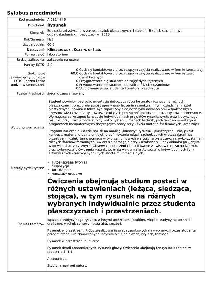 Sylabus przedmiotu Kod przedmiotu: A-1E14-III-5 Przedmiot: Kierunek: Rysunek Edukacja artystyczna w zakresie sztuk plastycznych, I stopień [6 sem], stacjonarny, ogólnoakademicki, rozpoczęty w: 2013 Rok/Semestr: III/5 Liczba godzin: 60,0 Nauczyciel: Klimaszewski, Cezary, dr hab. Forma zajęć: laboratorium Rodzaj zaliczenia: zaliczenie na ocenę Punkty ECTS: 3,0 0 Godziny kontaktowe z prowadzącym zajęcia realizowane w formie konsultacji 60,0 Godziny kontaktowe z prowadzącym zajęcia realizowane w formie zajęć dydaktycznych 0 Przygotowanie się studenta do zajęć dydaktycznych 0 Przygotowanie się studenta do zaliczeń i/lub egzaminów 0 Studiowanie przez studenta literatury przedmiotu Godzinowe ekwiwalenty punktów ECTS (łączna liczba godzin w semestrze): Poziom trudności: średnio zaawansowany Wstępne wymagania: Metody dydaktyczne: Student powinien posiadać orientację dotyczącą rysunku anatomicznego na różnych płaszczyznach, oraz umiejętność sprawnego łączenia rysunku z innymi dziedzinami sztuk plastycznych, powinien także być zapoznany z najnowszymi dokonaniami współczesnych artystów wizualnych, artystów kształtujących przestrzeń publiczną, oraz artystów performance. Wymagane są wstępne koncepcje indywidualnych projektów rysunkowych, oraz klasycznego rysunku przy użyciu modela, przy wykorzystaniu, różnych technik, podstawowa orientacja w programach komputerowych dotyczących pracy przy użyciu materiałów filmowych, oraz zdjęć. Program nauczania kładzie nacisk na analizę „budowy” rysunku - płaszczyzna, linia, punkt, kontrast, materia, oraz na umiejętne definiowanie relacji zachodzących w otaczającej nas przestrzeni i dzięki temu pomaga w tworzeniu nowych wartości artystycznych z wykorzystaniem różnych środków formalnych. Ćwiczenia pomagają przy kształtowaniu indywidualnego „języka” wypowiedzi artystycznych. Obserwacja otoczenia i studiowanie zjawisk w nim zachodzących, oraz wykonywane ćwiczenia rysunkowe mają wpływ na kształtowanie indywidualnych form artystycznych –tradycyjnych i tych stricte multimedialnych. • • • • autoekspresja twórcza ekspozycja korekta prac warsztaty grupowe Ćwiczenia obejmują studium postaci w różnych ustawieniach (leżąca, siedząca, stojąca), w tym rysunek na różnych wybranych indywidualnie przez studenta płaszczyznach i przestrzeniach. Łączenie tradycyjnego rysunku z innymi technikami (szablon, vlepka, tradycyjne techniki Zakres tematów: graficzne, wydruk cyfrowy, fotografia, rzeźba). Rysunek w przestrzeni. Próby zrealizowania prac rysunkowych na wybranych przez studenta przedmiotach, lub zbudowanych indywidualnie obiektach, bryłach, formach. Rysunek w przestrzeni publicznej. Rysunek detali anatomicznych, rysunek głowy. Ćwiczenia obejmują też rysunek postaci w proporcjach 1:1. Autoportret. Studium martwej natury. • • • Forma oceniania: • • • • ćwiczenia praktyczne/laboratoryjne obecność na zajęciach ocena ciągła (bieżące przygotowanie do zajęć i aktywność) przegląd prac wystawa końcoworoczna wystawa semestralna zaliczenie praktyczne Warunki zaliczenia: Zaliczenie na ocenę – na podstawie wykonanych prac rysunkowych. Modułowe efekty kształcenia realizowane w ramach przedmiotu: 01W Student, który zaliczył moduł, ma wiedzę dotyczącą realizacji prac artystycznych w zakresie rysunku oraz jego pochodnych i ich zastosowania w innych dyscyplinach plastycznych 02W w realizacjach rysunkowych opiera się na znajomości przestrzeni plastycznej, budowy formy, kompozycji, zagadnień perspektywy 04W zna terminologię dyscyplin rysunkowych oraz potrafi je zinterpretować 06U potrafi realizować prace artystyczne w zakresie rysunku z wykorzystaniem tradycyjnych oraz nowoczesnych technik i środków wyrazu 08U potrafi przetransponować warsztat innych dyscyplin plastycznych na teren rysunku i wykorzystać go twórczo 09U posiada umiejętność postrzegania natury i jej interpretacji w rysunku, umie oraz opiera pracę na znajomości anatomii plastycznej i zasad perspektywy 1. Sposób weryfikacji efektów kształcenia: 01W, 02W, 04W, 06U, 08U, 09U - weryfikacja na podstawie wykonywanych prac rysunkowych podczas zajęć, oraz zestawu prac zrealizowanych na zaliczenie. 1. Kandinsky W., Punkt i linia a płaszczyzna, PIW, Warszawa 1986. 2. Strzemiński W., Teoria widzenia, Kraków 1974. Literatura: 3. Tabakowska E., Ikoniczność znaku, Kraków 2006. 4. Jałowiecki B., Szczepański M., Miasto i przestrzeń w perspektywie socjologicznej , Warszawa 2006. 5. Smoczyński M., Esej o rysunku, CSW, Warszawa 2010. Dodatkowe informacje: [email protected]