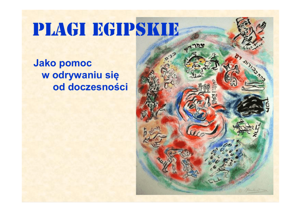 Plagi Egipskie Jako pomoc w odrywaniu się od doczesności O czym nie PowiemY ● Kiedy to miało miejsce ● W której pladze żyjemy ● Jak przebiegały plagi O czym powiemy? ● Jakie było działanie plag ● Jaka była ich struktura ● Jakie było ich znaczenie 1. Woda w Krew Studnie przy nilu Nie można było zgromadzić zapasu . 2. Zaby ´ Prosba o modlitwe ` Powiedz mi, kiedy mam prosić (...) by Pan oddalił żaby od ciebie i od domów twoich, aby pozostały tylko w Nilu. 2 Mojż. 8:5 BT 3. Komary . Palec Bozy 4. Chmary Deborah Simon, Striped Hyena Clan, 2005 Oddzielenie 5. Zaraza Plaga niszczaca ` Spuścił na nich zapalczywość swego gniewu, Popędliwość, zaciekłość i utrapienie, Poczet aniołów zagłady. Psalm 78:49 NB Joseph Turner, Piąta plaga 6. Wrzody Uderzenie ludzi Weźcie pełnymi garściami sadzy z pieca i Mojżesz niech rzuci ją ku niebu 2 Mojż. 9:8 BT 7. Grad . . Zagrozenie zycia Każdy człowiek i każde zwierzę, które znajdzie się na polu i nie zostanie spędzone do domu, zginie, gdy spadnie na nie grad. 2 Mojż. 9:19 NB ´ 8. Szarancza Wschód i zachód Wiatr wschodni Wiatr zachodni ´ ´ 9. Ciemnosc niezapowiedziana 1. Krew 2. Żaby 3. Komary Znak odkupienia 4. Chmary 5. Zaraza 6. Wrzody 7. Grad 8. Szarańcza 9. Ciemność Plagi 4-9 Przejście przez morze Pobicie pierworodnych Plagi 1-3 Przaśniki Opuszczenie Egiptu Wyjście z ziemi Goszen Wyodrębnienie z Egiptu powietrze ziemia 9. Ciemność 8. Szarańcza 7. Grad 4. Chmary 6. Wrzód 5. Zaraza woda 3. Komary 1. Krew 2. Żaby “Piramidalna” struktura plag Pierworodni Ciemność Grad Wrzód Szarańcza Chmary Komary Zaraza Krew Żaby k n m v x n x v k 9. Choszekh – ciemność 6. Szechin – wrzód 3. Khinim – komary Ch Sz Kh Sz Ch N Kh N M k n m v x n x v k 9. Choszekh – ciemność 6. Szechin – wrzód 3. Khinim – komary Ch Sz Kh Sz Ch N Kh N M k n m v x n x v k 9. Choszekh – ciemność 6. Szechin – wrzód 3. Khinim – komary Ch Sz Kh Sz Ch N Kh N M k n m v x n x v k 9. Choszekh – ciemność 6. Szechin – wrzód 3. Khinim – komary Ch Sz Kh Sz Ch N Kh N M Systematyka Plag Trzy strefy oddziaływania: woda, ziemia, powietrze Wzrastająca moc rażenia: sygnał, realny ból, zagrożenie egzystencji Gdzie jest Egipt? Czy duchowy Egipt ma fizyczne granice? Białogard "Stodoła" ? Moczyłki Kogo dotycza plagi? ` ´ Nasze wyjscie z Egiptu Plagi 4-9 4. Chmary 5. Zaraza 6. Wrzody 7. Grad 8. Szarańcza 9. Ciemność Śmierć ciała Przaśniki Pobicie pierworodnych 1. Krew 2. Żaby 3. Komary Znak odkupienia Plagi 1-3 Przejście przez morze Poświęcenie Zapieczętowanie Trzy etapy 1. Krew w wodzie Woda – Tylko ze studni! ´ 2. Formy posrednie niemieszanie Ducha z cialem ´ 3. Permisywizm Ken = TAK Kenim = Potakiwanie Nie na wszystko Chcemy potakiwac´ . Palec Bozy! 4. Oddzielenie ´ ´ 5. slabosc ciala ´ ´ Kiedy jestem słaby, wtedy jestem mocny. 2 Kor. 12:10 6. konstruktywny wstyd 7. Lód i ogień Skrajne emocje 8. Systemy ideologiczne Ekonomiczne Kolonialne Egoistyczne ´ ´ 9. Ciemnosc . Tylko Boza woda . ´ Tylko Boze swiatlo ´ ´ Nasze wyjscie z Egiptu Prowadził ich bezpiecznie tak, że się nie lękali, A nieprzyjaciół ich przykryło morze! Psalm 78:53