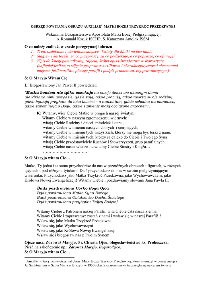 OBRZĘD POWITANIA OBRAZU AUXILIAR1 MATKI BOŻEJ TRZYKROĆ PRZEDZIWNEJ Wskazania Duszpasterstwa Apostolatu Matki Bożej Pielgrzymującej. o. Romuald Kszuk ISCHP, S. Katarzyna Antolak ISSM O co należy zadbać, w czasie peregrynacji obrazu – 1. Tron, ozdobione i oświetlone miejsce, kwiaty dla Matki na powitanie 2. Stągiew i karteczki: za co przeproszę, za co podziękuję, o co poproszę, co ofiaruję? 3. Wpis do księgi pamiątkowej, zdjęcia, krótki opis i świadectwa w skoroszycie. (najlepiej jeśli są to zdjęcia grupowe z Auxiliarem i charakterystycznymi elementami miejsca, jeśli możliwe, pieczęć parafii i podpis proboszcza, czy prowadzącego ) S: O Maryjo Witam Cię L: Błogosławiony Jan Paweł II powiedział: "Matka bowiem nie tylko oczekuje na swoje dzieci we własnym domu ale idzie za nimi wszędzie, gdzie żyją, gdzie pracują, gdzie tworzą swoje rodziny, gdzie bywają przykute do łoża boleści – a nawet tam, gdzie schodzą na manowce, gdzie zapominają o Bogu, gdzie sumienie mają obciążone grzechem". K: Witamy, więc Ciebie Matko w progach naszej świątyni. Witamy Ciebie w naszym zgromadzeniu wiernych: witają Ciebie Rodziny i dzieci, młodzież i starsi, witamy Ciebie w imieniu naszych chorych i cierpiących, witamy Ciebie w imieniu tych wszystkich, którzy nie mogą być teraz z nami, witamy Ciebie w imieniu tych, którzy są daleko do Ciebie i Twojego Syna witają Ciebie przedstawiciele Ruchów i Stowarzyszeń, grup parafialnych witają Ciebie nasze władze ….witamy Ciebie Siostry i Księża… …………………………… S: O Maryjo witam Cię… Matko, Ty jedna i ta sama przychodzisz do nas w przeróżnych obrazach i figurach, w różnych ujęciach i pod różnymi tytułami. Dziś przychodzisz do nas w swoim pielgrzymującym wizerunku. Przychodzisz jako Matka Trzykroć Przedziwna, jako Wychowawczyni, jako Królowa Nowej Ewangelizacji! Witamy Ciebie i pozdrawiamy słowami Jana Pawła II: Bądź pozdrowiona Córko Boga Ojca Bądź pozdrowiona Matko Syna Bożego Bądź pozdrowiona Oblubienico Ducha Świętego Bądź pozdrowiona przybytku Trójcy Świętej Witamy Ciebie z Patronem naszej Parafii, wita Ciebie cała nasza ziemia. Witamy Ciebie i zapraszamy: zostań z nami i wsław się w naszej Parafii!!! Wsław się, jako Matka Trzykroć Przedziwna Wsław się, jako Wychowawczyni Wsław się, jako Królowa Nowej Ewangelizacji Wsław się i błogosław nas z Twoim Synem! Ojcze nasz, Zdrowaś Maryjo, 3 x Chwała Ojcu, błogosławieństwo ks. Proboszcza, Pieśń na zakończenie np.: Zdrowaś Maryjo, Bogarodzico. S: O Maryjo witam Cię… 1 Auxiliar – taką nazwę otrzymał obraz Matki Bożej Trzykroć Przedziwnej, który wyruszył w peregrynacji z Jej Sanktuarium w Santa Maria w Brazylii w 1950 roku. Z czasem nazwa ta przyjęła się na całym świecie Wersja bardziej rozbudowana, lub materiał do kazania w oparciu o poniższe teksty. L 1.: Historia i znaczenie obrazu Obraz Matki Bożej Trzykroć Przedziwnej, jest dziełem włoskiego malarza Luigi Crossio. Łaskami zasłynął w maleńkiej kaplicy w Szensztat, koło Koblencji w 1914r. Zbuntowani uczniowie gimnazjum, pod opieką Maryi rozpoczęli odnowę swojego życia. Maryja prosiła ich o pracę nad sobą, o gorliwe życie modlitwy i wiernie wypełnianie swoich obowiązków. Obiecała, że wtedy zamieszka w opuszczonej kaplicy i stąd będzie rozdzielać skarby łask dla odnowy świata. Wielu chłopców podjęło to zaproszenie. Ofiarowane Maryi zasługi sprawiły że stara kaplica stała się z czasem miejscem pielgrzymkowym. Maryja zasłynęła zaś jako Trzykroć Przedziwna Matka. Warto nadmienić, że obraz ten znajdował się w wadowickim domu Karola Wojtyły. Jako mały chłopczyk modlił się przed nim z rodzicami i bratem. Tytuł obrazu został przejęty z historii Kongregacji Mariańskich w Ingolstatt w Bawarii. Tam w czasach odstępstwa Marcina Lutra, podczas jednego z nabożeństw młodzi członkowie kongregacji Mariańskiej śpiewali litanię loretańską. Świątobliwy Jezuita o. Jakub Rem otrzymał wewnętrzne przeświadczenie, że tytuł „Matko Przedziwna” należy do wyjątkowych. Odnosi się bowiem do relacji Maryi do Trójcy Świętej. Poprosił więc, by powtórzyć go trzy razy. I tak przejęła się ta praktyka w Kościele i jest pielęgnowana do dziś w wielu świątyniach. Szczególnie przez Ruch Szensztacki. Wszędzie tam, gdzie powstawały Kongregacje Mariańskie, gdzie czczona była Trzykroć Przedziwność Maryi, Kościół cieszył się żywą wiarą i zwyciężał wszelkie odstępstwa od wiary i moralności, wychodząc zwycięsko z wszelkich zawirowań czasu. Pokazuje to historia chłopców z Gimnazjum z Szensztat. Pokazuje to również doświadczenie wielu parafii i wspólnot, które nawiedza ten obraz w różnych formach. Skłoniło to odpowiedzialnych w krajach Europy za pielgrzymowanie tego wizerunku do ukoronowania Maryi, jako Królowej Nowej Ewangelizacji Europy. S: Królowej Anielskiej śpiewajmy L 2.: Łaski… Za Pośrednictwem Maryi czczonej w tym wizerunku w Jej sanktuariach, a także przez pielgrzymujące z nich obrazy pomocnicze, takie jak ten, Ci którzy wierzą, otrzymują łaskę zadomowienia w sercu Boga, wewnętrznej przemiany i owocnego apostolstwa. Wiele osób odkrywa i przeżywa Boga jako miłującego i miłosiernego Ojca, ofiarując Maryi swój wysiłek w pracy nad sobą ludzie doznają przemiany serca, a zalęknieni i niepewni stają się gorliwymi apostołami w swoich środowiskach. Ponad pięćdziesięcioletnia historia pielgrzymowania tego wizerunku jest świadkiem wielu łask i cudów podobnych do tych, jakie miały miejsce w czasie nawiedzenia przez Maryję domu Zachariasza i Elżbiety. Elżbietę i Maryję wypełniła wielka radość i wdzięczność Bogu, Zachariasz odzyskał mowę, a dom został napełniony Bożym błogosławieństwem. W Polsce najczęstszym doświadczeniem jest powrót do wspólnej – rodzinnej modlitwy, o co tak bardz