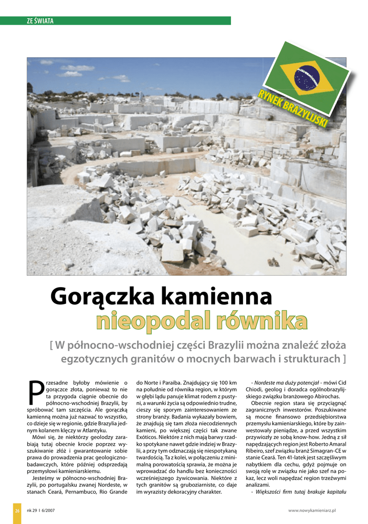 ZE ŚWIATA RYN EK B R AZ Y LIJS KI Gorączka kamienna nieopodal równika [ W północno-wschodniej części Brazylii można znaleźć złoża egzotycznych granitów o mocnych barwach i strukturach ] P rzesadne byłoby mówienie o gorączce złota, ponieważ to nie ta przygoda ciągnie obecnie do północno-wschodniej Brazylii, by spróbować tam szczęścia. Ale gorączką kamienną można już nazwać to wszystko, co dzieje się w regionie, gdzie Brazylia jednym kolanem klęczy w Atlantyku. Mówi się, że niektórzy geolodzy zarabiają tutaj obecnie krocie poprzez wyszukiwanie złóż i gwarantowanie sobie prawa do prowadzenia prac geologicznobadawczych, które później odsprzedają przemysłowi kamieniarskiemu. Jesteśmy w północno-wschodniej Brazylii, po portugalsku zwanej Nordeste, w stanach Ceará, Pernambuco, Rio Grande 26 nk 29 I 6/2007 do Norte i Paraiba. Znajdujący się 100 km na południe od równika region, w którym w głębi lądu panuje klimat rodem z pustyni, a warunki życia są odpowiednio trudne, cieszy się sporym zainteresowaniem ze strony branży. Badania wykazały bowiem, że znajdują się tam złoża niecodziennych kamieni, po większej części tak zwane Exóticos. Niektóre z nich mają barwy rzadko spotykane nawet gdzie indziej w Brazylii, a przy tym odznaczają się niespotykaną twardością. Ta z kolei, w połączeniu z minimalną porowatością sprawia, że można je wprowadzać do handlu bez konieczności wcześniejszego żywicowania. Niektóre z tych granitów są gruboziarniste, co daje im wyrazisty dekoracyjny charakter. - Nordeste ma duży potencjał - mówi Cid Chiodi, geolog i doradca ogólnobrazylijskiego związku branżowego Abirochas. Obecnie region stara się przyciągnąć zagranicznych inwestorów. Poszukiwane są mocne finansowo przedsiębiorstwa przemysłu kamieniarskiego, które by zainwestowały pieniądze, a przed wszystkim przywiozły ze sobą know-how. Jedną z sił napędzających region jest Roberto Amaral Ribeiro, szef związku branż Simagran-CE w stanie Ceará. Ten 41-latek jest szczęśliwym nabytkiem dla cechu, gdyż pojmuje on swoją rolę w związku nie jako szef na pokaz, lecz woli napędzać region trzeźwymi analizami. - Większości firm tutaj brakuje kapitału www.nowykamieniarz.pl ZE ŚWIATA oraz know-how, by wykorzystać skarby ziemi – mówi Ribeiro, sam właściciel firmy. To, że zagraniczni inwestorzy też chcą przy tym zarobić, nie przeszkadza w Nordeste nikomu. Za w pełni przyjaznego inwestorom podaje się Eduardo de Castro Bezerra Neto z FIEC, instytucji odpowiadającej Izbie Handlowo- Przemysłowej: - U nas inwestorzy mogą zarobić dwojako: po pierwsze przy wydobyciu kamieni, po drugie przy sprzedaży w Europie – mówi. Zresztą nikt nie chce kończyć tutaj na samym eksporcie kamieni naturalnych. Już teraz eksportuje się znaczne ilości butów i ubrań, a w przyszłości to samo powinno stać się z orzechami cashew oraz owocami tropikalnymi. Pokazać się może infrastruktura. Częściowo jest ona lepiej rozwinięta niż na południu Brazylii, głównie z tego względu, że jest nowa i jeszcze niezbyt obciążona. Miasto Pecém ma nawet port morski. Główną zaletą lokalizacji jest względnie mała odległość do Europy. Znanym poza Ameryką Płd. kamieniem ze stanu Ceará jest granit Branco Ceará, który dorobił się również całego szeregu innych nazw. Dalszymi sławami są różowy Pink Iracema czy też zielony Green Ocean. Znakomitością z Pernambuco jest Marrom Imperial. Obok egzotycznych granitów znaleźć można również wapienie. Jednym z bardziej znanych jest Pedra Cariri, pochodzący z południa stanu Pernambuco. Chętnie wykorzystywany jest na baseny, ponieważ pozostaje przyjemnie chłodny nawet przy największym upale. W głębi lądu wydobywa się kwarcyt. Tam położona jest także Chapada do Araripe z jednym z najważniejszych złóż skamieniałości z okresu kredy. Jeśli chodzi o zbyt na rynku, dzisiejsi Nordestinos wiedzą także, że piękny ka- Kamieniołom granitu BRANCO CEARÁ, obsługiwany przez firmę Granistone www.nowykamieniarz.pl RY N EK B RAZ YLIJ SK I Praca ręczna odgrywa dużą rolę w Nordeste, gdyż taka praca jest tania. mień przynosi jeszcze więcej pieniędzy, gdy zwiększy się jego wartość obróbką. Dlatego też w dwóch stanach mają zostać wybudowane centra rzemiosła ręcznego, mające służyć do realizacji trzech celów marketingowych: po pierwsze chce się stworzyć nowe rynki zbytu dla kamieni naturalnych, po drugie utrzymać tradycyjne techniki rzemiosła ręcznego, a poza tym centra mają służyć rozwojowi nowych technik i idei. Takie założenia pasują do koncepcji marketingowej szefa związku Roberto Amarala. Dla niego jest mianowicie pewne, że kamień naturalny nie sprzedaje się tylko poprzez samą wartość jako materiał, czyli funkcjonalność np. w budowie, tylko poprzez wyimaginowaną wartość, czyli image, ale tego jego zdaniem tamtejsze zakłady muszą się jeszcze nauczyć. Małe zakłady zajmujące się w Brazylii obróbką są bowiem domowymi biznesami, funkcjonującymi trochę w chaosie, w piwnicy, bez NIP-u i REGON-u. Wprawdzie okazuje się to korzystne dla konsumentów, ponieważ zakłady te zwalczają się bezlitośnie niskimi cenami, jednak z drugiej strony nie wychodzi to na dobre nikomu. Konsument musi się zadowolić niższą jakością, bo wyrobnicy nie wiedzą, czym jest wykształcenie tudzież doskonalenie zawodowe. Nie korzysta też ani właściciel zakładu, ani jego pracownicy, gdyż prowadzą politykę samowyzysku. W końcu też, z powodu niewpływania do kasy podatków, z pustymi kieszeniami pozostaje państwo. Osobą kontaktową jest Geraldo Silvério, miejscowy przedstawiciel stanowego związku. Można kontaktować się w języku angielskim ([email protected]). Peter Becker Tłumaczenie: Katarzyna Sanojca 6/2007 I nK29 27