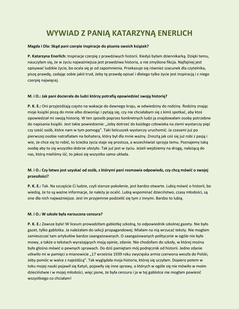 WYWIAD Z PANIĄ KATARZYNĄ ENERLICH Magda i Ola: Skąd pani czerpie inspiracje do pisania swoich książek? P. Katarzyna Enerlich: Inspiracje czerpię z prawdziwych historii. Kiedyś byłam dziennikarką. Dzięki temu, nauczyłam się, że w życiu najważniejsza jest prawdziwa historia, a nie zmyślona fikcja. Najfajniej jest opisywać ludzkie życie, bo ocala się je od zapomnienia. Przekazuje się również szacunek dla czytelnika, piszę prawdę, zadając sobie jakiś trud, żeby tę prawdę opisać i dlatego tylko życie jest inspiracją i z niego czerpię najwięcej. M. i O.: Jak pani docierała do ludzi którzy potrafią opowiedzieć swoją historię? P. K. E.: Oni przyjeżdżają często na wakacje do dawnego kraju, w odwiedziny do rodziny. Rodziny znając moje książki piszą do mnie albo dzwoniąc i pytają się, czy nie chciałabym się z kimś spotkać, aby ktoś opowiedział mi swoją historię. W ten sposób poprzez konkretnych ludzi ja znajdowałam osoby potrzebne do napisania książki. Jest takie powiedzenie: „żeby dotrzeć do każdego człowieka na ziemi wystarczy pięć czy sześć osób, które nam w tym pomogą”. Taki łańcuszek wystarczy uruchomić. Ja czasami już po pierwszej osobie natrafiałam na bohatera, który był dla mnie ważny. Zresztą jak coś się już robi z pasją i wie, że chce się to robić, to ścieżka życia staje się prostsza, a wszechświat sprzyja temu. Poznajemy taką osobę aby to się wszystko dobrze ułożyło. Tak już jest w życiu. Jeżeli wejdziemy na drogę, należącą do nas, którą mieliśmy iść, to jakoś się wszystko samo układa. M. i O.: Czy łatwo jest uzyskać od osób, z którymi pani rozmawia odpowiedz, czy chcą mówić o swojej przeszłości? P. K. E.: Tak. Na szczęście Ci ludzie, czyli starsze pokolenie, jest bardzo otwarte. Lubią mówić o historii, bo wiedzą, że to są ważne informacje, że należy je ocalić. Lubią wspominać dzieciństwo, czasy młodości, są one dla nich najważniejsze. Jest im przyjemnie podzielić się tym z innymi. Bardzo to lubią. M. i O.: W szkole była narzucona cenzura? P. K. E.: Zawsze była! W liceum prowadziłam gablotkę szkolną, to odpowiednik szkolnej gazety. Nie było gazet, tylko gablotka. Ja należałam do sekcji propagandowej. Miałam na nią wrzucać teksty. Nie mogłam zamieszczać tam artykułów bardzo zaangażowanych. O zaangażowanych politycznie w ogóle nie było mowy, a także o tekstach wyrażających moją opinie, zdanie. Nie chodziłam do szkoły, w której można było głośno mówić o pewnych sprawach. Do dziś pamiętam mój podręcznik od historii. Jedno zdanie utkwiło mi w pamięci a mianowicie „17 września 1939 roku zwycięska armia czerwona weszła do Polski, żeby pomóc w walce z najeźdźcą”. Tak wyglądała moja historia, której się uczyłam. Dopiero potem w toku mojej nauki pojawił się Katyń, pojawiły się inne sprawy, o których w ogóle się nie mówiło w moim dzieciństwie i w mojej młodości, więc jasne, że była cenzura i ja w tej gablotce nie mogłam powiesić wszystkiego co chciałam! M. i O.: Czy marzenia są ważne w życiu? P. K. E.: W wieku czternastu, piętnastu lat zaczyna się mieć poważne marzenia, a nie tylko takie, żeby sobie kupić nową bluzkę albo grę na komputer, albo nowy telefon. To są niepoważne marzenia. To są marzenia- ja tak je nazywam „rzeczy śmieci”, lecz w tym wieku zaczynacie już wchodzić na drogę, w której marzenia są ważne, stają się najważniejsze , prawdziwe. To jak ułożycie swoje życie, którą drogą pójdziecie. Słuchajcie tego, co mówi wam dusza. Zastanówcie się, co kochacie robić? Jeśli zwiążecie swoje życie z pracą zawodową, której nie kochacie to będziecie nieszczęśliwi przez całe swoje życie, a jeżeli wasza praca stanie się pasją i jeżeli połączycie pracę z pasją, to tak naprawdę nigdy nie będziecie chodzić, do pracy, bo to będzie wasza pasja a nie praca. P. Katarzyna: Życzę wszystkim uczniom Szkoły nr 1 w Sulejówku tego, żeby słuchali, co jest u nich w środku najważniejsze, co się dla nich wszystkich liczy, co macie w duszy. Żeby każde wasze wybory, były związane z tym, co kochacie, a nie czego nie znoście. I życzę wam wszystkim mnóstwa powodów do płaczu ze szczęścia. Magda i Ola: Dziękujemy za poświęcony nam czas. Wywiad przeprowadziły: Magdalena Tomasik i Aleksandra Lornet kl. IIc Gim. 1 Korekta: Pani Sylwia Guzy