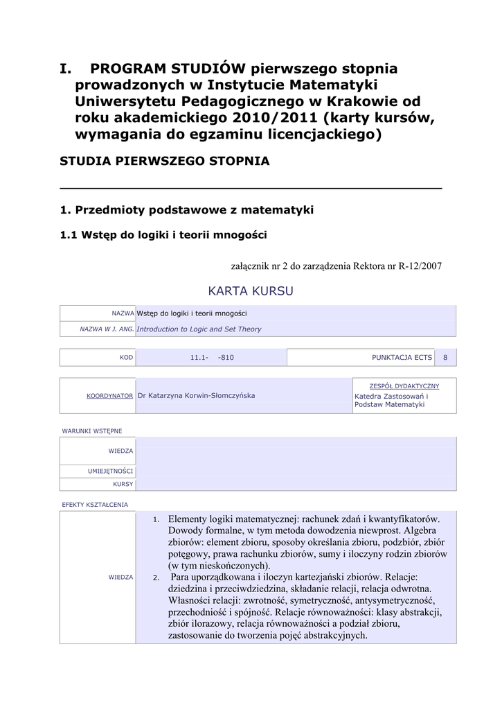 I. PROGRAM STUDIÓW pierwszego stopnia prowadzonych w Instytucie Matematyki Uniwersytetu Pedagogicznego w Krakowie od roku akademickiego 2010/2011 (karty kursów, wymagania do egzaminu licencjackiego) STUDIA PIERWSZEGO STOPNIA 1. Przedmioty podstawowe z matematyki 1.1 Wstęp do logiki i teorii mnogości załącznik nr 2 do zarządzenia Rektora nr R-12/2007 KARTA KURSU NAZWA Wstęp do logiki i teorii mnogości NAZWA W J. ANG. Introduction to Logic and Set Theory 11.1- KOD -810 PUNKTACJA ECTS 8 ZESPÓŁ DYDAKTYCZNY KOORDYNATOR Dr Katarzyna Korwin-Słomczyńska Katedra Zastosowań i Podstaw Matematyki WARUNKI WSTĘPNE WIEDZA UMIEJĘTNOŚCI KURSY EFEKTY KSZTAŁCENIA 1. WIEDZA 2. Elementy logiki matematycznej: rachunek zdań i kwantyfikatorów. Dowody formalne, w tym metoda dowodzenia niewprost. Algebra zbiorów: element zbioru, sposoby określania zbioru, podzbiór, zbiór potęgowy, prawa rachunku zbiorów, sumy i iloczyny rodzin zbiorów (w tym nieskończonych). Para uporządkowana i iloczyn kartezjański zbiorów. Relacje: dziedzina i przeciwdziedzina, składanie relacji, relacja odwrotna. Własności relacji: zwrotność, symetryczność, antysymetryczność, przechodniość i spójność. Relacje równoważności: klasy abstrakcji, zbiór ilorazowy, relacja równoważności a podział zbioru, zastosowanie do tworzenia pojęć abstrakcyjnych. 3. 4. 1. 2. UMIEJĘTNOŚCI 3. 4. Konstrukcja liczb całkowitych i wymiernych. Zbiory częściowo i liniowo uporządkowane: elementy wyróżnione, porządek gęsty. Funkcje: obraz i przeciwobraz, składanie funkcji, funkcja odwrotna, injekcja, surjekcja, bijekcja, twierdzenie o faktoryzacji. Liczby naturalne, indukcja matematyczna, zasada minimum i definiowanie przez indukcję. Pojęcie równoliczności zbiorów: zbiory przeliczalne i nieprzeliczalne, przeliczalność zbioru liczb wymiernych i nieprzeliczalność zbioru liczb rzeczywistych. Stosowanie rachunku zdań i kwantyfikatorów oraz indukcji matematycznej w prowadzeniu rozumowań, w szczególności w dowodzeniu twierdzeń. wykonywania działań na zbiorach i funkcjach. interpretowania zagadnień znanych z innych dziedzin matematyki w języku teorii zbiorów rozumienie zagadnień związanych z różnymi rodzajami nieskończoności oraz porządków w zbiorach. ORGANIZACJA FORMA ZAJĘĆ ĆWICZENIA W GRUPACH WYKŁAD (W) A 30 LICZBA GODZIN K L S P 30 FORMY SPRAWDZANIA EFEKTÓW KSZTAŁCENIA W egzamin A zaliczenie – na podstawie kolokwiów K L S P OCENA Ocena z egzaminu UWAGI PODSTAWOWA 1. LITERATURA 2. 3. A. Chronowski, Zadania z elementów teorii mnogości i logiki matematycznej, Wydawnictwo ,,Dla szkoły'', Wilkowice 1999. W. Guzicki, P. Zakrzewski, Wstęp do matematyki. Zbiór zadań, Wydawnictwo Naukowe PWN, Warszawa 2005. W. Guzicki, P. Zakrzewski, Wykłady ze wstępu do matematyki, UZUPEŁNIAJĄCA 1. 2. 3. 4. A. Chronowski, Elementy teorii mnogości, WN WSP, Kraków 2000. J. Cichoń, Wykłady ze wstępu do matematyki, Dolnośląskie Wydawnictwo Edukacyjne, Wrocław 2003. K. Kuratowski, Wstęp do teorii mnogości i topologii, PWN,Warszawa 2004. R. Murawski, K. Świrydowicz, 4. 5. Wydawnictwo Naukowe PWN, Warszawa 2005. W. Marek, J. Onyszkiewicz, Elementy logiki i teorii mnogości w zadaniach, PWN, Warszawa 2006. H. Rasiowa, Wstęp do matematyki Wstęp do teorii mnogości, Wydawnictwo Naukowe UAM, Poznań 2006. współczesnej, PWN, Warszawa 2007. 1.2 Analiza matematyczna 1 KARTA KURSU NAZWA Analiza matematyczna 1 NAZWA W J. ANG. Mathematical Analysis 1 11.1- KOD -810 PUNKTACJA ECTS 8 ZESPÓŁ DYDAKTYCZNY KOORDYNATOR Prof. dr hab. Tadeusz Winiarski Katedra Analizy Matematycznej i Równań Funkcyjnych WARUNKI WSTĘPNE WIEDZA UMIEJĘTNOŚCI KURSY EFEKTY KSZTAŁCENIA 5. 6. 7. WIEDZA UMIEJĘTNOŚCI Liczby rzeczywiste. Aksjomatyka liczb rzeczywistych. Kresy zbiorów. Liczby zespolone. Odwzorowania. Składanie, odwracanie, obrazy i przeciwobrazy zbiorów. Podstawowe funkcje elementarne w dziedzinie rzeczywistej, ciągi i podciągi. 8. Teoria granic. Granica ciągu liczbowego. Granica dolna i górna ciągu liczbowego i funkcji rzeczywistej w punkcie. Przestrzenie metryczne, otoczenia punktów, zbiory otwarte i domknięte, punkty skupienia. Zwartość, spójność i zupełność podzbiorów przestrzeni euklidesowej. 9. Odwzorowania ciągłe i ich własności. Podstawowe funkcje elementarne w dziedzinie rzeczywistej, ich ciągłość i granice z nimi związane. Własność Darboux. Ciągłość jednostajna. 10. Rachunek różniczkowy funkcji zmiennej rzeczywistej. Interpretacja fizyczna i geometryczna pochodnej. Działania na funkcjach a pochodna. Twierdzenia o wartości średniej. 1. 2. 3. obliczanie granic cigów, funkcji jednej zmiennej. badania zbieżności ciągów. obliczanie pochodnych 4. badanie przebiegu funkcji. ORGANIZACJA FORMA ZAJĘĆ ĆWICZENIA W GRUPACH WYKŁAD (W) A 30 LICZBA GODZIN K L S P 30 FORMY SPRAWDZANIA EFEKTÓW KSZTAŁCENIA W egzamin A zaliczenie – na podstawie kolokwiów K L S P OCENA Ocena z egzaminu UWAGI UZUPEŁNIAJĄCA PODSTAWOWA 1. 2. 3. LITERATURA 4. 5. 6. J. Banaś, S. Wędrychowicz, Zbiór zadań z analizy matematycznej, WNT, Warszawa 1994. G. N. Berman, Zbiór zadań z analizy matematycznej, Wydawnictwo Pracowni Komputerowej Jacka Skalmierskiego, Gliwice 1999. B. P. Demidowicz, Sbornik zadacz i uprażnienij po matemematiczeskomu analizu, Izdat. Nauka, Moskwa 1977. G. M. Fichtenholz, Rachunek różniczkowy i całkowy, t. I, PWN, Warszawa 1985. F. Leja, Rachunek różniczkowy i całkowy, PWN, Warszawa 1976. W. Rudin, Podstawy analizy matematycznej, PWN, Warszawa 1982. 1.3 Analiza matematyczna 2 1. 2. 3. 4. 5. 6. J. Dieudonne, Foundations of Modern Analysis, Academic Press, New York and London, 1969. W. Kaczor, M. Nowak, Zadania z analizy matematycznej, cz. I,II, Wydawnictwo UMCS, Lublin 1996. W. Krysicki, L. Włodarski, Analiza matematyczna w zadaniach, cz. I, PWN, Warszawa 1994. T. Krasiński, Analiza matematyczna (funkcje jednej zmiennej), WUŁ, Łódź 2003. H. J. M