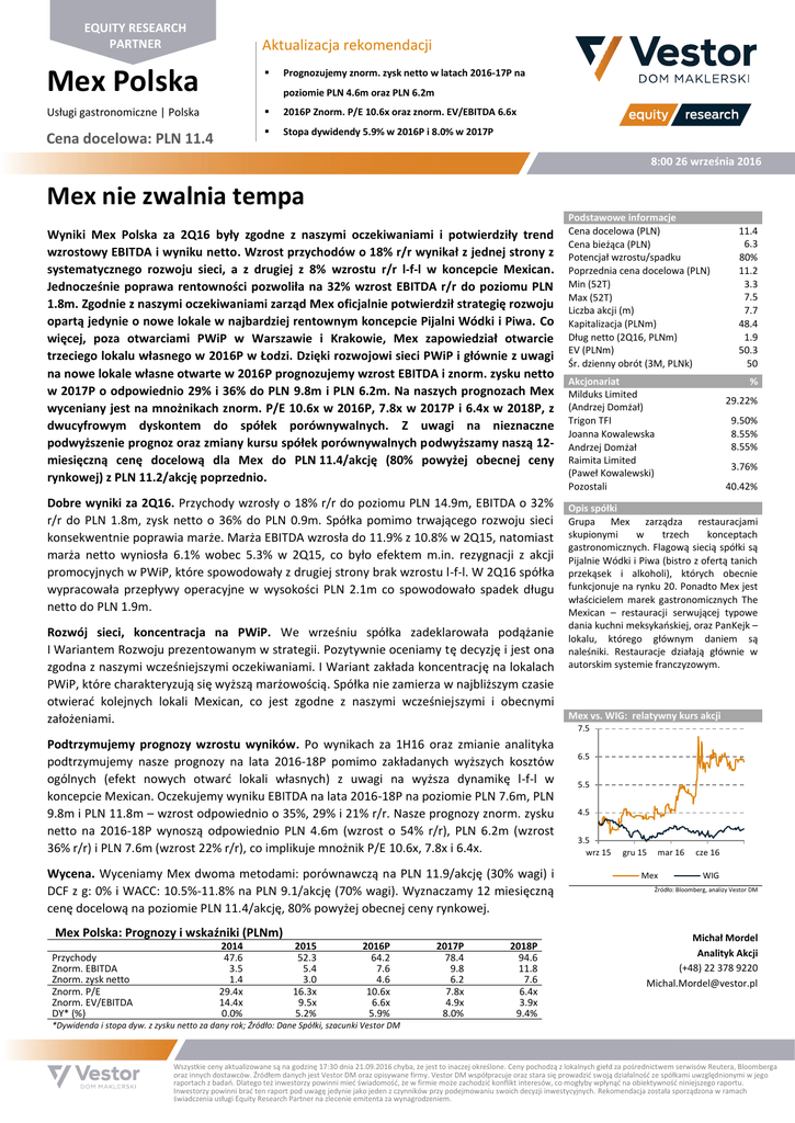 EQUITY RESEARCH PARTNER Aktualizacja rekomendacji Mex Polska Usługi gastronomiczne | Polska 2016P Znorm. P/E 10.6x oraz znorm. EV/EBITDA 6.6x Stopa dywidendy 5.9% w 2016P i 8.0% w 2017P Prognozujemy znorm. zysk netto w latach 2016-17P na poziomie PLN 4.6m oraz PLN 6.2m Cena docelowa: PLN 11.4 8:00 26 września 2016 Mex nie zwalnia tempa Wyniki Mex Polska za 2Q16 były zgodne z naszymi oczekiwaniami i potwierdziły trend wzrostowy EBITDA i wyniku netto. Wzrost przychodów o 18% r/r wynikał z jednej strony z systematycznego rozwoju sieci, a z drugiej z 8% wzrostu r/r l-f-l w koncepcie Mexican. Jednocześnie poprawa rentowności pozwoliła na 32% wzrost EBITDA r/r do poziomu PLN 1.8m. Zgodnie z naszymi oczekiwaniami zarząd Mex oficjalnie potwierdził strategię rozwoju opartą jedynie o nowe lokale w najbardziej rentownym koncepcie Pijalni Wódki i Piwa. Co więcej, poza otwarciami PWiP w Warszawie i Krakowie, Mex zapowiedział otwarcie trzeciego lokalu własnego w 2016P w Łodzi. Dzięki rozwojowi sieci PWiP i głównie z uwagi na nowe lokale własne otwarte w 2016P prognozujemy wzrost EBITDA i znorm. zysku netto w 2017P o odpowiednio 29% i 36% do PLN 9.8m i PLN 6.2m. Na naszych prognozach Mex wyceniany jest na mnożnikach znorm. P/E 10.6x w 2016P, 7.8x w 2017P i 6.4x w 2018P, z dwucyfrowym dyskontem do spółek porównywalnych. Z uwagi na nieznaczne podwyższenie prognoz oraz zmiany kursu spółek porównywalnych podwyższamy naszą 12miesięczną cenę docelową dla Mex do PLN 11.4/akcję (80% powyżej obecnej ceny rynkowej) z PLN 11.2/akcję poprzednio. Dobre wyniki za 2Q16. Przychody wzrosły o 18% r/r do poziomu PLN 14.9m, EBITDA o 32% r/r do PLN 1.8m, zysk netto o 36% do PLN 0.9m. Spółka pomimo trwającego rozwoju sieci konsekwentnie poprawia marże. Marża EBITDA wzrosła do 11.9% z 10.8% w 2Q15, natomiast marża netto wyniosła 6.1% wobec 5.3% w 2Q15, co było efektem m.in. rezygnacji z akcji promocyjnych w PWiP, które spowodowały z drugiej strony brak wzrostu l-f-l. W 2Q16 spółka wypracowała przepływy operacyjne w wysokości PLN 2.1m co spowodowało spadek długu netto do PLN 1.9m. Rozwój sieci, koncentracja na PWiP. We wrześniu spółka zadeklarowała podążanie I Wariantem Rozwoju prezentowanym w strategii. Pozytywnie oceniamy tę decyzję i jest ona zgodna z naszymi wcześniejszymi oczekiwaniami. I Wariant zakłada koncentrację na lokalach PWiP, które charakteryzują się wyższą marżowością. Spółka nie zamierza w najbliższym czasie otwierać kolejnych lokali Mexican, co jest zgodne z naszymi wcześniejszymi i obecnymi założeniami. Podtrzymujemy prognozy wzrostu wyników. Po wynikach za 1H16 oraz zmianie analityka podtrzymujemy nasze prognozy na lata 2016-18P pomimo zakładanych wyższych kosztów ogólnych (efekt nowych otwarć lokali własnych) z uwagi na wyższa dynamikę l-f-l w koncepcie Mexican. Oczekujemy wyniku EBITDA na lata 2016-18P na poziomie PLN 7.6m, PLN 9.8m i PLN 11.8m – wzrost odpowiednio o 35%, 29% i 21% r/r. Nasze prognozy znorm. zysku netto na 2016-18P wynoszą odpowiednio PLN 4.6m (wzrost o 54% r/r), PLN 6.2m (wzrost 36% r/r) i PLN 7.6m (wzrost 22% r/r), co implikuje mnożnik P/E 10.6x, 7.8x i 6.4x. Wycena. Wyceniamy Mex dwoma metodami: porównawczą na PLN 11.9/akcję (30% wagi) i DCF z g: 0% i WACC: 10.5%-11.8% na PLN 9.1/akcję (70% wagi). Wyznaczamy 12 miesięczną cenę docelową na poziomie PLN 11.4/akcję, 80% powyżej obecnej ceny rynkowej. Mex Polska: Prognozy i wskaźniki (PLNm) Przychody Znorm. EBITDA Znorm. zysk netto Znorm. P/E Znorm. EV/EBITDA DY* (%) 2014 47.6 3.5 1.4 29.4x 14.4x 0.0% 2015 52.3 5.4 3.0 16.3x 9.5x 5.2% 2016P 64.2 7.6 4.6 10.6x 6.6x 5.9% 2017P 78.4 9.8 6.2 7.8x 4.9x 8.0% 2018P 94.6 11.8 7.6 6.4x 3.9x 9.4% Podstawowe informacje Cena docelowa (PLN) Cena bieżąca (PLN) Potencjał wzrostu/spadku Poprzednia cena docelowa (PLN) Min (52T) Max (52T) Liczba akcji (m) Kapitalizacja (PLNm) Dług netto (2Q16, PLNm) EV (PLNm) Śr. dzienny obrót (3M, PLNk) Akcjonariat Milduks Limited (Andrzej Domżał) Trigon TFI Joanna Kowalewska Andrzej Domżał Raimita Limited (Paweł Kowalewski) Pozostali 11.4 6.3 80% 11.2 3.3 7.5 7.7 48.4 1.9 50.3 50 % 29.22% 9.50% 8.55% 8.55% 3.76% 40.42% Opis spółki Grupa Mex zarządza restauracjami skupionymi w trzech konceptach gastronomicznych. Flagową siecią spółki są Pijalnie Wódki i Piwa (bistro z ofertą tanich przekąsek i alkoholi), których obecnie funkcjonuje na rynku 20. Ponadto Mex jest właścicielem marek gastronomicznych The Mexican – restauracji serwującej typowe dania kuchni meksykańskiej, oraz PanKejk – lokalu, którego głównym daniem są naleśniki. Restauracje działają głównie w autorskim systemie franczyzowym. Mex vs. WIG: relatywny kurs akcji 7.5 6.5 5.5 4.5 3.5 wrz 15 gru 15 mar 16 Mex cze 16 WIG Źródło: Bloomberg, analizy Vestor DM Michał Mordel Analityk Akcji (+48) 22 378 9220 [email protected] *Dywidenda i stopa dyw. z zysku netto za dany rok; Źródło: Dane Spółki, szacunki Vestor DM Wszystkie ceny aktualizowane są na godzinę 17:30 dnia 21.09.2016 chyba, że jest to inaczej określone. Ceny pochodzą z lokalnych giełd za pośrednictwem serwisów Reutera, Bloomberga oraz innych dostawców. Źródłem danych jest Vestor DM oraz opisywane firmy. Vestor DM współpracuje oraz stara się prowadzić swoją działalność ze spółkami uwzględnionymi w jego raportach z badań. Dlatego też inwestorzy powinni mieć świadomość, że w firmie może zachodzić konflikt interesów, co mogłyby wpłynąć na obiektywność niniejszego raportu. Inwestorzy powinni brać ten raport pod uwagę jedynie jako jeden z czynników przy podejmowaniu swoich decyzji inwestycyjnych. Rekomendacja została sporządzona w ramach świadczenia usługi Equity Research Partner na zlecenie emitenta za wynagrodzeniem. Mex | Wrzesień 2016 Mex Polska Dane w PLNm o ile nie podano inaczej Rachunek zysków i strat (PLNm) Przychody ze sprzedaży Koszty sprzedaż Zysk br