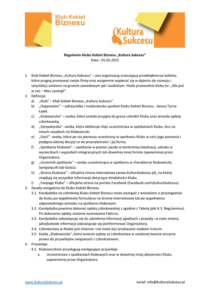 Regulamin Klubu Kobiet Biznesu „Kultura Sukcesu” Data - 01.02.2015 1. Klub Kobiet Biznesu „Kultura Sukcesu” – jest organizacją zrzeszającą przedsiębiorcze kobiety, które pragną promować swoje firmy oraz wzajemnie wspierać się w dążeniu do rozwoju i satysfakcji zarówno na gruncie zawodowym jak i osobistym. Hasło przewodnie klubu to: „Siła jest w nas – Moc synergii”. 2. Definicje: a) „Klub” – Klub Kobiet Biznesu „Kultura Sukcesu”. b) „Organizator” – założycielka i moderatorka spotkań Klubu Kobiet Biznesu - Iwona TyrnaŁojek. c) „Klubowiczka” – osoba, która została przyjęta do grona członkiń Klubu oraz wniosła opłatę członkowską. d) „Sympatyczka”- osoba, która deklaruje chęć uczestnictwa w spotkaniach Klubu, lecz na innych zasadach niż Klubowiczki. e) „Gość”- osoba, która po raz pierwszy uczestniczy w spotkaniu Klubu w celu jego poznania i podjęcia dalszej decyzji co do przynależności i jej formy. f) „Spotkania Klubowe” – spotkanie w postaci zjazdu w konkretnej lokalizacji, udziału w wycieczkach i wyjazdach integracyjnych lub dowolnej innej formie zapewnionej przez Organizatora. g) „Uczestnik spotkania” – osoba uczestnicząca w spotkaniu w charakterze Klubowiczki, Sympatyczki lub Gościa. h) „Strona Klubowa” – oficjalna strona internetowa (www.KulturaSukcesu.pl), na której znajdują się wszystkie informacje dotyczące działalności Klubu. i) „Fanpage Klubu” – oficjalna strona na portalu Facebook (Facebook.com\KulturaSukcesu). 3. Zasady wstąpienia do Klubu Kobiet Biznesu 3.1. Kandydatka na członkinię Klubu Kobiet Biznesu może wystąpić z wnioskiem o przystąpienie do klubu po wypełnieniu formularza na stronie internetowej lub po wypełnieniu odpowiedniego wniosku na spotkaniu klubowym. 3.2. Kandydatka powinna dokonać opłaty członkowskiej z zgodnie z Tabelą (pkt 6.3 Regulaminu). Po dokonaniu opłaty zostanie wystawiona Faktura. 3.3. Kandydatka zobowiązuje się do udzielenia informacji zgodnych z prawdą i w razie zmiany jakiejkolwiek informacji zobowiązuje się poinformować Organizatora. 3.4. Członkostwo w Klubie jest imienne i nie może być przekazane osobom trzecim. 3.5. Każda „Klubowiczka”, która wniesie opłatę za członkostwo w ustalonej kwocie otrzyma prawo do przywilejów związanych z członkostwem. 4. Przywileje. 4.1. Klubowiczkom przysługują następujące przywileje: a. Uczestnictwo z spotkaniach klubowych oraz w dowolnej innej aktywności Klubu zapewnionej przez Organizatora. www.KulturaSukcesu.pl email: [email protected] b. Uczestnictwo w losowaniu upominków i nagród od sponsorów, partnerów klubu, a także od innych klubowiczek. c. Możliwość prezentacji swojej firmy na forum klubu, a także reklamowanie własnej firmy na spotkaniach klubowych za pomocą reklam, stoisk lub banerów po wcześniejszym uzgodnieniu zakresu i formy z Organizatorem. Wystąpienia klubowiczek są bezpłatne. d. Możliwość zamieszczenia grafik np. typu „Logo” swojej firmy na Stronie Klubowej wraz z odnośnikiem do własnej strony firmowej. e. Możliwość reklamowania usług swojej firmy na Stronie Klubowej oraz Fanpage Klubu po wcześniejszym uzgodnieniu zakresu i formy z Organizatorem. f. Możliwość korzystania ze zniżek i ulg od partnerów klubu. O wszystkich korzyściach Klubowiczki będą niezwłocznie informowane. Odpowiednie informacje będą także uwidocznione na stronie klubowej. g. Możliwość uzyskania znaczącej zniżki na szkolenia, konsultacje, warsztaty oferowane przez firmę AKREO Szkolenia (www.akreo.pl). h. Ma prawo informować o przynależności do Klubu i wykorzystywać tę informację w działalności marketingowej własnej firmy. i. Ma prawo do umieszczenia informacji o przynależności do Klubu na swojej stronie internetowej. 4.2. Sympatyczkom Klubu przysługują następujące przywileje: a. Uczestnictwo z spotkaniach klubowych. b. Uczestnictwo w dowolnej innej aktywności Klubu, po warunkiem uzyskania zgody od Organizatora. 4.3. Gościom Klubu przysługują następujące przywileje: a. Uczestnictwo w jednym spotkaniu klubowym w celu podjęcia dalszej decyzji związanej z ewentualną przynależnością do Klubu b. Gościem Klubu można być tylko raz. Każde następne uczestnictwo w spotkaniu klubowym zmienia status na Sympatyczkę Klubu. 5. Udział w Spotkaniu Klubowym. 5.1. Warunkiem uczestnictwa w Spotkaniu Klubowym jest wcześniejsze dokonanie opłaty zgodnie z Tabelą opłat (pkt 6.3 Regulaminu). 5.2. Dokonanie opłaty przez uczestnika za spotkanie jest równoznaczne z rezerwacją miejsca na spotkaniu. 5.3. Rejestrację na spotkanie można dokonać za pomocą: a. Formularza znajdującego się na Stronie Klubowej. b. Telefonicznie poprzez kontakt z Organizatorem. c. Wysłania maila na adres [email protected]. 5.4. Uczestnik spotkania zobowiązany jest do potwierdzenia obecności na spotkaniu na co najmniej 3 dni przed terminem planowanego spotkania, głównie w celach organizacyjnych związanych np. z obsługą cateringową. 5.5. W przypadku gdy ilość miejsc jest ograniczona, wówczas decyduje kolejność rezerwacji. Pierwszeństwo mają Klubowiczki. www.KulturaSukcesu.pl email: [email protected] 5.6. W przypadku odwołania spotkania Organizator zobowiązuje się do zwrotu kwoty wpłaconej przez „Uczestniczki spotkania” w terminie do 7 dni. Wpłacona kwota może także na życzenie zostać zaliczona na konto kolejnego spotkania. 5.7. Jeżeli „Uczestnik spotkania” zrezygnuje z udziału w dniu spotkania lub też nie pojawi się na spotkaniu, wówczas wniesiona opłata nie jest zwracana, ani nie jest zaliczana na konto kolejnego spotkania. W szczególnych wypadkach Organizator może podjąć indywidualną decyzję w konkretnej sprawie. 5.8. Zgłoszenie udziału w „Spotkaniu Klubowym” jest równoznaczne z wyrażeniem zgody na przetwarzanie danych osobowych, a także z publikacją zdjęć zawierających wizerunek osób uc