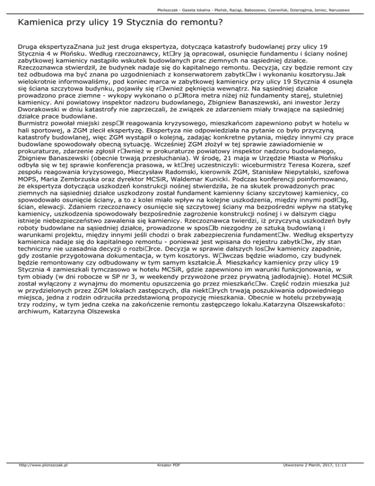 Płońszczak - Gazeta lokalna - Płońsk, Raciąż, Baboszewo, Czerwińsk, Dzierzążnia, Joniec, Naruszewo Kamienica przy ulicy 19 Stycznia do remontu? Druga ekspertyzaZnana już jest druga ekspertyza, dotycząca katastrofy budowlanej przy ulicy 19 Stycznia 4 w Płońsku. Według rzeczoznawcy, ktÃłry ją opracował, osunięcie fundamentu i ściany nośnej zabytkowej kamienicy nastąpiło wskutek budowlanych prac ziemnych na sąsiedniej działce. Rzeczoznawca stwierdził, że budynek nadaje się do kapitalnego remontu. Decyzja, czy będzie remont czy też odbudowa ma być znana po uzgodnieniach z konserwatorem zabytkÃłw i wykonaniu kosztorysu.Jak wielokrotnie informowaliśmy, pod koniec marca w zabytkowej kamienicy przy ulicy 19 Stycznia 4 osunęła się ściana szczytowa budynku, pojawiły się rÃłwnież pęknięcia wewnątrz. Na sąsiedniej działce prowadzono prace ziemne - wykopy wykonano o pÃłłtora metra niżej niż fundamenty starej, stuletniej kamienicy. Ani powiatowy inspektor nadzoru budowlanego, Zbigniew Banaszewski, ani inwestor Jerzy Dworakowski w dniu katastrofy nie zaprzeczali, że związek ze zdarzeniem miały trwające na sąsiedniej działce prace budowlane. Burmistrz powołał miejski zespÃłł reagowania kryzysowego, mieszkańcom zapewniono pobyt w hotelu w hali sportowej, a ZGM zlecił ekspertyzę. Ekspertyza nie odpowiedziała na pytanie co było przyczyną katastrofy budowlanej, więc ZGM wystąpił o kolejną, zadając konkretne pytania, między innymi czy prace budowlane spowodowały obecną sytuację. Wcześniej ZGM złożył w tej sprawie zawiadomienie w prokuraturze, zdarzenie zgłosił rÃłwnież w prokuraturze powiatowy inspektor nadzoru budowlanego, Zbigniew Banaszewski (obecnie trwają przesłuchania). W środę, 21 maja w Urzędzie Miasta w Płońsku odbyła się w tej sprawie konferencja prasowa, w ktÃłrej uczestniczyli: wiceburmistrz Teresa Kozera, szef zespołu reagowania kryzysowego, Mieczysław Radomski, kierownik ZGM, Stanisław Niepytalski, szefowa MOPS, Maria Zembrzuska oraz dyrektor MCSiR, Waldemar Kunicki. Podczas konferencji poinformowano, że ekspertyza dotycząca uszkodzeń konstrukcji nośnej stwierdziła, że na skutek prowadzonych prac ziemnych na sąsiedniej działce uszkodzony został fundament kamienny ściany szczytowej kamienicy, co spowodowało osunięcie ściany, a to z kolei miało wpływ na kolejne uszkodzenia, między innymi podłÃłg, ścian, elewacji. Zdaniem rzeczoznawcy osunięcie się szczytowej ściany ma bezpośredni wpływ na statykę kamienicy, uszkodzenia spowodowały bezpośrednie zagrożenie konstrukcji nośnej i w dalszym ciągu istnieje niebezpieczeństwo zawalenia się kamienicy. Rzeczoznawca twierdzi, iż przyczyną uszkodzeń były roboty budowlane na sąsiedniej działce, prowadzone w sposÃłb niezgodny ze sztuką budowlaną i warunkami projektu, między innymi jeśli chodzi o brak zabezpieczenia fundamentÃłw. Według ekspertyzy kamienica nadaje się do kapitalnego remontu - ponieważ jest wpisana do rejestru zabytkÃłw, zły stan techniczny nie uzasadnia decyzji o rozbiÃłrce. Decyzja w sprawie dalszych losÃłw kamienicy zapadnie, gdy zostanie przygotowana dokumentacja, w tym kosztorys. WÃłwczas będzie wiadomo, czy budynek będzie remontowany czy odbudowany w tym samym kształcie. Mieszkańcy kamienicy przy ulicy 19 Stycznia 4 zamieszkali tymczasowo w hotelu MCSiR, gdzie zapewniono im warunki funkcjonowania, w tym obiady (w dni robocze w SP nr 3, w weekendy przywożone przez prywatną jadłodajnię). Hotel MCSiR został wyłączony z wynajmu do momentu opuszczenia go przez mieszkańcÃłw. Część rodzin mieszka już w przydzielonych przez ZGM lokalach zastępczych, dla niektÃłrych trwają poszukiwania odpowiedniego miejsca, jedna z rodzin odrzuciła przedstawioną propozycję mieszkania. Obecnie w hotelu przebywają trzy rodziny, w tym jedna czeka na zakończenie remontu zastępczego lokalu.Katarzyna Olszewskafoto: archiwum, Katarzyna Olszewska http://www.plonszczak.pl Kreator PDF Utworzono 2 March, 2017, 11:13