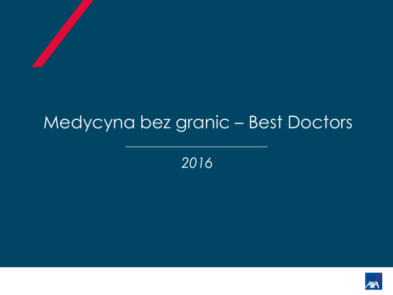 Medycyna bez granic – Best Doctors 2016 Medycyna bez granic – Best Doctors Gdy pojawia się choroba, zaczynają się pojawiać bardzo ważne pytania … Czy diagnoza jest prawidłowa? Gdzie można otrzymać najlepsze leczenie? Skąd wziąć na nie pieniądze? 2 | Medycyna bez granic – Best Doctors Czy pytania i wątpliwości są uzasadnione? Przez ekspertów Best Doctors modyfikowanych jest: Czy diagnoza jest prawidłowa? 37% diagnoz medycznych 75% procesów leczenia* To oznacza, że więcej niż co trzecia diagnoza jest nietrafiona Ponad 2/3 procesów leczenia nie jest optymalnych Warto upewnić się, że diagnoza jest prawidłowa, a proces leczenia optymalny ! Best Doctors - międzynarodowa instytucja założona w 1989 r. przez lekarzy Harvard Medical School 30 milionów klientów na całym świecie Współpracuje z 53 000 lekarzy i ekspertów w ponad 450 specjalizacjach * Best Doctors 2012 dane amerykańskie; zgodne z ustaleniami The American Journal of Medicine, The Journal of American Medical Association i wielu innych publikacji naukowych. Dane chirurgiczne z amerykańskiego Narodowego Instytutu Zdrowia 3 | Medycyna bez granic – Best Doctors Statystyki z Polski Gdzie można otrzymać najlepsze leczenie? • • • Rak i problemy krążeniowe są przyczyną 55%- 60% wszystkich zgonów w Polsce. Wskaźnik przeżywalności po leczeniu raka w Polsce niższy niż w EU &U.S.: • Polska 30%; EU 45%; USA 60% 20% Polaków poddaje się leczeniu we wczesnym stadium raka w porównaniu do 80% w U.S. źródło: http://www.ncbi.nlm.nih.gov/pmc/articles/PMC2496940/ 4 | Medycyna bez granic – Best Doctors Czy pytania i wątpliwości są uzasadnione? Ile kosztuje leczenie za granicą? Skąd wziąć na nie pieniądze? Średnie koszty leczenia w Stanach Zjednoczonych*: Przeszczep szpiku kostnego € 210 000 – € 460 000 Wszczepienie by-pass € 96 000 Operacja zastawki serca € 100 000 Nowotwór € 100 000 * Best Doctors 2012 dane amerykańskie; zgodne z ustaleniami The American Journal of Medicine, The Journal of American Medical Association i wielu innych publikacji naukowych. Dane chirurgiczne z amerykańskiego Narodowego Instytutu Zdrowia 5 | Medycyna bez granic – Best Doctors Jak działa ubezpieczenie? Druga opinia medyczna Zapewniamy przygotowanie raportu zawierającego potwierdzenie diagnozy przez światowego eksperta oraz rekomendacje co do dalszego procesu leczenia Opieka medyczna za granicą Organizujemy i pokrywamy koszty procesu leczenia w wybranej zagranicznej placówce medycznej, organizujemy transport i zakwaterowanie Opieka ambulatoryjna w Polsce Po powrocie z zagranicy zapewniamy dostęp i pokrywamy koszty ambulatoryjnych świadczeń zdrowotnych na terenie Polski 6 | Medycyna bez granic – Best Doctors Sumy ubezpieczenia i limity 1 mln euro limit w ramach Opieki medycznej za granicą w ciągu roku obowiązywania ochrony ubezpieczeniowej 2 mln euro suma ubezpieczenia Opieki medycznej za granicą w ciągu całego okresu ubezpieczenia 50 tys. zł suma ubezpieczenia na korzystanie ze świadczeń ambulatoryjnych w Polsce „Mogę bez cienia wątpliwości powiedzieć, że zakup polisy Best Doctors, było moją najlepszą decyzją, dzięki której miałem dostęp do leczenia przez jednych z najlepszych lekarzy na świecie” Ubezpieczony 7 | Medycyna bez granic – Best Doctors Druga opinia medyczna Zespół Best Doctors, po zebraniu i przeanalizowaniu dokumentacji medycznej, wybiera lekarza eksperta odpowiedniego do poważnego stanu chorobowego Ubezpieczonego Lekarz ekspert przygotowuje raport zawierający: opinię na temat postawionej diagnozy i dotychczasowego leczenia propozycję dotyczącą dalszego postępowania i leczenia zalecanego odpowiedzi na pytania Ubezpieczonego dotyczące jego przypadku medycznego 8 | Medycyna bez granic – Best Doctors Opieka medyczna za granicą (1) Ubezpieczony dostaje do wyboru 1 z 3 placówek medycznych, które są w stanie podjąć się przeprowadzenia jego procesu leczenia. Po wybraniu jednej z nich, Best Doctors rozpoczyna organizację Opieki medycznej za granicą Organizacja i pokrycie kosztów leczenia pobytu w szpitalu przeprowadzenia operacji opieki po operacji badań diagnostycznych i laboratoryjnych opieki lekarskiej radioterapii, chemioterapii tłumacza, itp. Organizacja i pokrycie kosztów zakwaterowania zakwaterowania Ubezpieczonego wraz z osobą towarzyszącą dwuosobowy pokój 3- lub 4-gwiazdkowy Organizacja i pokrycie kosztów podróży lub transportu medycznego 9 | transportu z miejsca pobytu do lotniska lub dworca kolejowego biletu kolejowego lub lotniczego w klasie ekonomicznej do miasta docelowego leczenia i transportu do wskazanego hotelu transportu z hotelu lub szpitala do lotniska lub dworca kolejowego biletu kolejowy lub lotniczego w klasie ekonomicznej oraz transport do miejsca pobytu Medycyna bez granic – Best Doctors Opieka medyczna za granicą (2) Wypłata świadczenia pieniężnego za każdy dzień pobytu w szpitalu świadczenie wypłacane w przypadku pobytu w szpitalu za granicą 100 euro za dobę maksymalnie za 60 dni na jeden poważny stan chorobowy 50% świadczenia wypłacane jeszcze przed wyjazdem Zwrot kosztów poniesionych na zakup leków po powrocie na terytorium RP, które: 10 | zostały zlecone przez lekarza prowadzącego jako kontynuacja leczenia za granicą zostały przepisane przez lekarza pracującego w RP zostały przepisane na jednej recepcie w dawce pozwalającej na przyjmowanie leku przez okres nie dłuższy niż 2 miesiące Limit 50 000 euro Organizacja i pokrycie kosztów repatriacji zwłok repatriacja zwłok do miejsca pochówku na terytorium RP koszty repatriacji obejmują koszty trumny przewozowej i balsamowania zwłok oraz koszty transportu na terytorium RP Medycyna bez granic – Best Doctors Opieka ambulatoryjna w Polsce Świadczenia dostępne po powrocie z leczenia za granicą Szybki dostęp do specjalistycznych konsultacji lekarskich (m.in. onkologicznych, kardiologicznych, chir