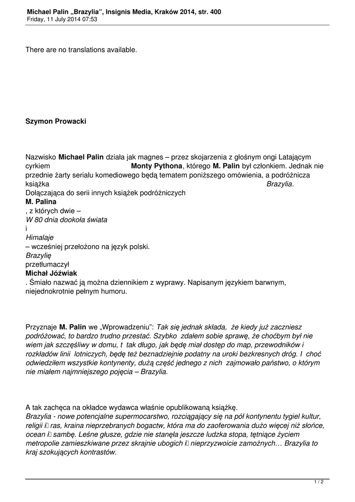 Michael Palin „Brazylia”, Insignis Media, Kraków