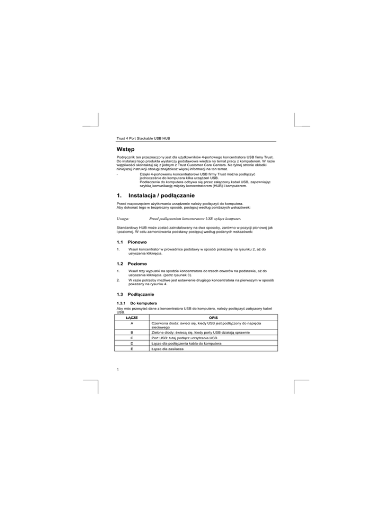 Trust 4 Port Stackable USB HUB Wstęp Podręcznik ten przeznaczony jest dla użytkowników 4-portowego koncentratora USB firmy Trust. Do instalacji tego produktu wystarczy podstawowa wiedza na temat pracy z komputerem. W razie wątpliwości skontaktuj się z jednym z Trust Customer Care Centers. Na tylnej stronie okładki niniejszej instrukcji obsługi znajdziesz więcej informacji na ten temat. Dzięki 4-portowemu koncentratorowi USB firmy Trust można podłączyć jednocześnie do komputera kilka urządzeń USB. Podłaczenie do komputera odbywa się przez załączony kabel USB, zapewniając szybką komunikację między koncentratorem (HUB) i komputerem. - 1. Instalacja / podłączanie Przed rozpoczęciem użytkowania urządzenie należy podłączyć do komputera. Aby dokonać tego w bezpieczny sposób, postępuj według poniższych wskazówek: Uwaga: Przed podłączeniem koncentratora USB wyłącz komputer. Standardowy HUB może zostać zainstalowany na dwa sposoby, zarówno w pozycji pionowej jak i poziomej. W celu zamontowania podstawy postępuj według podanych wskazówek: 1.1 Pionowo 1. Wsuń koncentrator w prowadnice podstawy w sposób pokazany na rysunku 2, aż do usłyszenia kliknięcia. 1.2 Poziomo 1. Wsuń trzy wypustki na spodzie koncentratora do trzech otworów na podstawie, aż do usłyszenia kliknięcia. (patrz rysunek 3). 2. W razie potrzeby możliwe jest ustawienie drugiego koncentratora na pierwszym w sposób pokazany na rysunku 4. 1.3 Podłączanie 1.3.1 Do komputera Aby móc przesyłać dane z koncentratora USB do komputera, należy podłączyć załączony kabel USB. ŁĄCZE A 1 OPIS Czerwona dioda: świeci się, kiedy USB jest podłączony do napięcia sieciowego B Zielone diody: świecą się, kiedy porty USB działają sprawnie C Port USB: tutaj podłącz urządzenia USB D Łącze dla podłączenia kabla do komputera E Łącze dla zasilacza Trust 4 Port Stackable USB HUB 1. Włóż okrągłą wtyczkę zasilacza do złącza C (patrz rysunek 1). 2. Podłącz wtyczkę zasilacza do gniazdka. 3. Podłącz kabel USB z 6-kątną wtyczką do złącza A koncentratora USB (patrz rysunek 1). 4. Podłącz drugi koniec kabla USB z płaską wtyczką do wolnego złącza USB komputera (patrz rysunek 5). 1.3.2 Do obecnie używanego koncentratora W razie potrzeby koncentrator USB może być podłączony do podłączonego wcześniej koncentratora. Pokazano to na rysunku 6. 1.4 Podłączanie sprzętu Użyj załączonego do produktu kabla w celu podłączenia urządzenia do koncentratora USB. Informacje na ten temat znajdziesz w instrukcji obsługi odnośnego urządzenia. Urządzenia należy podłączyć do jednego z czterech złącz USB na tylnej ściance koncentratora USB. 1.5 Instalacja w Windows Kiedy uruchomisz Windows po podłączeniu koncentratora USB, Windows wykryje nowy sprzęt (Koncentrator USB ogólnego zastosowania). Sterownik dla tego urządzenia zostanie zainstalowany automatycznie. Po podłączeniu napięcia zaświeci się czerwona dioda, natomiast cztery zielone diody zaświecą się dla zasygnalizowania, że porty USB koncentratora są sprawne. Nie zaświecenie się jednej lub kilku zielonych diod oznacza, że odnośny port USB prawdopodonie jest uszkodzony. 2 PL Trust 4 Port Stackable USB HUB 2. Rozwiązywanie problemów Problem Przyczyna Możliwe rozwiązanie Nowy sprzęt nie zostaje znaleziony. Brak zasilania koncentratora USB. Podłącz zasilacz do koncentratora USB. Kabel USB nie został poprawnie podłączony. Podłącz prawidłowo kabel USB pomiędzy urządzeniem i koncentratorem. Podłącz prawidłowo kabel USB pomiędzy komputerem i koncentratorem. 'Koncentrator USB ogólnego zastosowania' nie zostaje znaleziony. Kabel USB nie został poprawnie podłączony. Podłącz prawidłowo kabel USB pomiędzy komputerem i koncentratorem. Brak zasilania koncentratora USB. Podłącz zasilacz do koncentratora USB. Nie zainstalowano obsługi USB (Windows 95). Zainstaluj obsługę USB. (Można ją znaleźć na płycie CD-ROM Windows lub w Internecie.) Podłączone urządzenie USB nie działa. Zbyt duża utrata sygnału spowodowana nieprawidłowym podłączeniem koncentratorów. Podłącz koncenrator (HUB) w sposób pokazany na rysunku 6. Czerwona i zielona dioda nie świecą się. Brak zasilania koncentratora USB. Podłącz zasilacz do koncentratora USB. Kabel USB nie został poprawnie podłączony. Podłącz prawidłowo kabel USB pomiędzy komputerem i koncentratorem. Uszkodzony port USB. Jeżeli nastąpiło to w okresie gwarancyjnym, skontaktuj się ze sprzedawcą sprzętu. Jedna lub kilka zielonych diod nie świeci się. Na stronie internetowej (www.trust.com) znajdziesz odpowiedzi na najczęściej zadawane pytania (FAQ). Rejestrując już teraz swój zakup na stronie internetowej firmy Trust www.trust.com uzyskasz optymalne wsparcie gwarancyjne i serwisowe. Ponadto będziesz automatycznie informowany o wszelkich zmianach odnośnie tego i innych produktów firmy Trust. Można też wygrać jedną ze wspaniałych nagród. Więcej informacji na temat USB znaleźć można na stronie internetowej www.usb.org. Jeśli żadne z proponowanych rozwiązań nie pomogło w usunięciu problemu Twojego produktu, skontaktuj się z jednym z Trust Customer Care Centres. Na tylnej stronie okładki niniejszej instrukcji obsługi znajdziesz więcej informacji na ten temat. Zawsze powinieneś przygotować następujące dane: • Numer produktu; jest to: 12276 / 12277; • Dane dotyczące sprzętu; • Dokładny opis problemu; • Dokładny opis sytuacji, w których pojawia się problem. 3 Trust 4 Port Stackable USB HUB 3. Dane techniczne Upstream 1 port typu B Downstream 4 porty typu A Prędkość przesyłania sekwencji wideo Do 12 MB/s Dioda kontrolna 1 dioda (czerwona) dla napięcia Ochrona przeciwprzepięciowa Na każdym porcie 4 diody (zielone) dla napięcia na portach typu A Napięcie wyjściowe i zasilanie Maksymalnie 5V DC / 500mA na każdym wyjściu Zasilacz 5 V DC / 2,69A PL 4