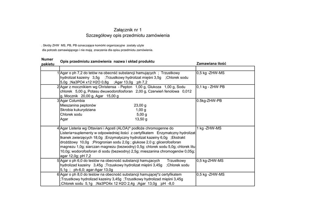 Załącznik nr 1 Szczegółowy opis przedmiotu zamówienia . Skróty ZHW MS, PB, PB oznaczające komórki organizacyjne zostały uŜyte dla potrzeb zamawiającego i nie mają znaczenia dla opisu przedmiotu zamówienia. Numer pakietu Opis przedmiotu zamówienia nazwa i skład produktu 1 Agar o ph 7,2 do tetów na obecnść substancji hamujących ; Trzustkowy hydrolizat kazeiny 3,5g ;Trzustkowy hydrolizat mięśni 3,5g ;Chlorek sodu 5,0g ;Na3PO4 x12 H2O 0,8g ;Agar 13,0g ;ph 7,2 2 Agar z mocznikiem wg Christensa - Pepton 1,00 g, Glukoza 1,00 g, Sodu chlorek 5,00 g, Potasu dwuwodorofosforan 2,00 g, Czerwień fenolowa 0,012 g, Mocznik 20,00 g, Agar 15,00 g 3 Agar Columbia Mieszanina peptonów 23,00 g Skrobia kukurydziana 1,00 g Chlorek sodu 5,00 g Agar 13,50 g Zamawiana ilość 0,5 kg -ZHW-MS 0,1 kg - ZHW PB 0.5kg-ZHW-PB 4 Agar Listeria wg Ottaviani i Agosti (ALOA)^ podłoŜe chromogenne do 1 kg -ZHW-MS Listeria+suplementy w odpowiedniej ilości z certyfikatem Enzymatczny hydrolizat tkanek zwierzęcych 18,0g ;Enzymatyczny hydrolizat kazeiny 6,0g ;Ekstrakt droŜdŜowy 10,0g ;Pirogronian sodu 2,0g ; glukose 2,0 g; glicerofosforan magnezu 1,0g; siarczan magnezu (bezwodny) 0,5g; chlorek sodu 5,0g; chlorek litu 10,0g; wodorofosforan di sodu (bezwodny) 2,5g; mieszanina chromogenów 0,05g; agar 12,0g; pH 7,2 5 Agar o ph 6,0 do testów na obecność substancji hamujacych Trzustkowy 0,5 kg-ZHW-MS hydrolizad kazeiny 3,45g ;Trzuskowy hydrolizat mięśni 3,45g ;Chlorek sodu 5,1g ; ph-6,0; agar-Agar 13,0g 6 Agar o ph 8,0 do testow na obecność substancji hamującej^z certyfikatem 0,5 kg -ZHW-MS ;Trzustkowy hydrolizad kazeiny 3,45g ;Trzustkowy hydrolizad mięśni 3,45g ;Chlorek sodu 5,1g ;Na3PO4x 12 H2O 2,4g ;Agar 13,0g ;pH -8,0 7 Agar odŜywczy do Enterobakteriaceae Ekstrakt mięsny 3,0g ;Enzymatyczny hydrolizat tkanek zwierzęcych 5,0g ;Chlorek sodu 5,0g ; Agar 9-18g wg:PNISO 21528-2:2005 poz.5.2.2 8 Agar odŜywczy do Salmonelli (AJ ) 9 Agar odŜywczy Standard II ^z certyfikatem: pepton mięsny 3,45g, pepton kazeinowy 3,45g, chlorek sodu 5,1g, agar 13g 10 Agar Sabouraud z chloramfenicolem op. a 500 g sklad Mieszanina peptonów 10,00 g, Glukoza 40,00 g, Chloramfenikol 0,50 g, Agar 15,00 g. Granulat. 11 Agar trójcukrowy z Ŝelazem (TSI)^ z certyfikatem: ekstrakt mięsny 3,0g, ekstrakt droŜdŜowy 3,0g, pepton 20,0g, chlorek sodu 5,0g, laktoza 10,0g, sacharoza 10,0g, glukoza1,0g, cytrynian Ŝelaza (III) 0,3g, tiosiarczan sodu 0,3g, czerwień fenolowa 0,024g, agar 12,0 g 12 Agar TSYEA ^ z certyfikatem: enzymatyczny hydrolizat kazein 17g, enzymatyczny hydrolizat mąki sojowej 3g, chlorek sodu 5g, wodoroortofosforan dipotasu (K2HPO4) 2,5g, D-glukoza 2,5g, ekstrakt droŜdŜowy 6,0g, agar 9,0 do 18,0g wg normy PN-EN-ISO 11290-2:2003 13 Agar wzbogacony a'500g Pepton 5,0g Ekstrakt mięsny 1,0g Ekstrakt droŜdŜowy 2,0g Chlorek sodu 5,0 g Agar 15,0 g 14 Agar z fioletem krystalicznym, czerwienią obojętną ,Ŝółcią i glukozą (VRBG)opak.500 Pepton mięsny 7,00 g Ekstrakt droŜdŜowy 3,00 g Sole Ŝółci nr 3 1,50 g Glukoza 10,00 g Sodu chlorek 5,00 g Czerwień obojętna 0,03 g Fiolet krystaliczny 0,002 g Agar 12,00 g 0,5 kg - ZHW MS 0,5 kg-ZHW-MS 0,5 kg -ZHW-MS 0,5 kg -ZHW-PB 0,5 kg - ZHW -PB 0,5 kg - ZHW -MSP 0,5 kg ZHW-PB 1 kg - ZHW-MS -0,5 kg, PB 0,5 kg 15 Agar z ksylozą, lizyną i dezoksycholanem (XLD) Ekstrakt drozdŜowy 3,0g 2,5 kg-ZHW-PB 1,5 kg, MS 1 kg ;Chlorek sodu 5,0g ;Ksyloza 3,75g ;Laktoza 7,5g ;Sacharoza 7,5g ; Chlorowodorek L-Lizyny 5,0g ;Tiosiarczan sodu 6,8g ;Cytrynian Ŝelazowoamonowy(III) 0,8g ;czerwień fenolowa 0,08g ;Dezoksycholan sodu 1,0g ;Agar od 9 do 18g ;wg:PN-EN ISO 6579 :2003 poz.B.4 op a 500 g 16 Agar z siarczynem (IV) i cykloseryną. 0,5 kg - ZHW PB Tryptose 15,00 g Pepton sojowy 5,00 g Ekstrakt droŜdŜowy 5,00 g Disiarczan(IV) disodu bezwodny 1,00 g Cytrynian Ŝelaza(III) i amonu 1,00 g Agar 19,00 g Cykloseryna 1 op a 10 fiolek. 17 Agar z zieloną brylantową i czerwienią fenolową(BGA)^a'500g Wyciąg mięsny 2,5 kg-ZHW-PB -1,5 kg, MS 1 kg 5,0g ;Ekstrakt droŜdŜowy 3,0g ;Pepton 10,0g ;Wodorofosforan disodowy 1,0g ;Diwodorofosforan sodowy 0,6g ;Laktoza 10,0g ;Sacharoza 10,0g ;Czerwień fenolowa 0,09g ;Zieleń brylantowa 0,0047g ;Agar 12,0g 18 API Listeria 19 API NaCL 0,85 %Medium 5 ml 20 API Suspension Medium 5 ml 21 Baccilus Subtilus BGA Spore Suspension - zaiwesina przetrwalników Bac Subtilus BGA 1 op a 15 ampułek po 2 ml 22 Bulion Giolitti - Cantoni skład ? Enzymatyczny hydrolizat kazeiny 10g; ekstrakt droŜdŜowy 5g; ekstrakt wołowy 5g; chlorek litu 5g; glicyna 1,2g; mannitol 20g; chlorek sodu 5g; pirogronian sodu 3g; tween 80 1g; 23 Bulion mózgowo-sercowy(BHI) Enzymatyczny hydrolizat tkanek zwierząt 10,0g ;Suchy wyciąg z mózgu cielęcego 12,5g ;Suchy wyciąg z serc wołowych 5,0g ;Glukoza 2,0g ;Chlorek sodu 5,0g ;Na2HPO4 2,5g Wg:PN-EN ISO 6888-1:2001 poz.5.4.1 24 1. Bulion wzbogacony dla Listeria wg Frazera; pepton mięsny 5,0g; trypton 5,0g; ekstrakt wołowy 5,0g; ekstrakt droŜdŜowy 5,0g; chlorek sodu 20,0g; Di-Sodium Hydrogen Phosphate 12,0g; Potassium Di-Hydrogen Phosphate 1,35g; eskulina 1,0g; chlorek litu 3,0g 1 op - ZHW 1 op - ZHW 1 op - ZHW 1 op - ZHW PB PB PB PB 0,5 kg - ZHW MS 0,5 kg - ZHW MS 0,5 kg - ZHW MS 2.suplement do bulionu wzbogaconego Listeria wg Frazera 1 op ZHW MS 3.suplement Half Frazera dla 225 ml podstawy 5 op 25 Delvotest SPNTpodłoŜe do oznaczania antybiotykow w mleku 26 Genbag CO2 - zestaw do wytawarzania środowiska o podwyŜszonym stęŜęniu dwutlenku węgla ( torebki i generator ) 27 Mleko odtluszczone w proszku wolne od substancji hamujących 28 Paski do kontroli autoklawu TST Browne Control 29 Płytki odciskowe Rodac (Ogólna liczba drobnoustojów) z neutralizatorami ( z lecytyną , pilisorbianem 80, histydyną, tiosiarczanem, średnica 55 mm^z certyfikatem 30 Płytki odciskowe Rodac (Pleśni i DroŜdŜe ) z neutralizatorami ( z lecytyną , pilisorbianem 80, histydyną, tiosiarczanem, średnica 55 mm^z certyfikatem 31 PodłoŜe 